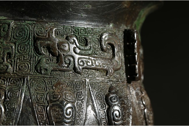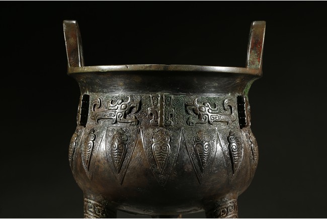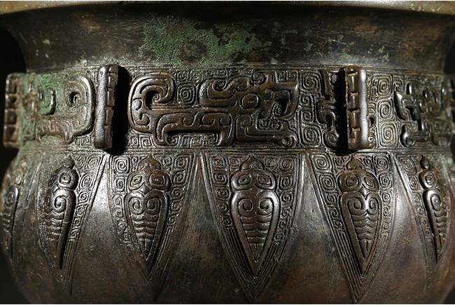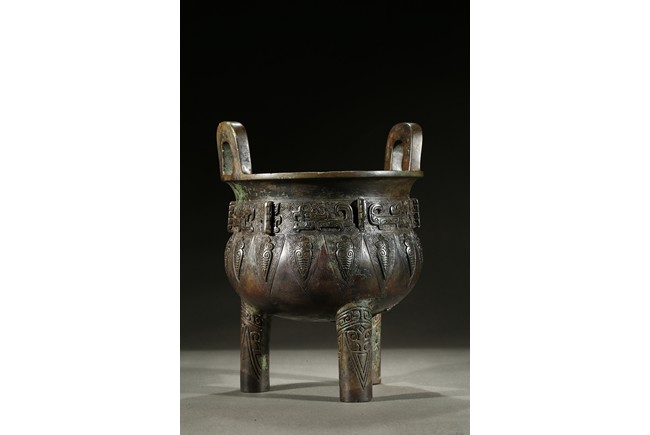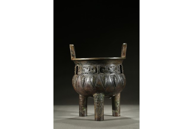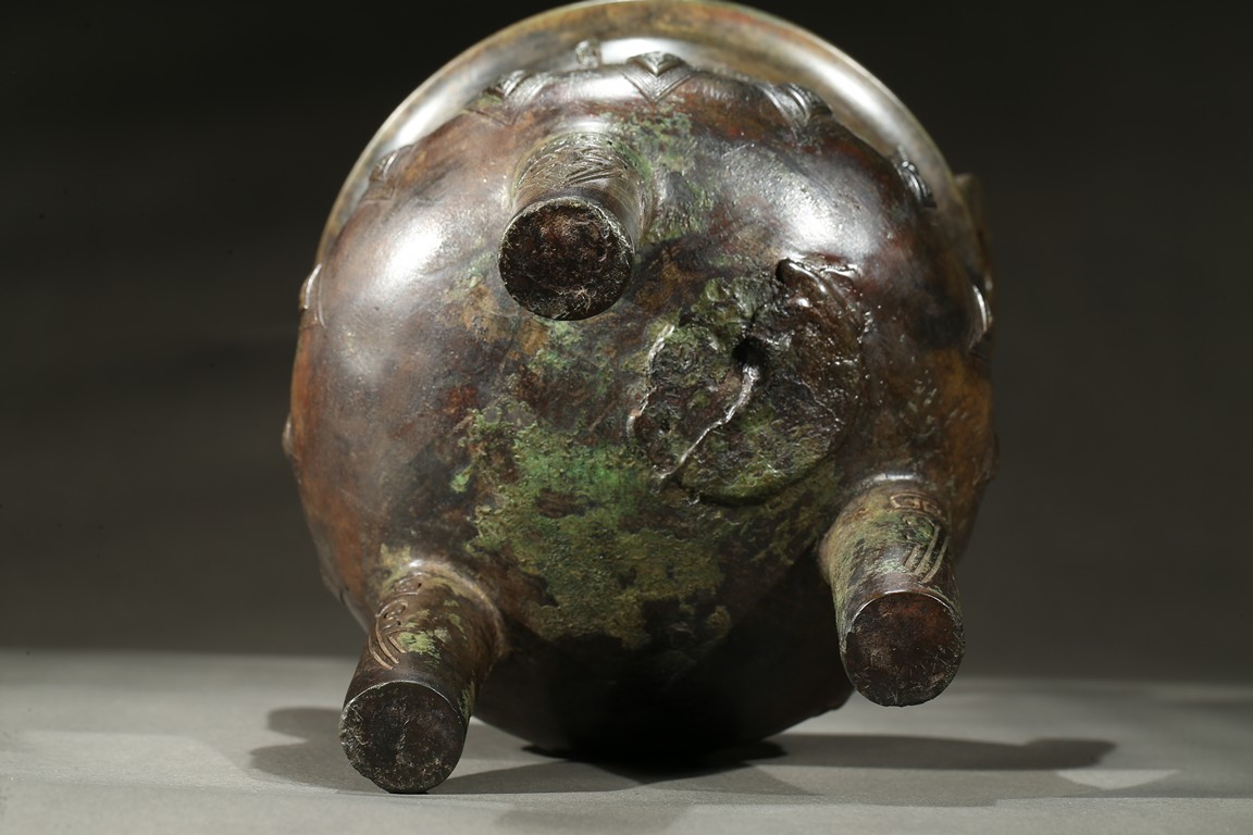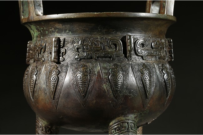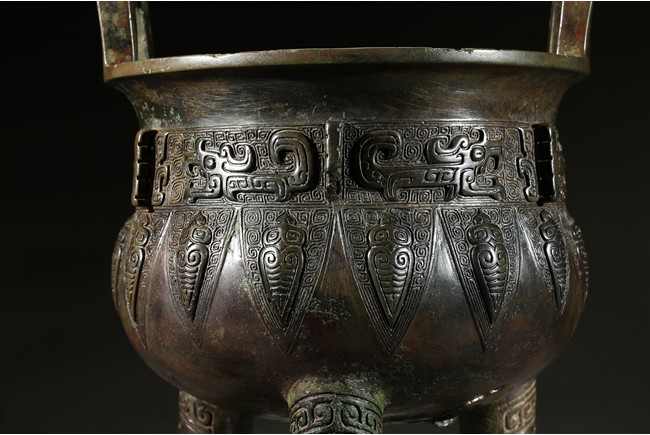 The tripod ritual vessel elaborately cast in relief with cicada-shape patterns below a band of stylized mythical beasts separated by notched flanges, the mouth rim with a pair of handles, all supported on three decorated round feet, the interior cast with pictograms, overall with malachite encrustation and patina. Late Shang Dynasty period.