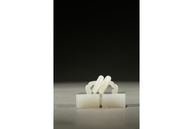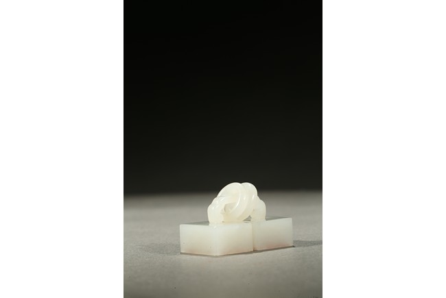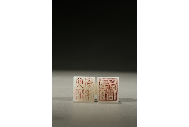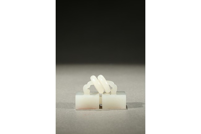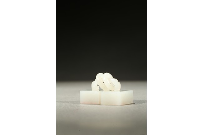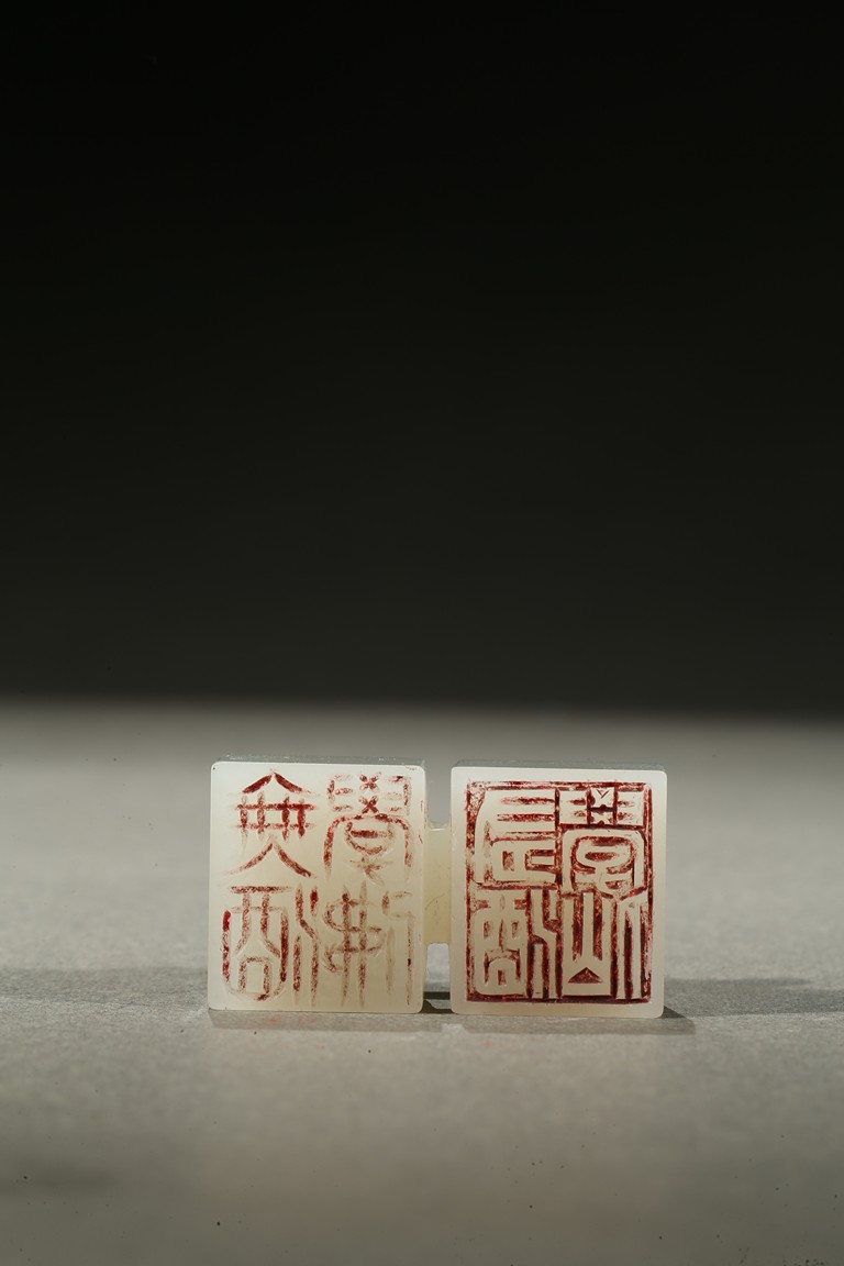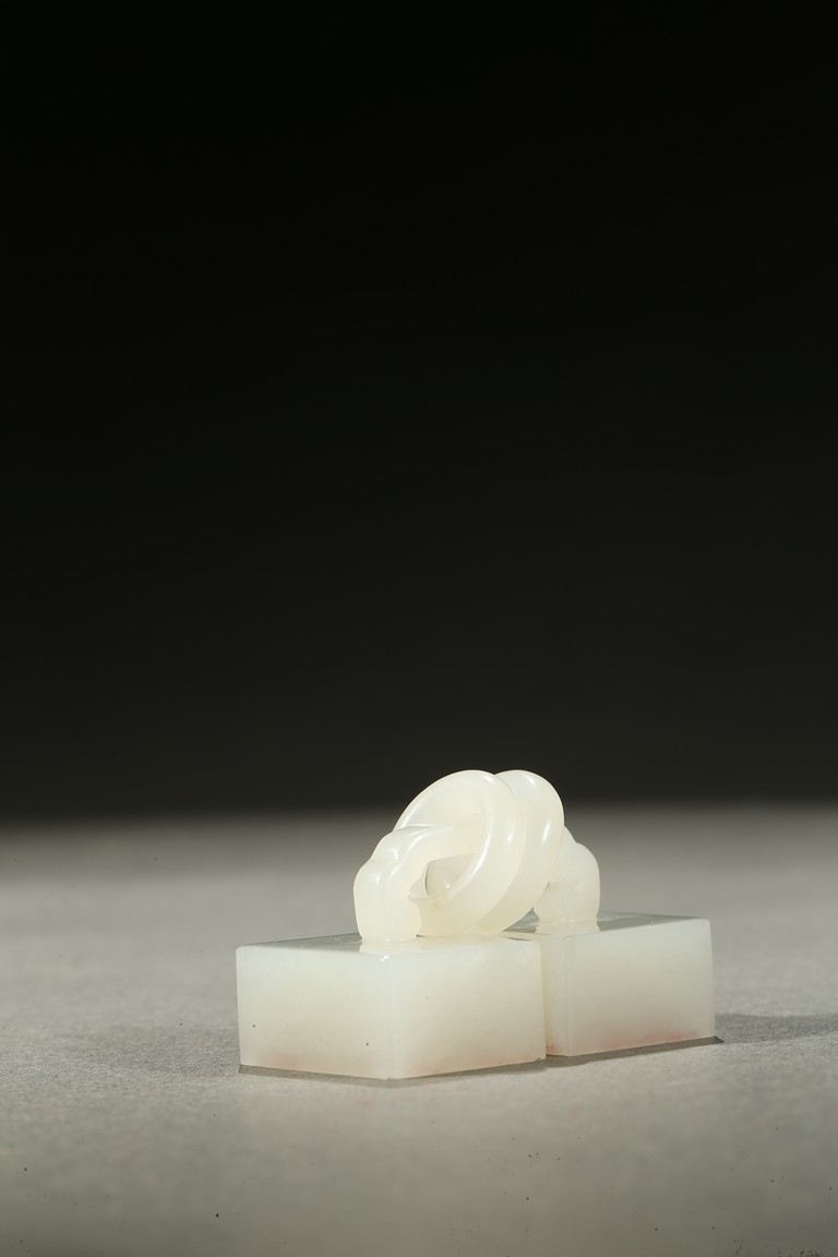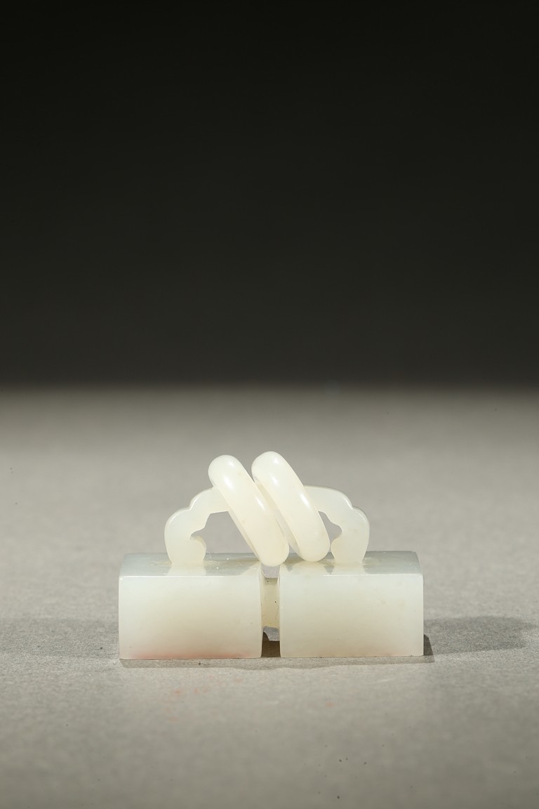 Carved as two square white jade seals joined together with two loose rings, the seal surface carved. Qing Dynasty period.