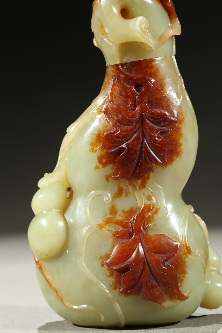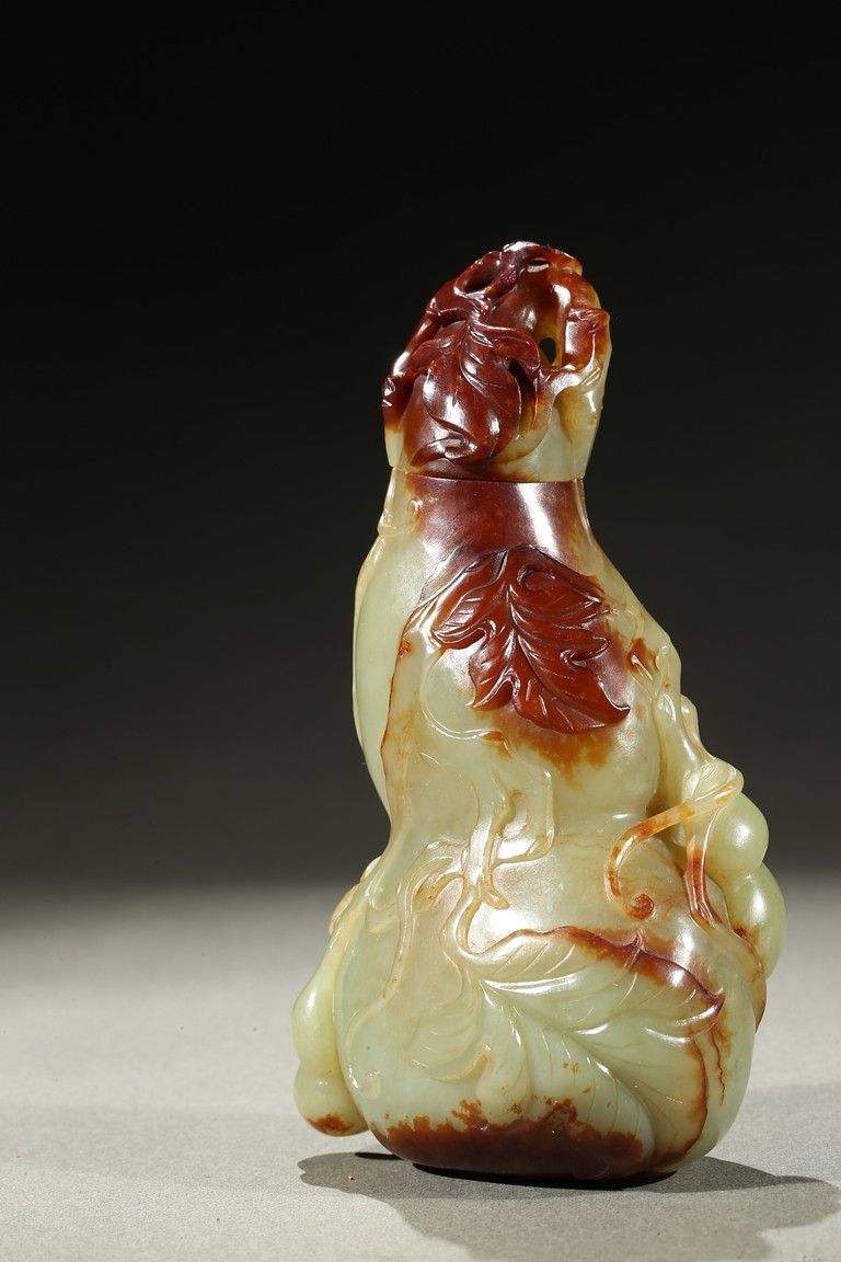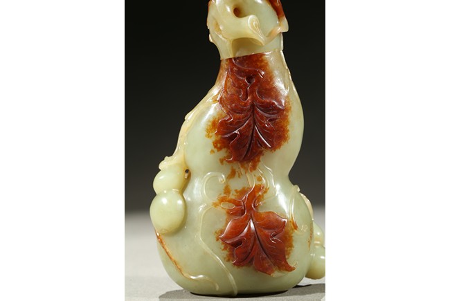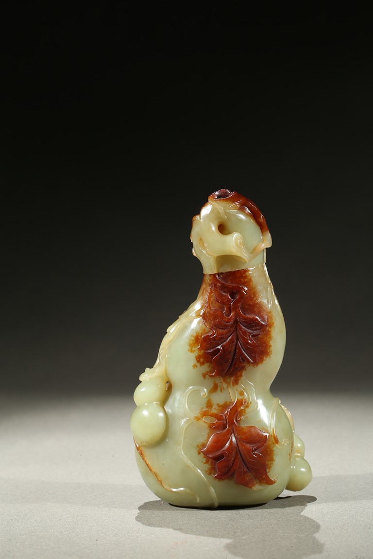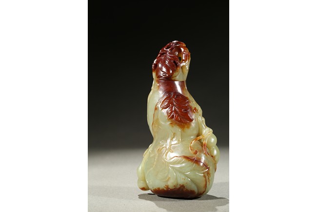 Carved in the form of a double gourd, body carved with leafy double gourds and branches in relief, the stone with russet skin. Qing Dynasty period.