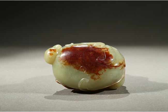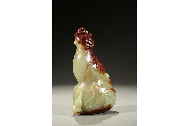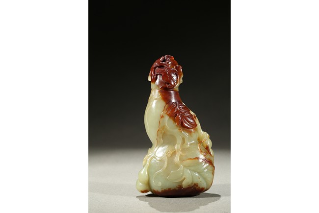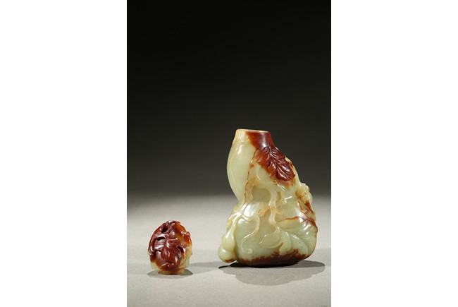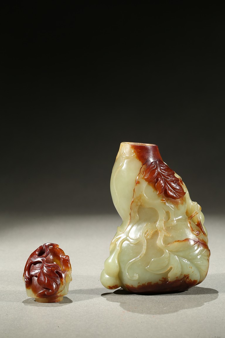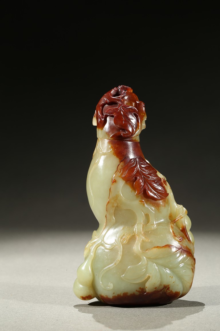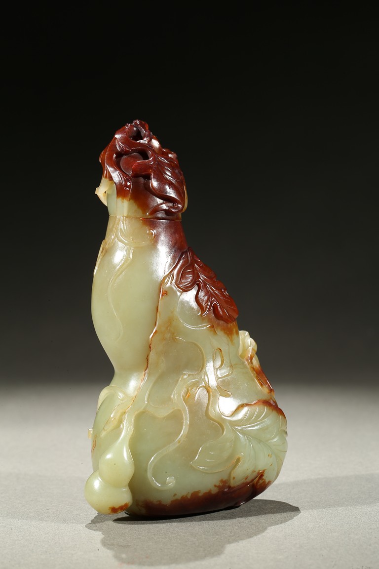 Carved in the form of a double gourd, body carved with leafy double gourds and branches in relief, the stone with russet skin. Qing Dynasty period.