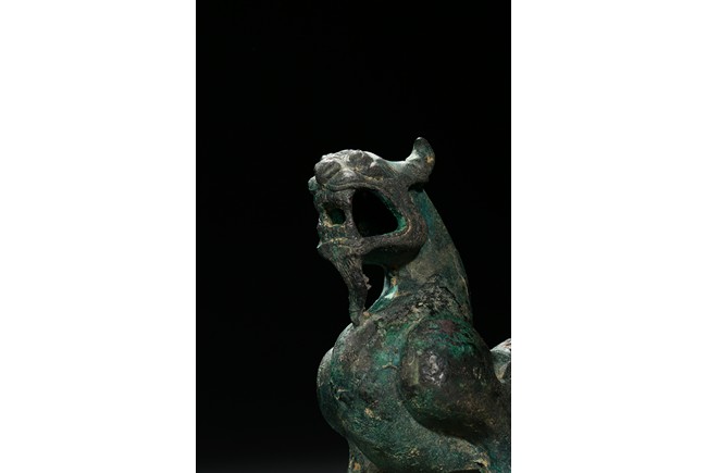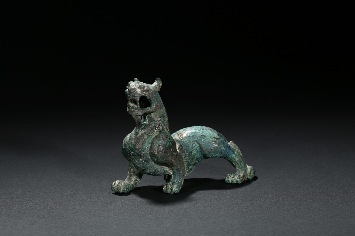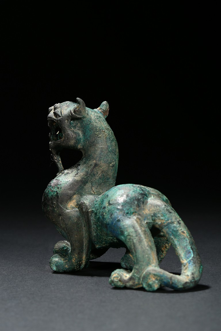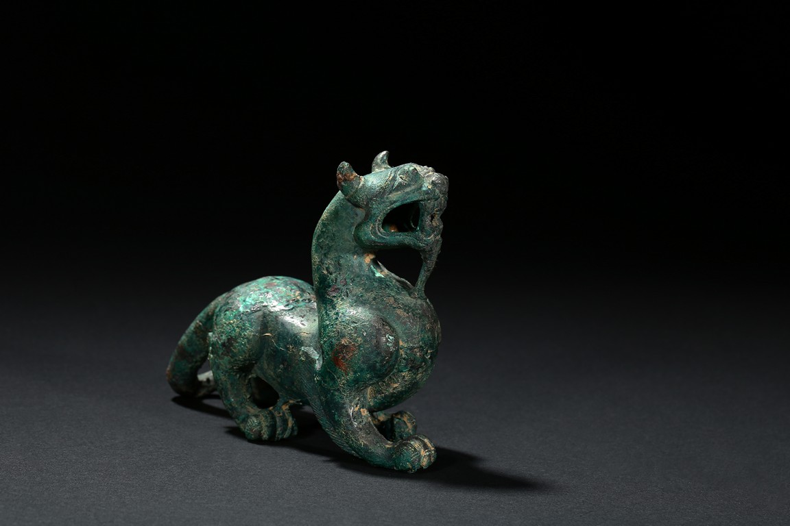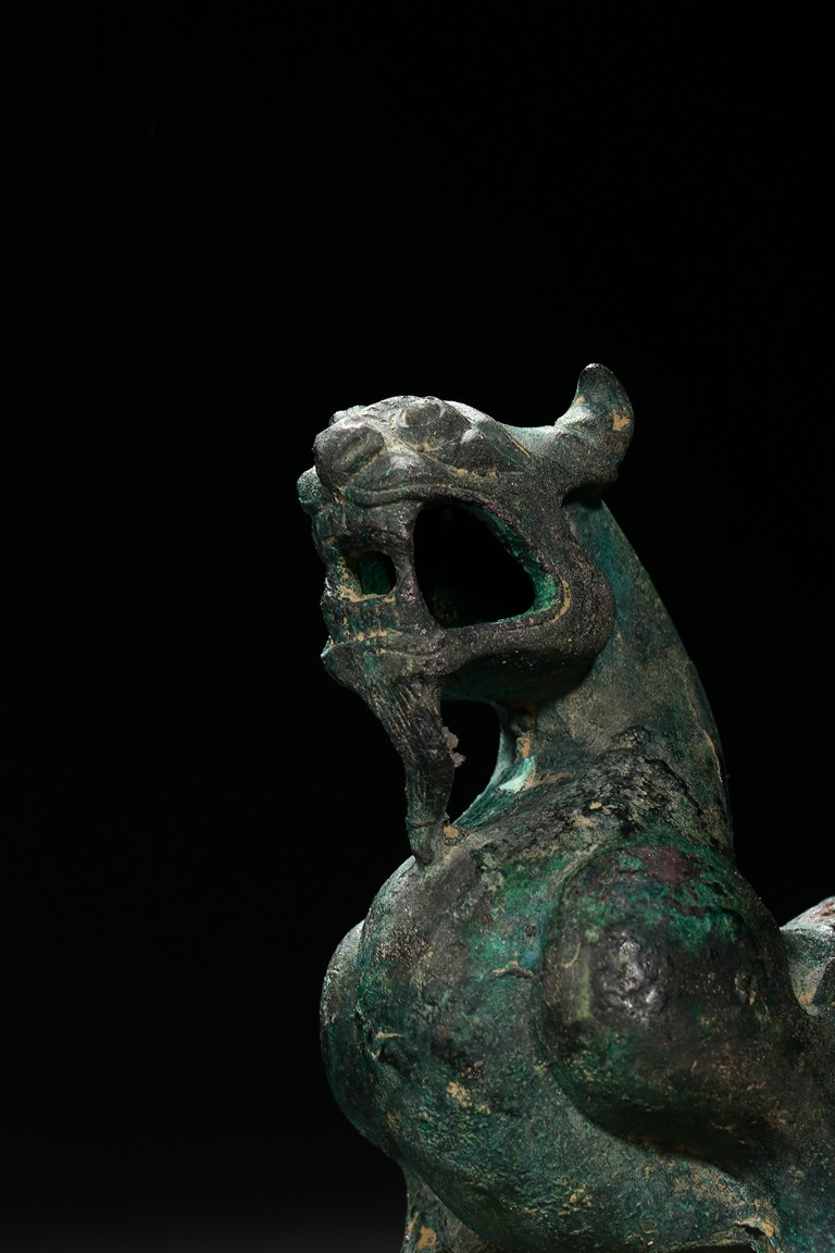 The mythical beast is shown crouched in an attacking stance standing on four sharply clawed feet. Its powerful head its ferocious teeth and bulging eyes, the bronze with extensive green patina and encrustation.