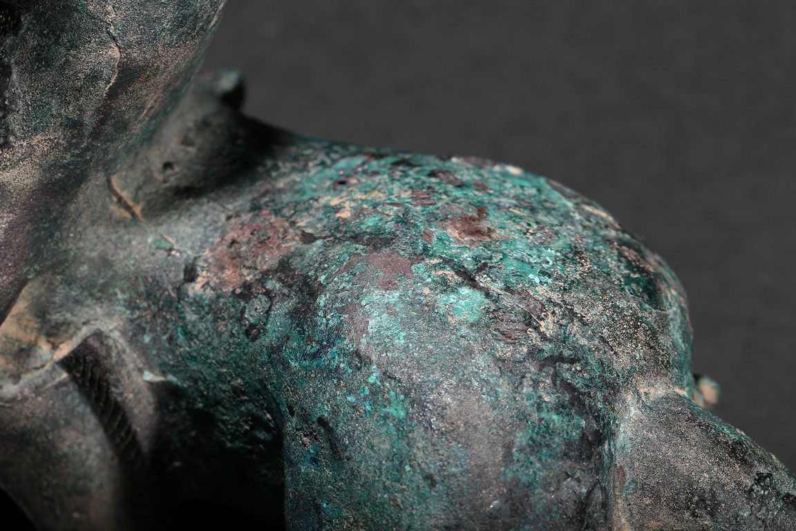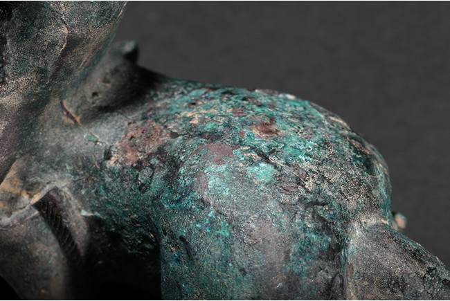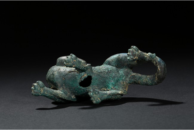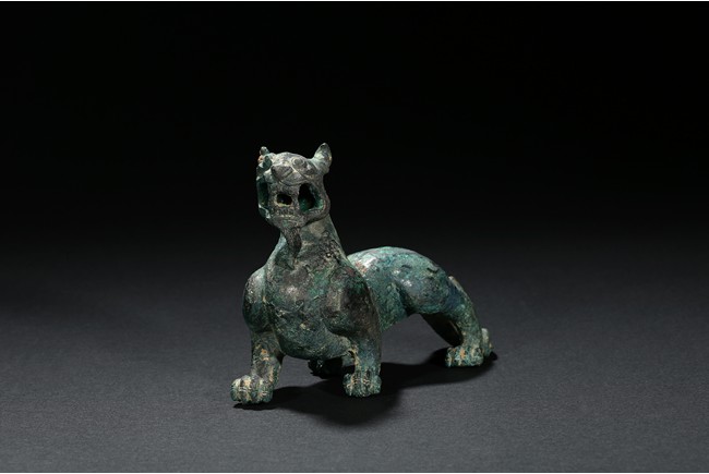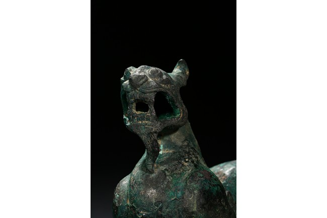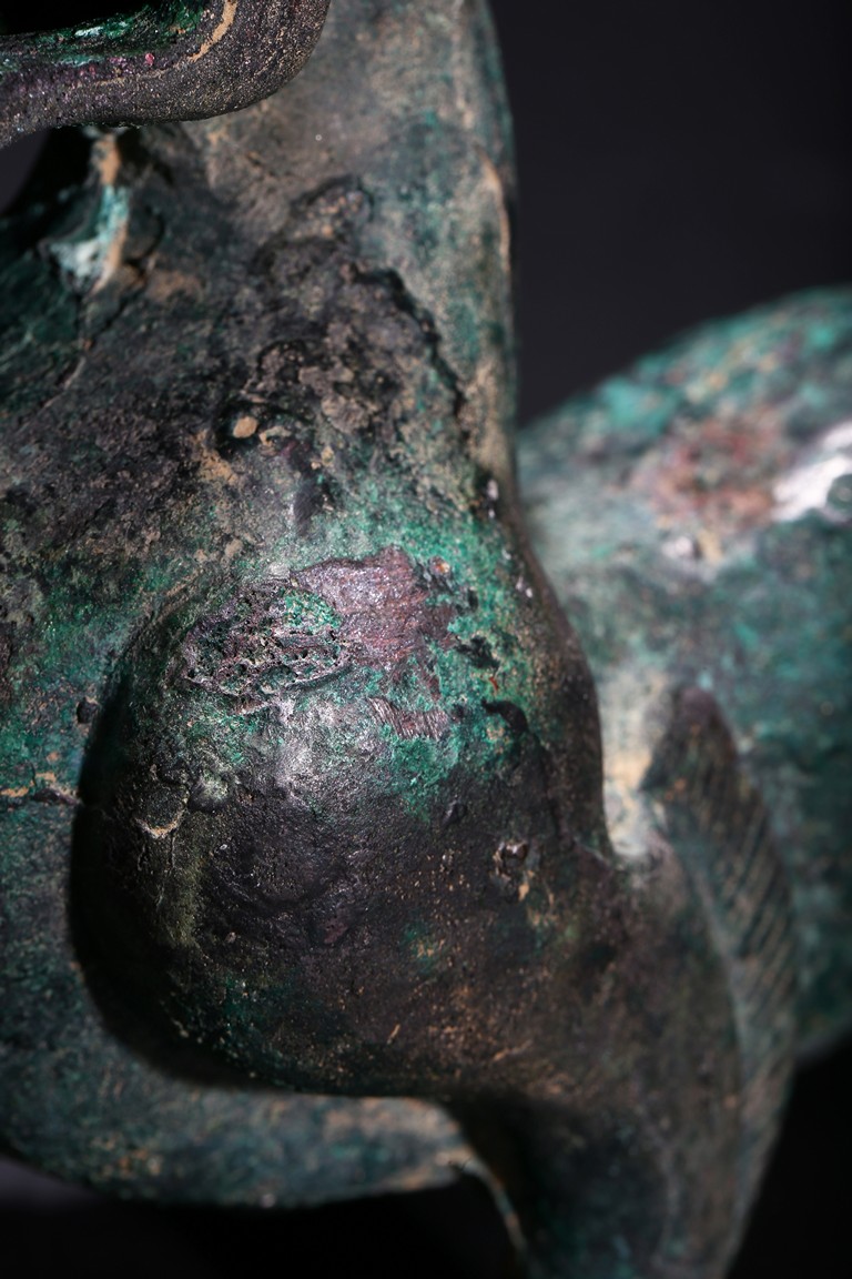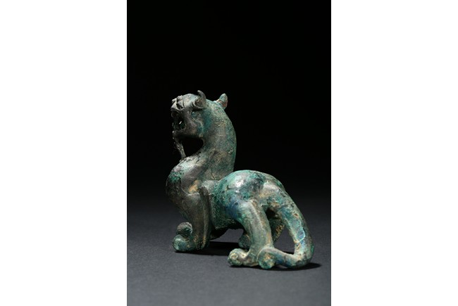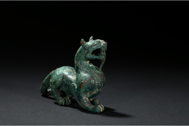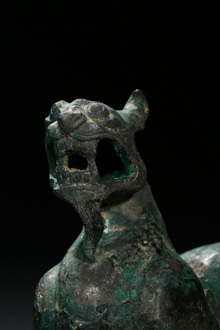 The mythical beast is shown crouched in an attacking stance standing on four sharply clawed feet. Its powerful head its ferocious teeth and bulging eyes, the bronze with extensive green patina and encrustation.