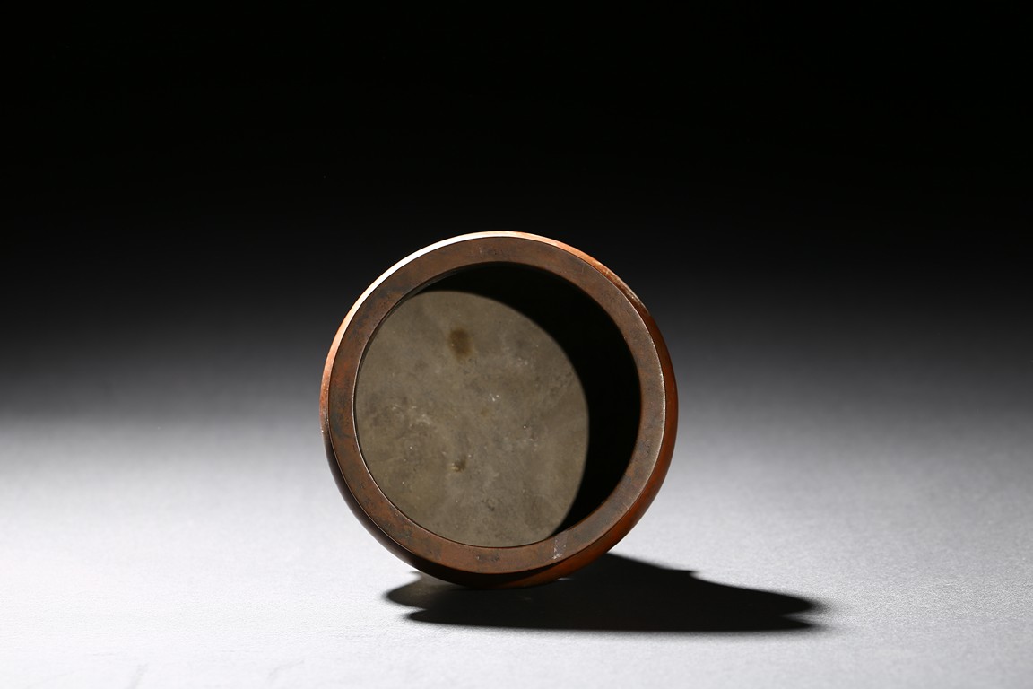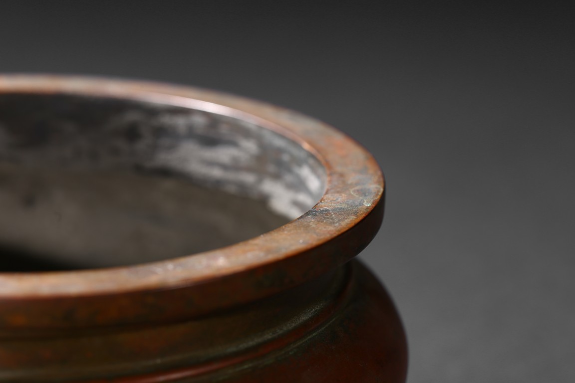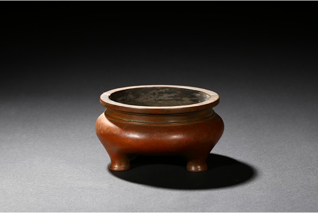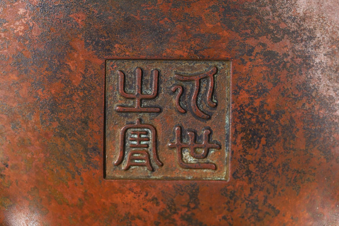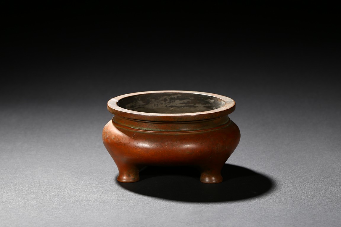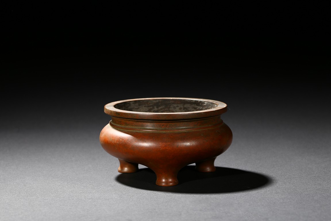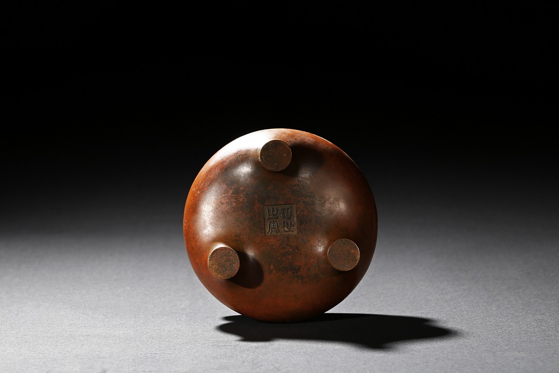 Of compressed globular form and raised on three feet, the base with a four character Yong shi zhi bao mark. Qing Dynasty period.