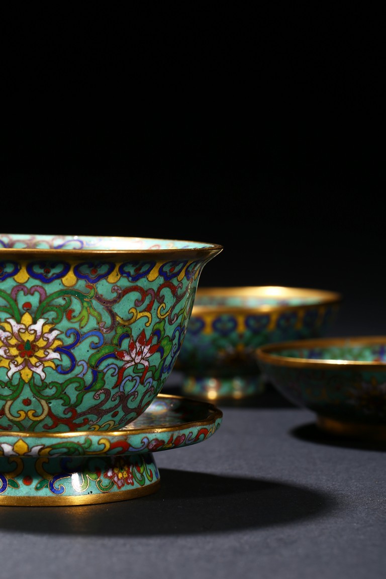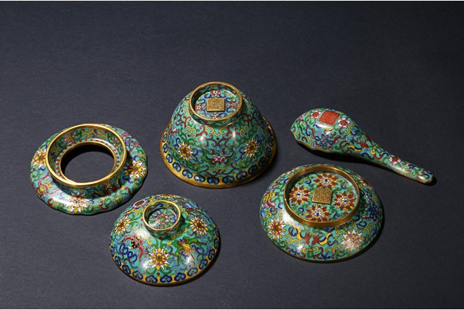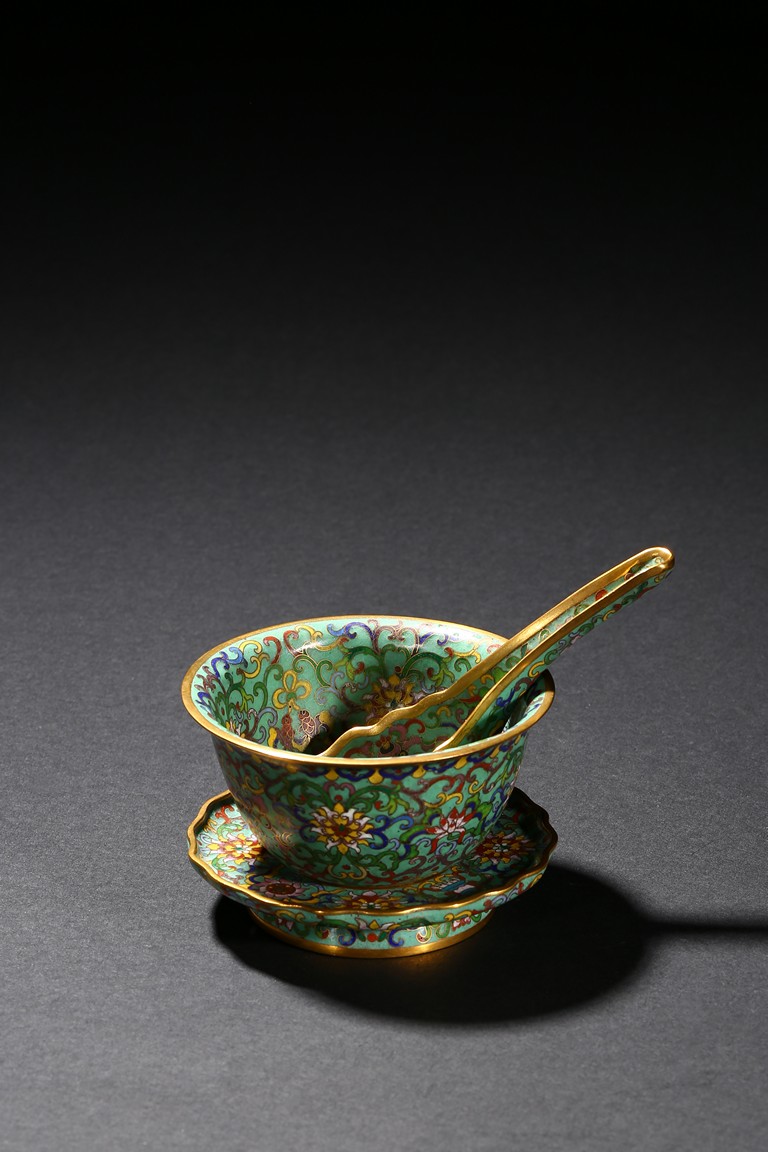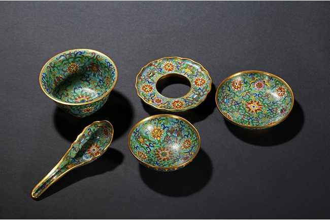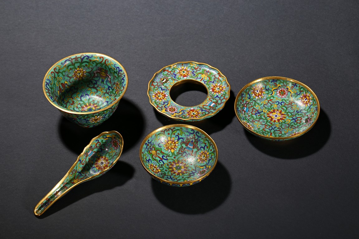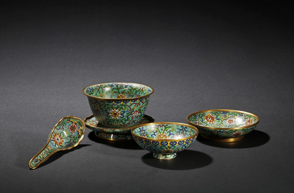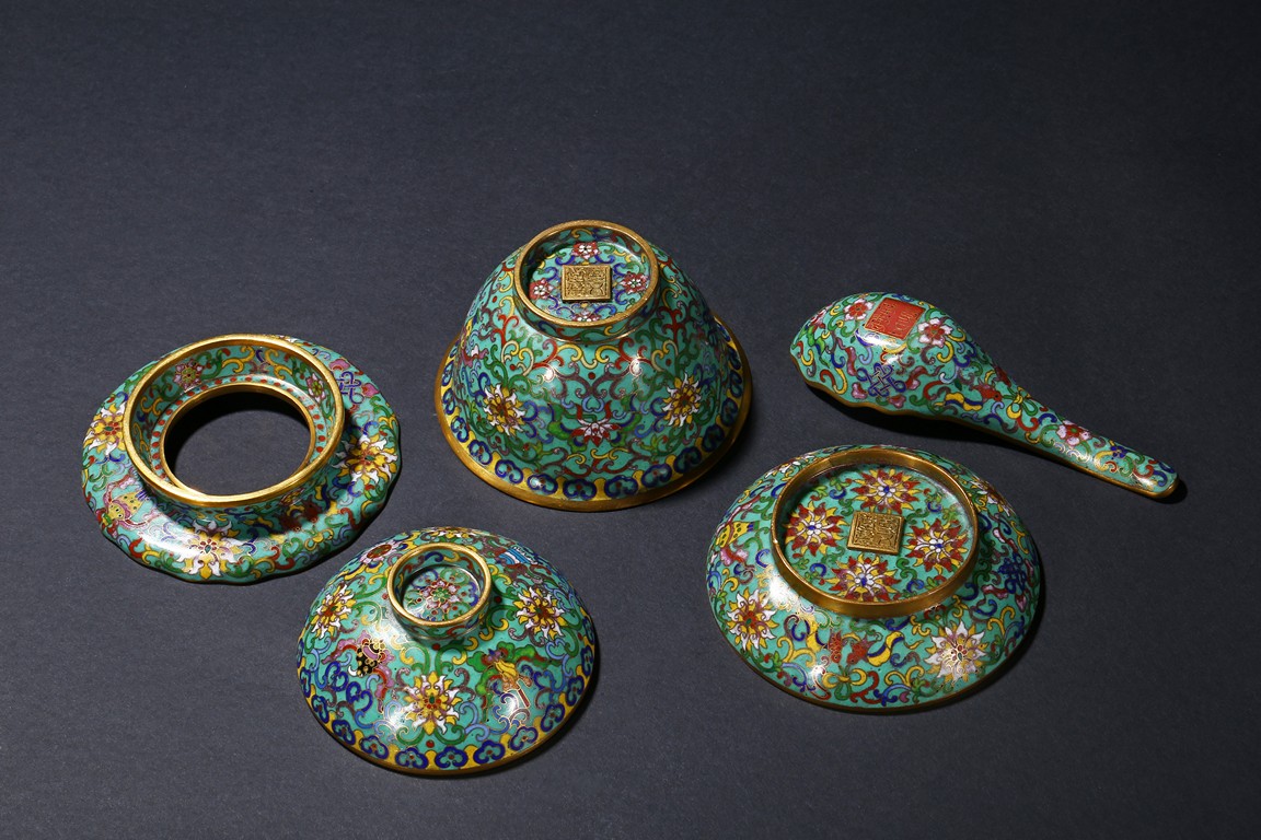 Consisting of a bowl, cover, stand, bowl holder, and spoon, all finely decorated with dense lotus scrolls and impressed with marks. Qing Dynasty period.