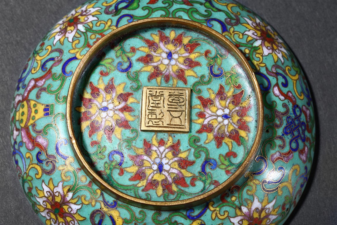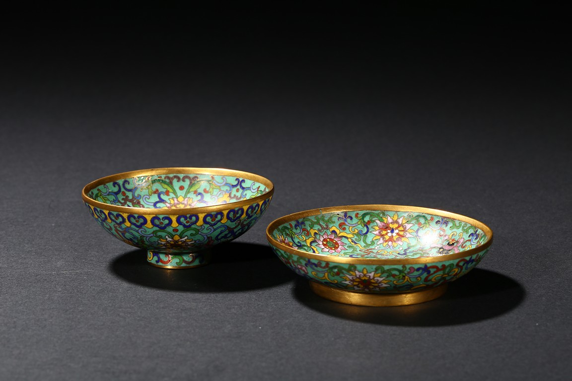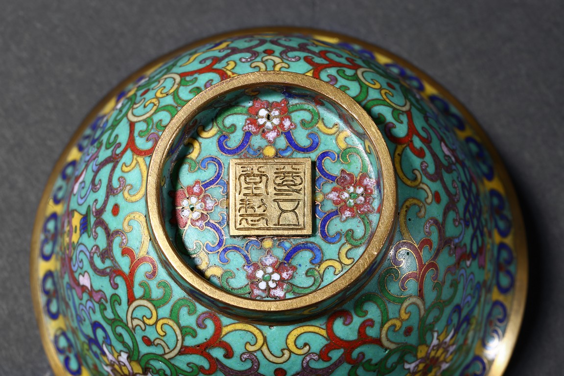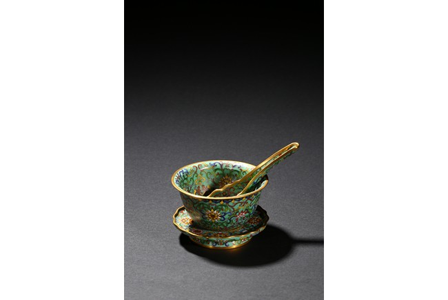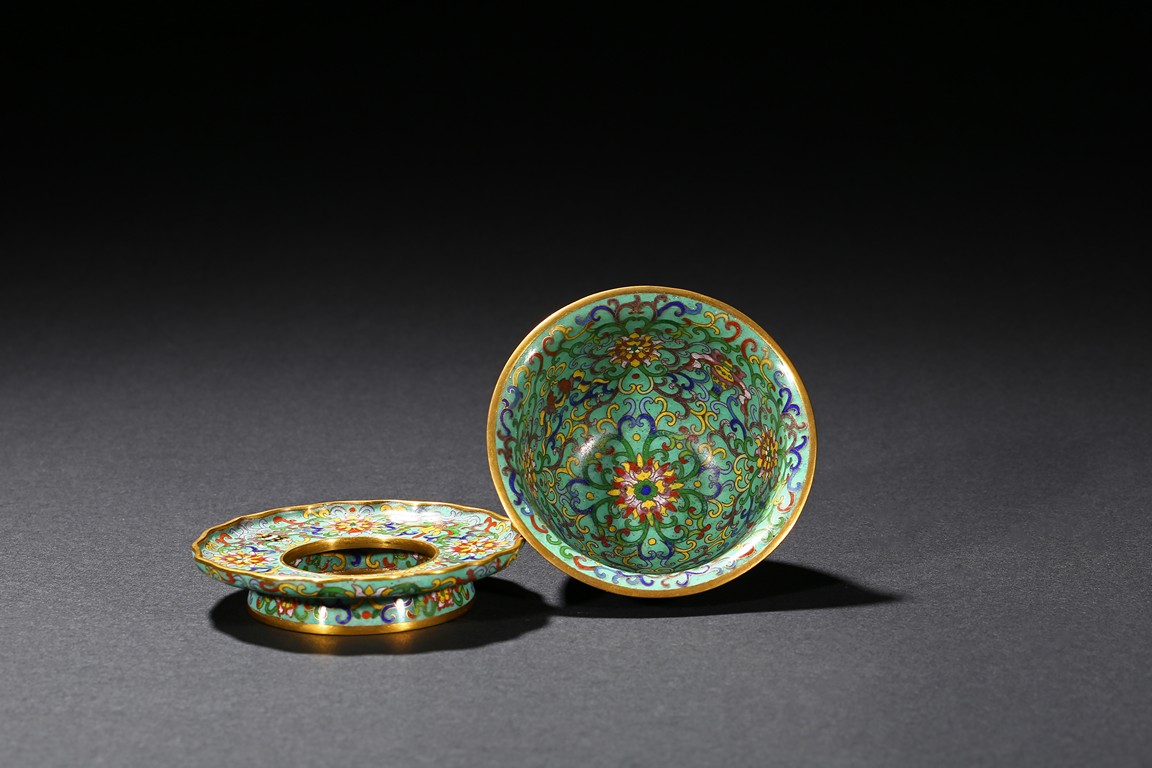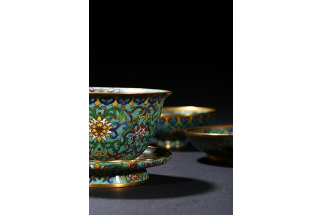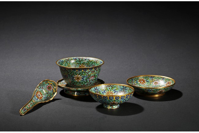 Consisting of a bowl, cover, stand, bowl holder, and spoon, all finely decorated with dense lotus scrolls and impressed with marks. Qing Dynasty period.