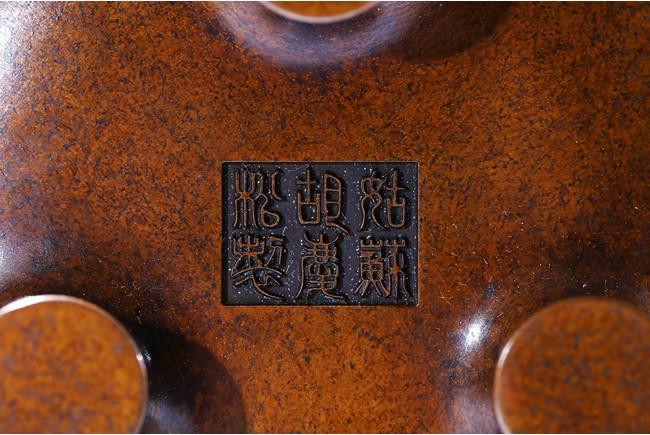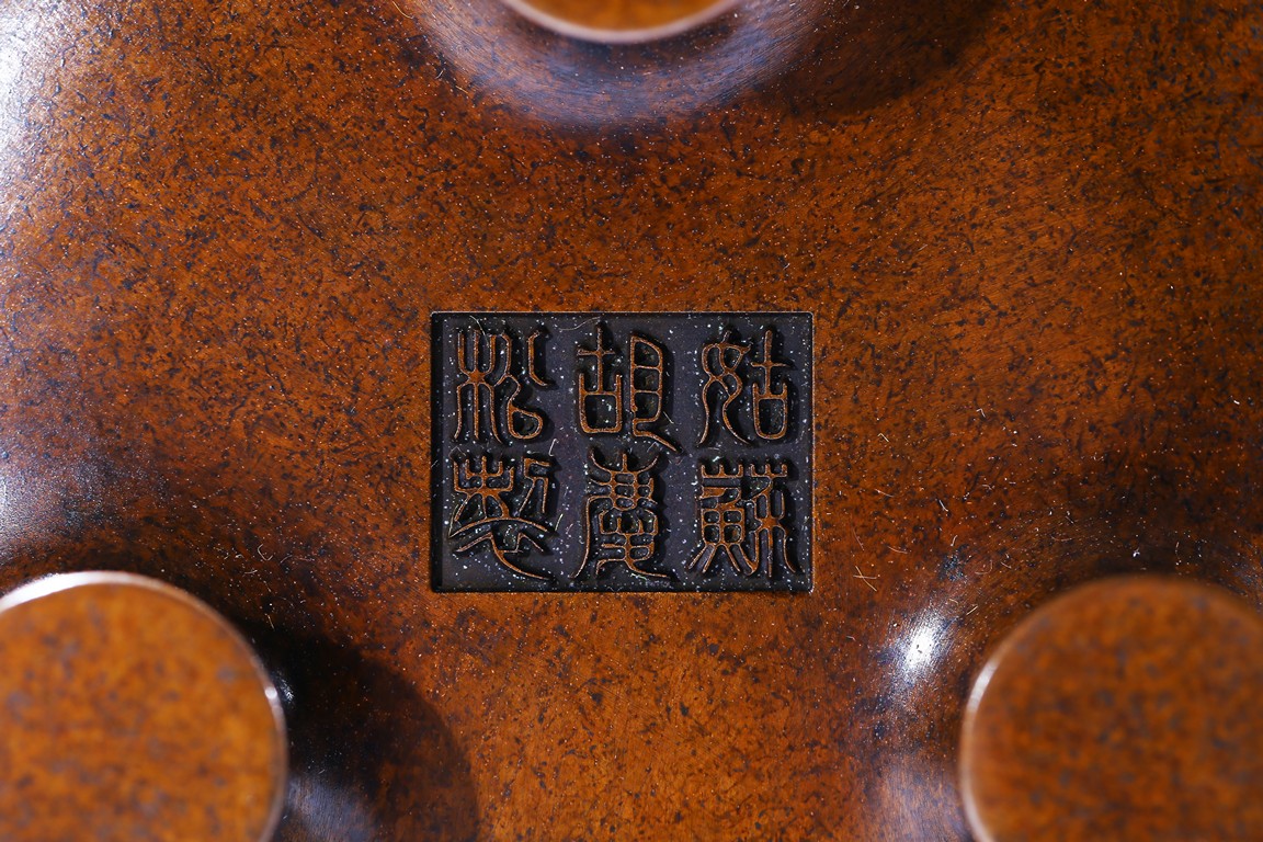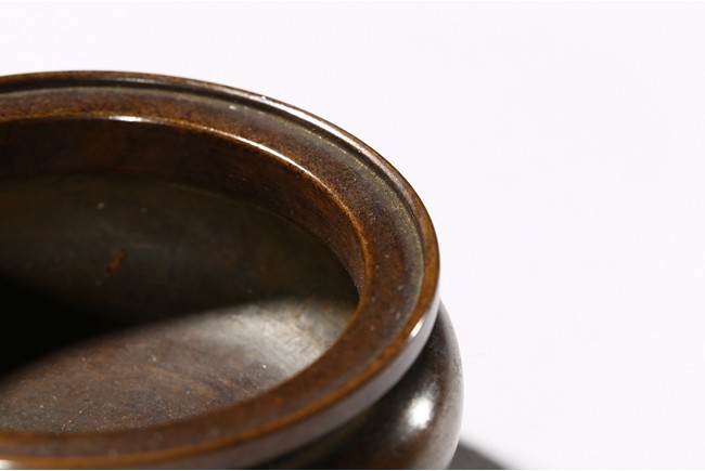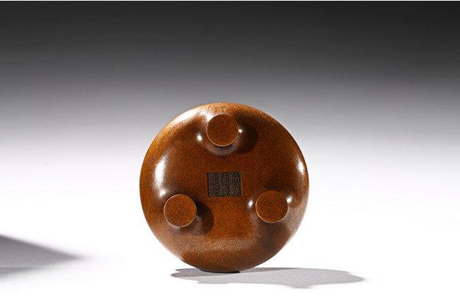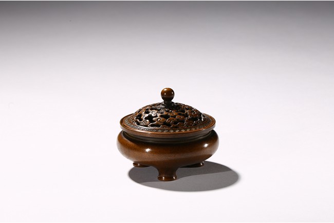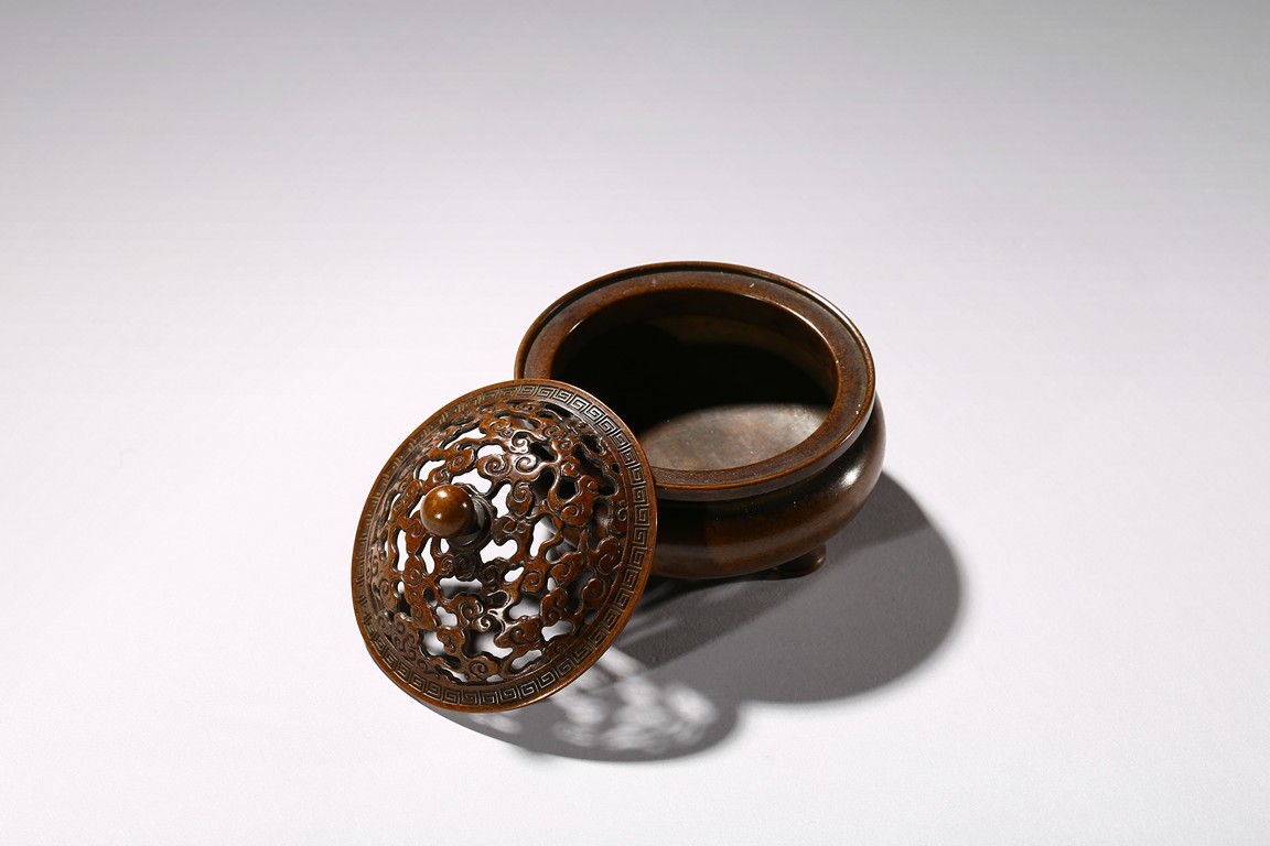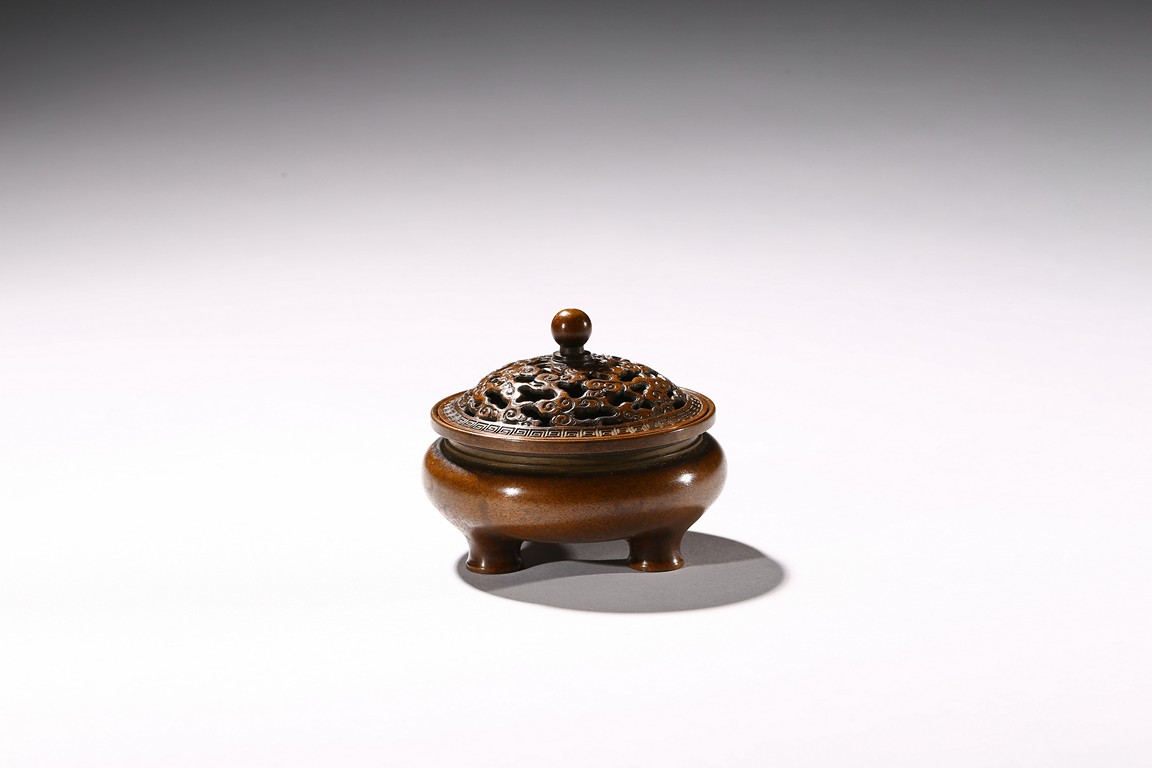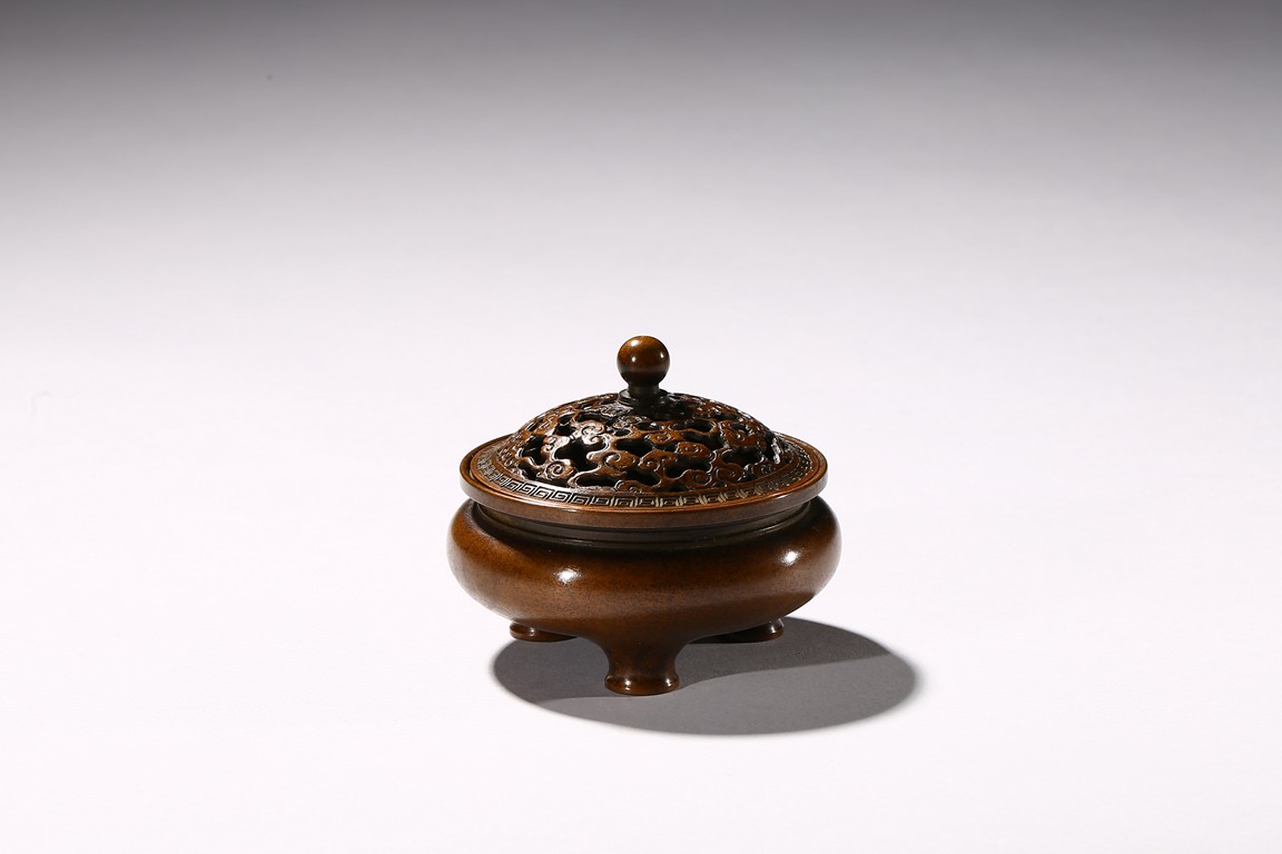 Of compressed globular form and supported on three feet, fitted with an openwork cover topped by a round finial, accompanied by wood box.