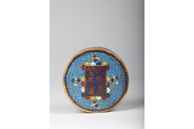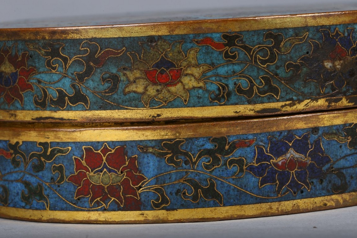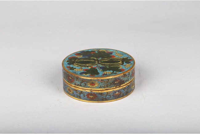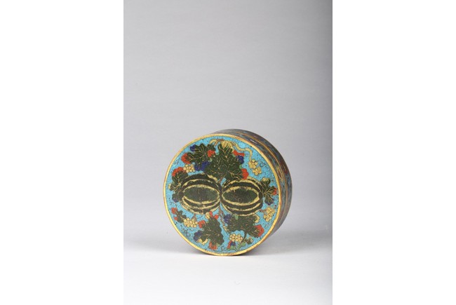 Of circular form, the box enamelled with two large melons and fruits borne on leafy branches, the side decorated with lotus scrolls, the base with six character WANLI mark, all reserved on turquoise ground. Ming Dynasty period.