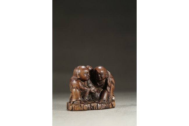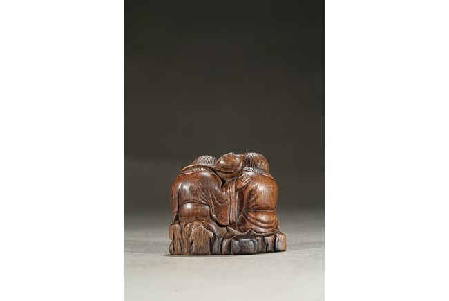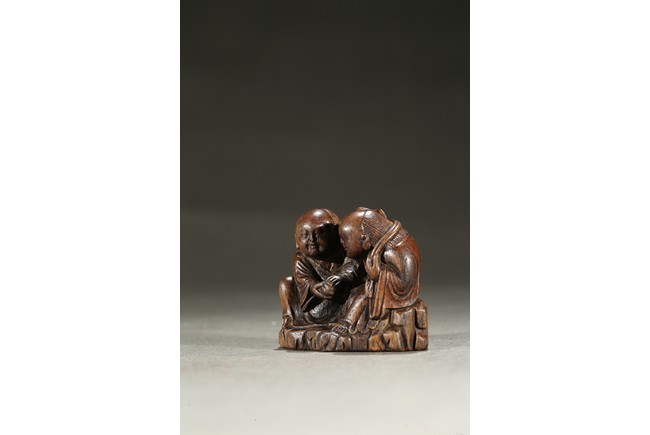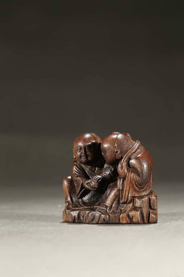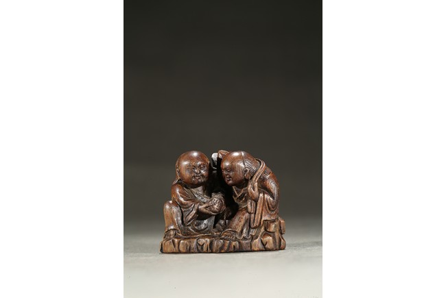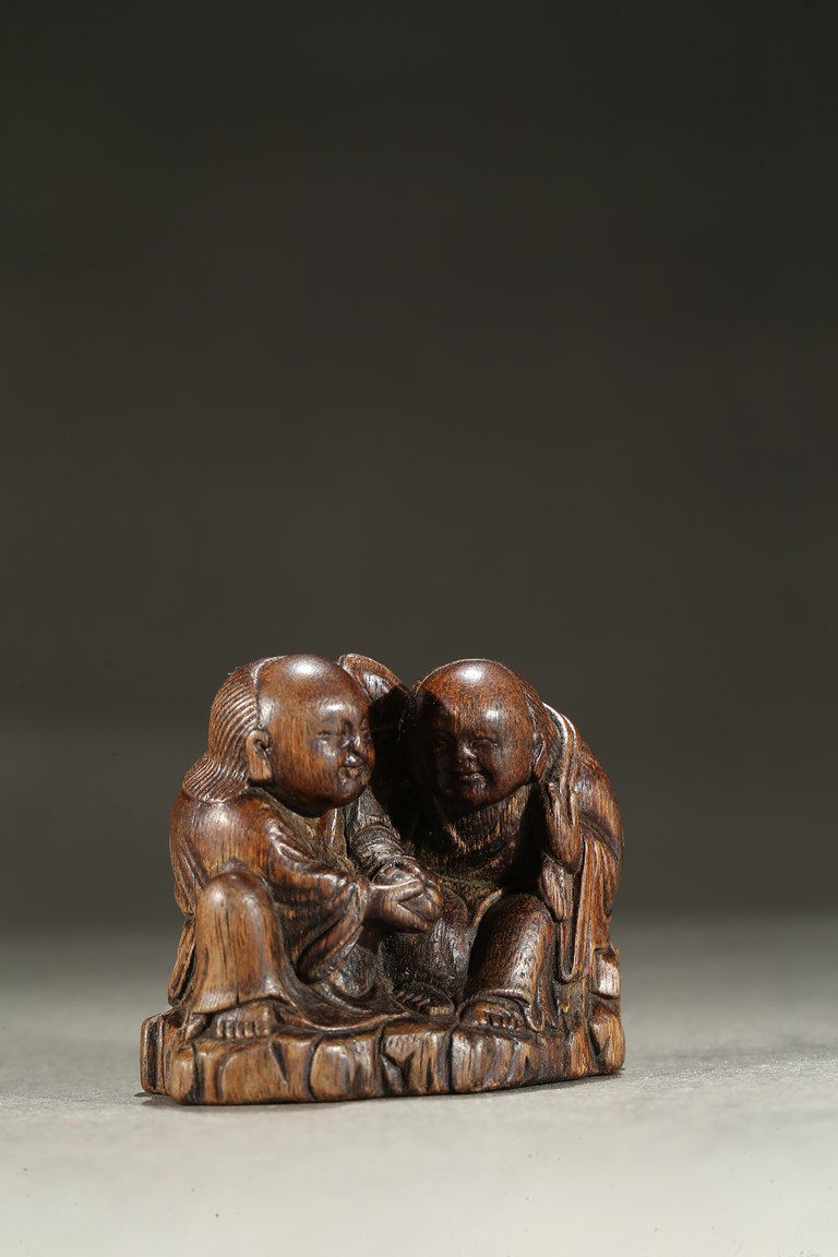 Finely carved in the form of the Hehe Erxian twins seated with wide smiles on their faces, both figures adorned in long flowing robes, both of them holding a brocade ball in one hand while the other wraps his arm around his twin's shoulder in a friendly embrace, the surface patinated to a reddish-brown color, with agarwood aroma. Qing Dynasty period.