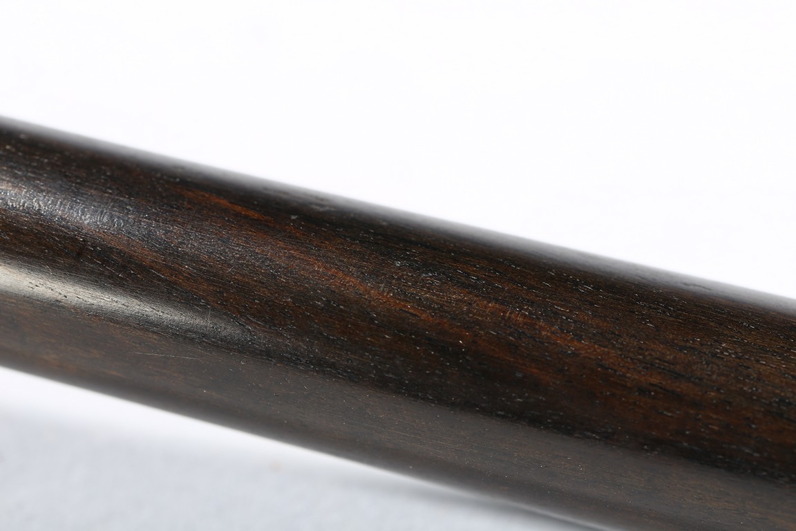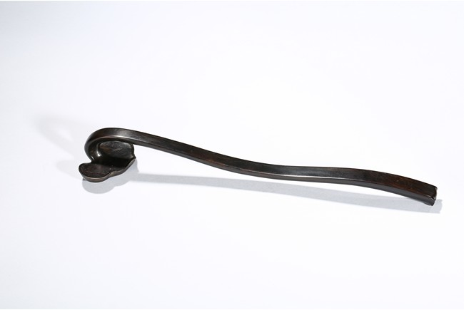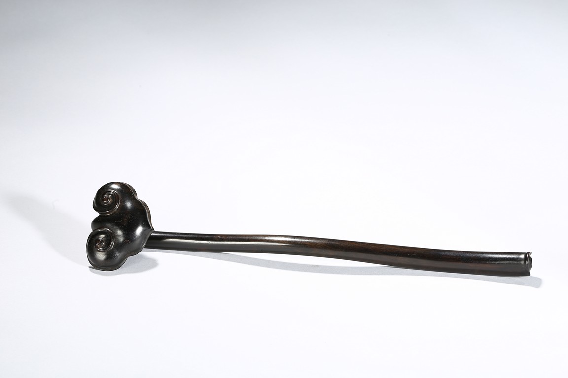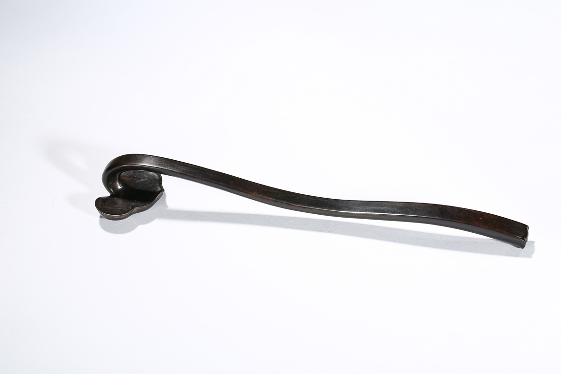 Carved in the form of a stylized lingzhi head with slender branch handle. The wood is of dark brown tone. Qing Dynasty period.