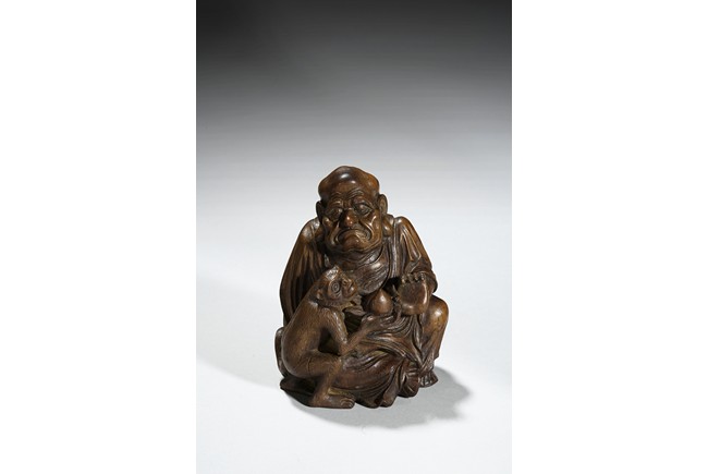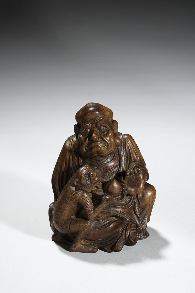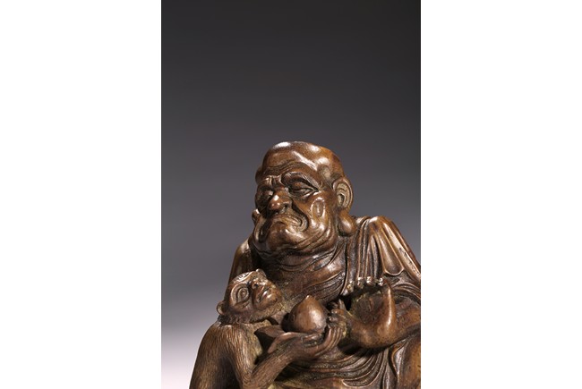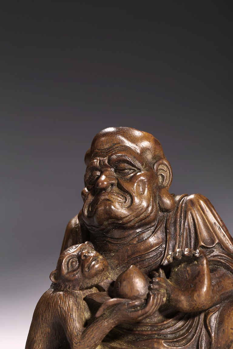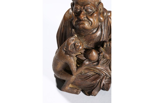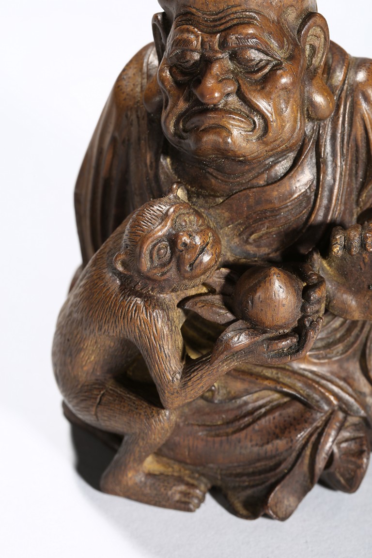 The carving depicts a monkey presenting a large peach to a seated elderly luohan. Qing Dynasty period.