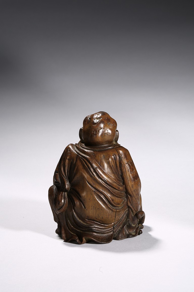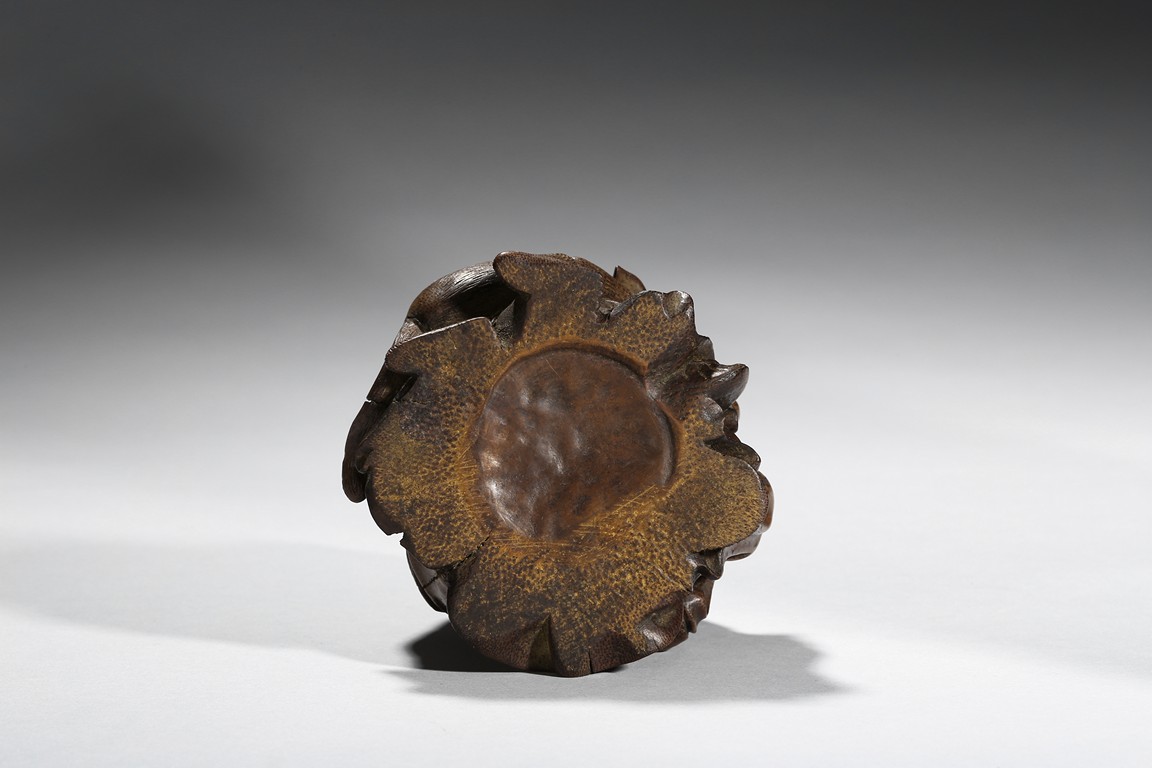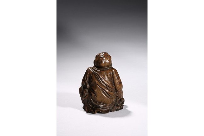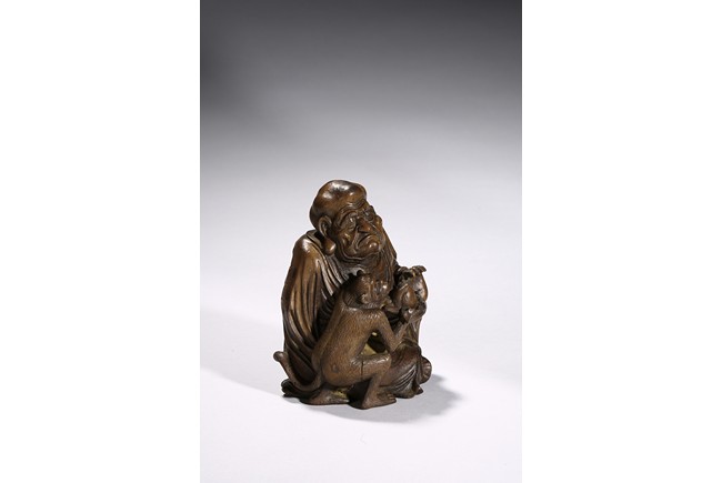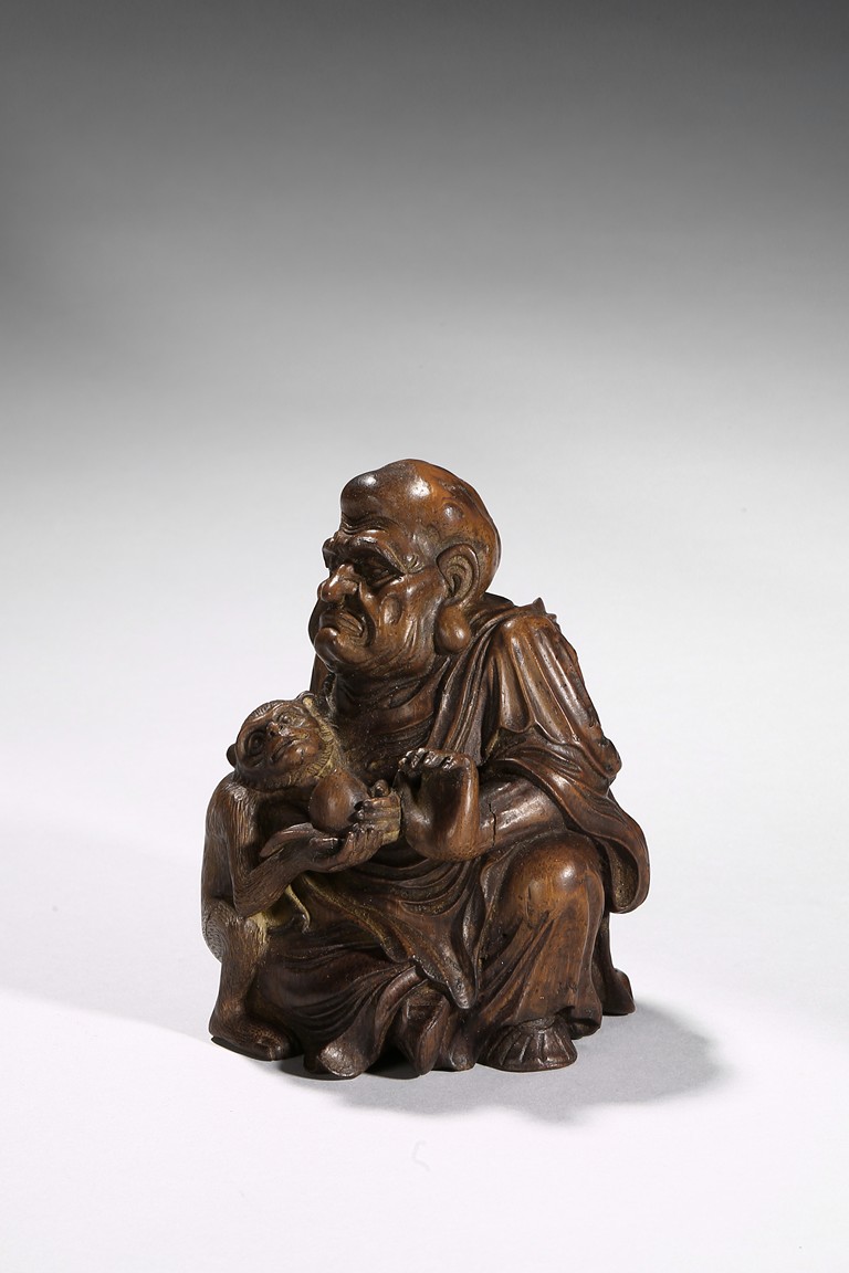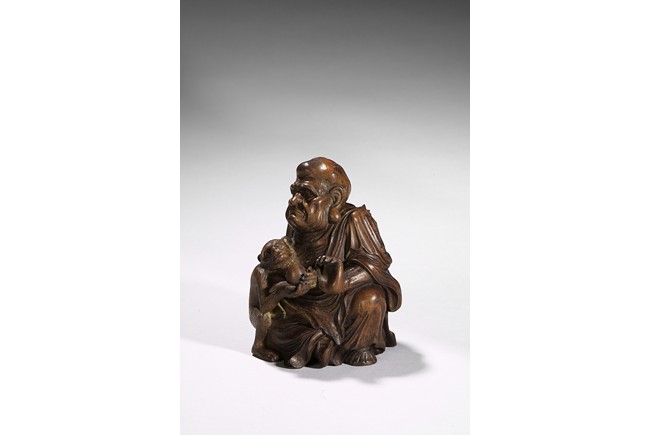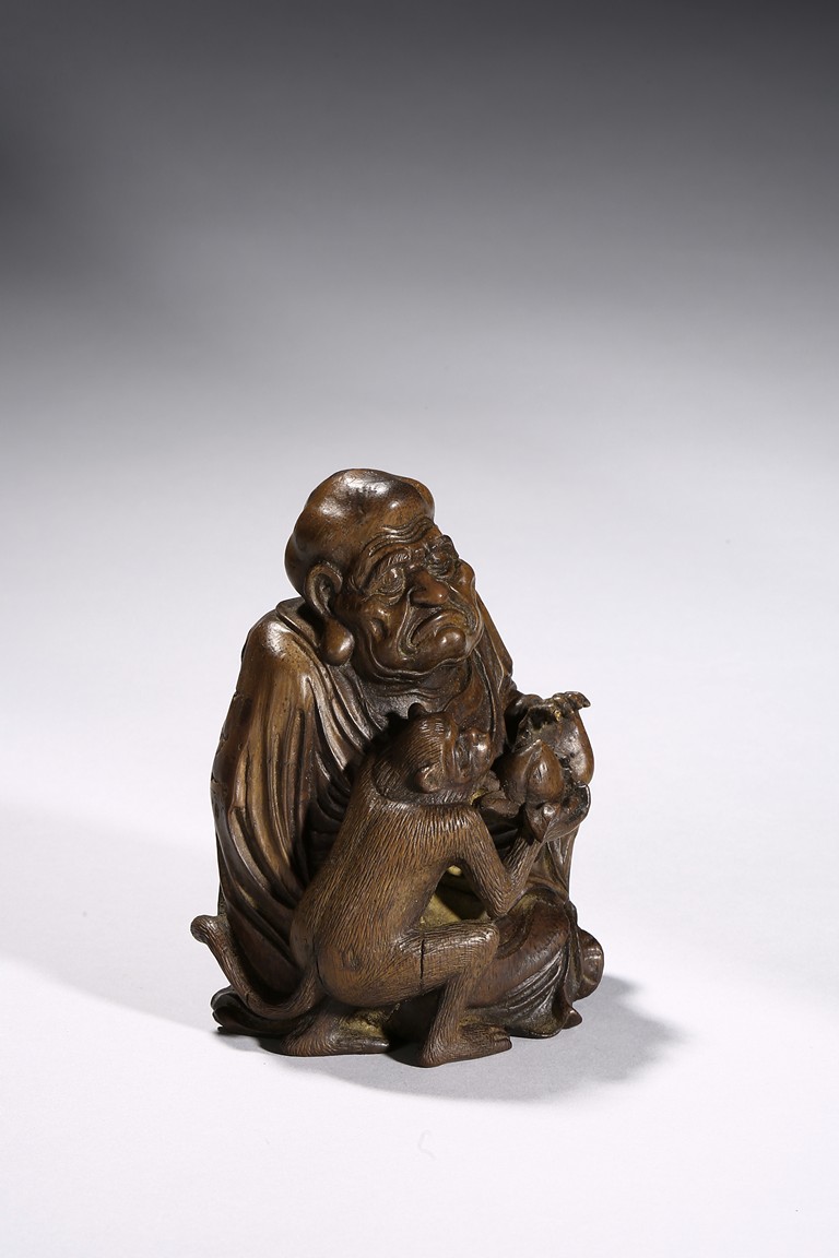 The carving depicts a monkey presenting a large peach to a seated elderly luohan. Qing Dynasty period.