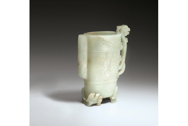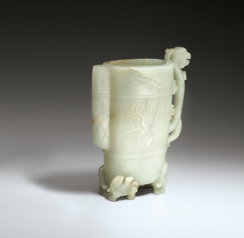 Of oval section, the flattened vessel is raised on three feet carved as winged bixie and decorated on each side with an animal-mask on a hatched ground below a sinuous chilong at the rim. The handle is carved in openwork as an archaistic bird and the spout is incised with scrolls. Mid-Qing Dynasty period.