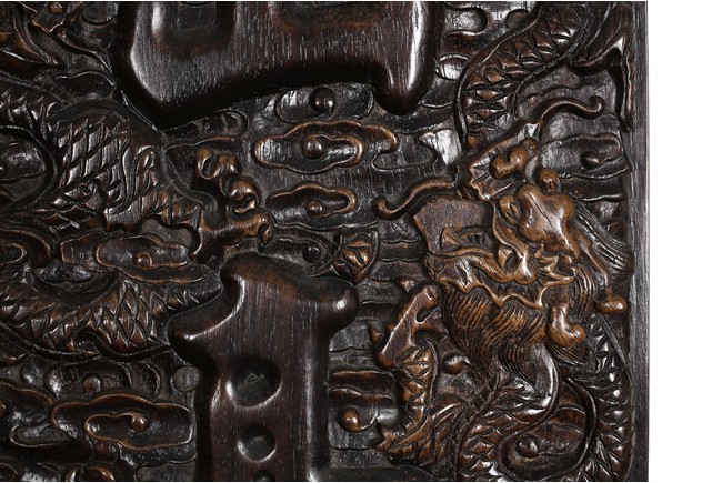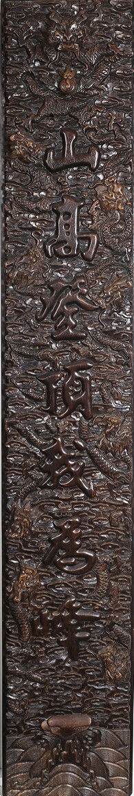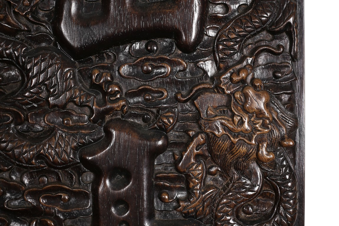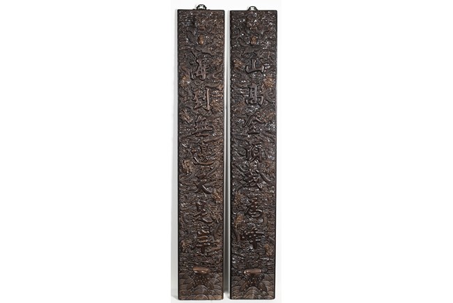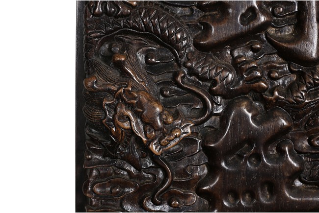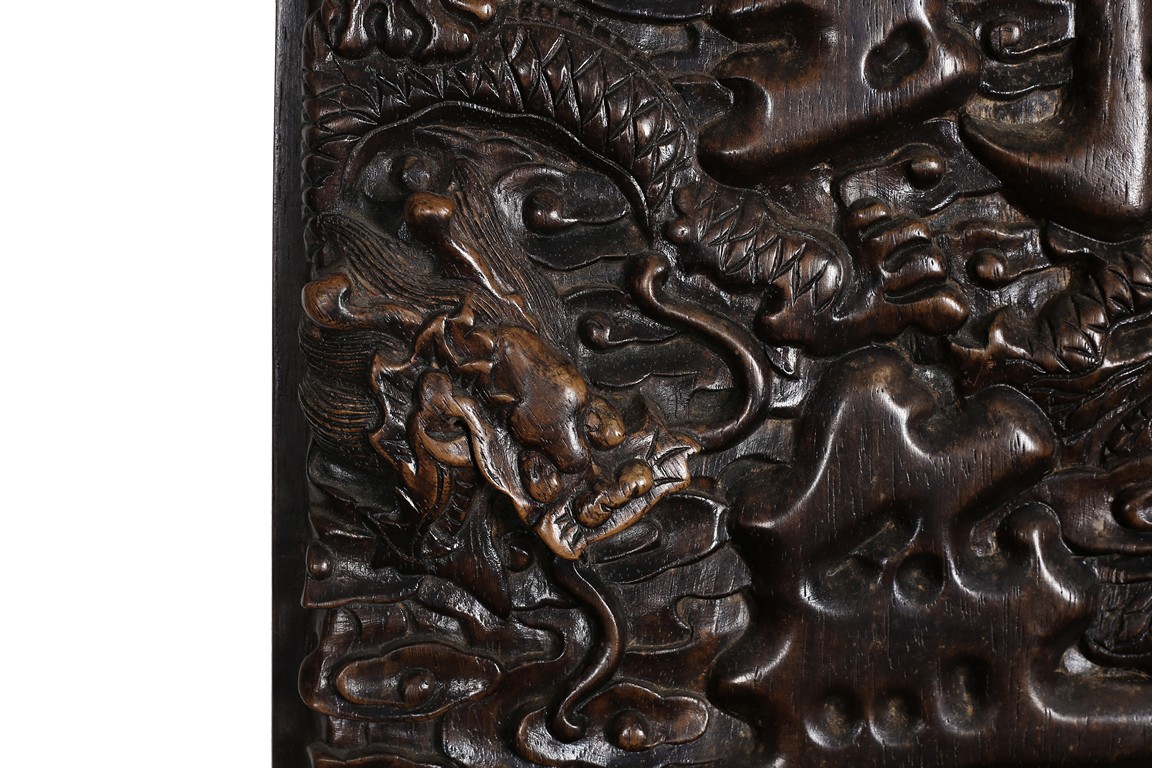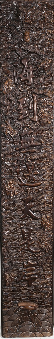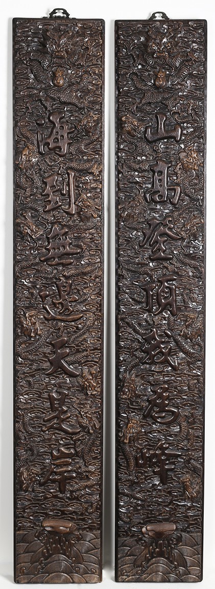 Each panel is of vertical rectangular form, deeply carved with running script ten-character calligraphy, all reserved on dense dragon and cloud ground. Late Qing Dynasty period.