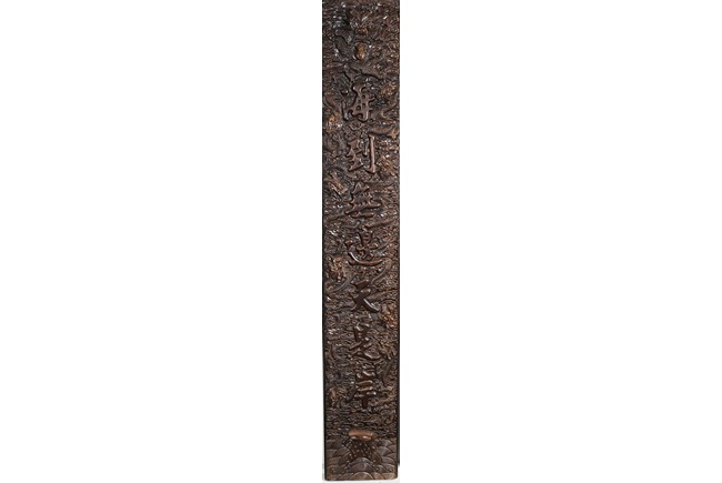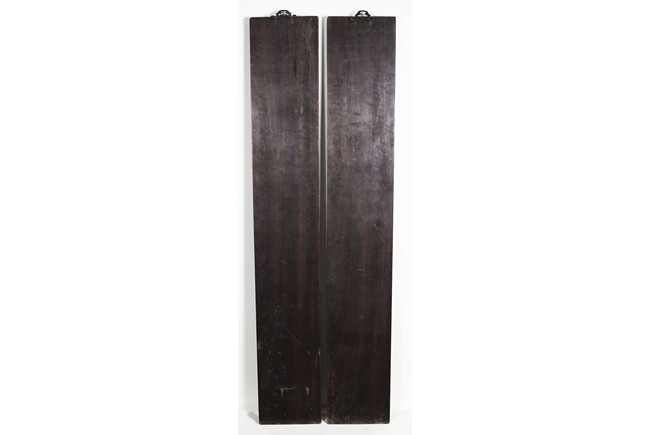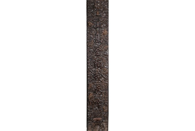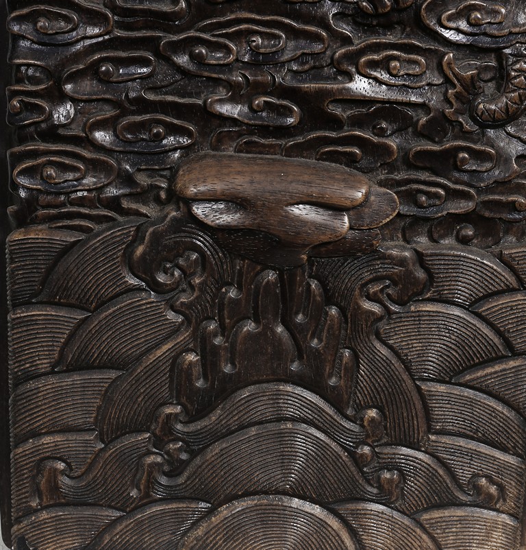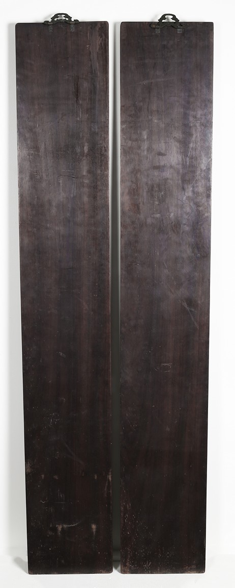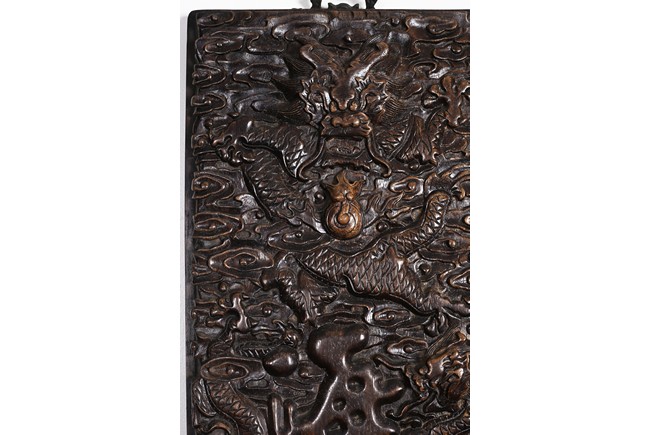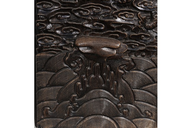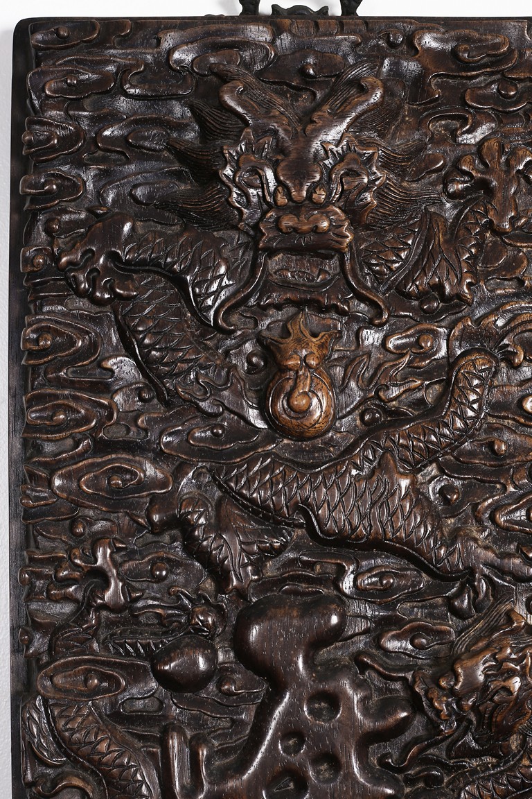 Each panel is of vertical rectangular form, deeply carved with running script ten-character calligraphy, all reserved on dense dragon and cloud ground. Late Qing Dynasty period.
