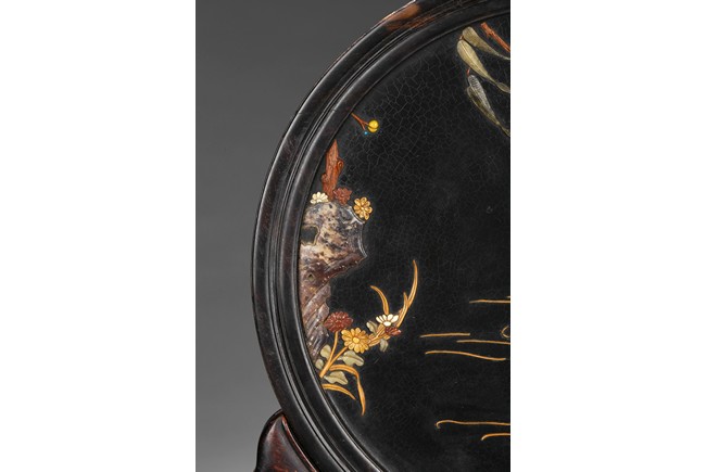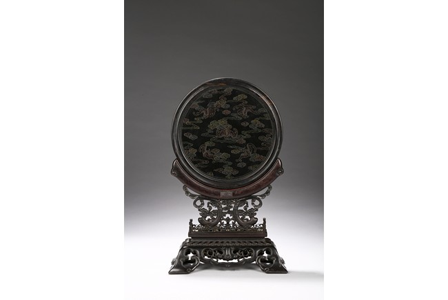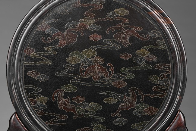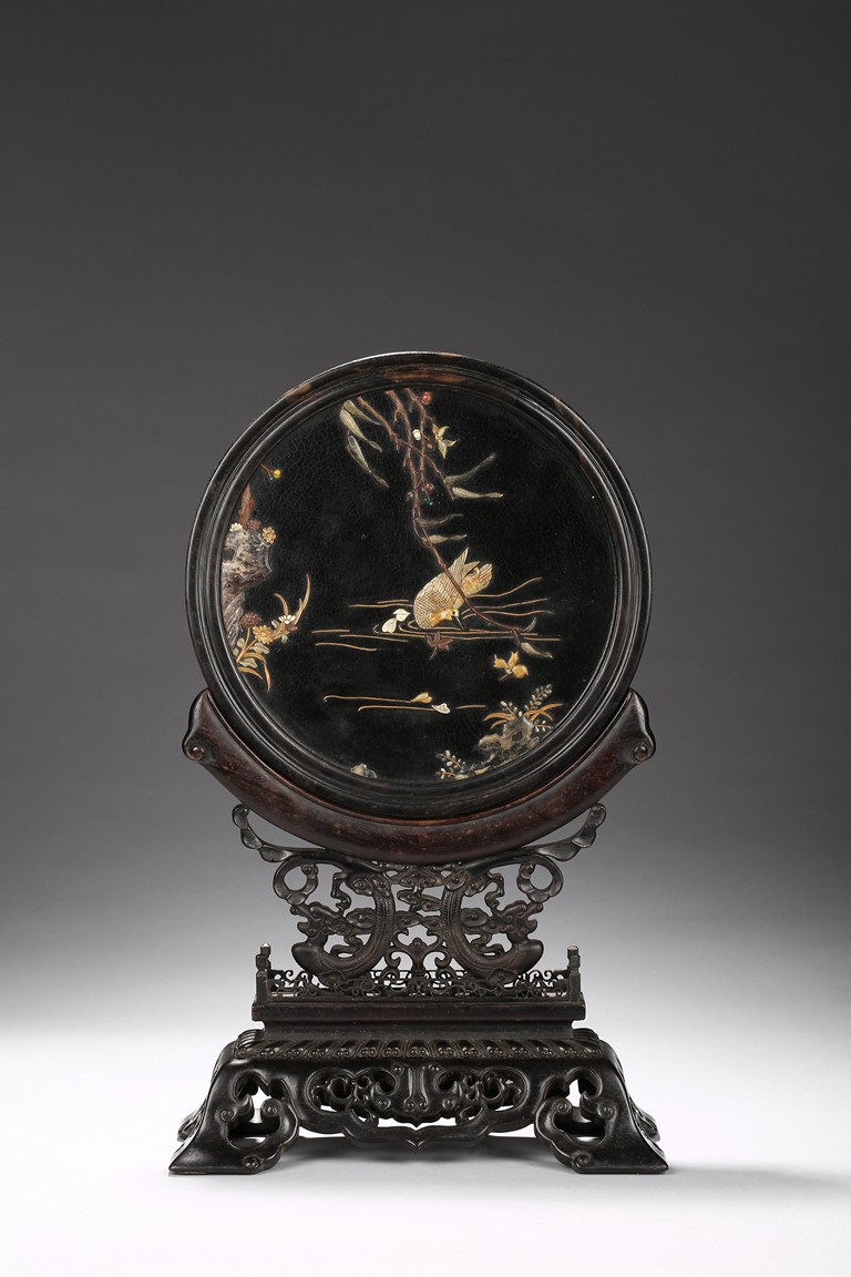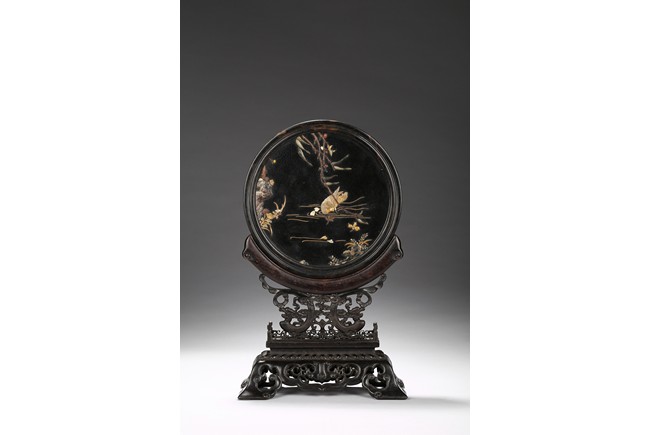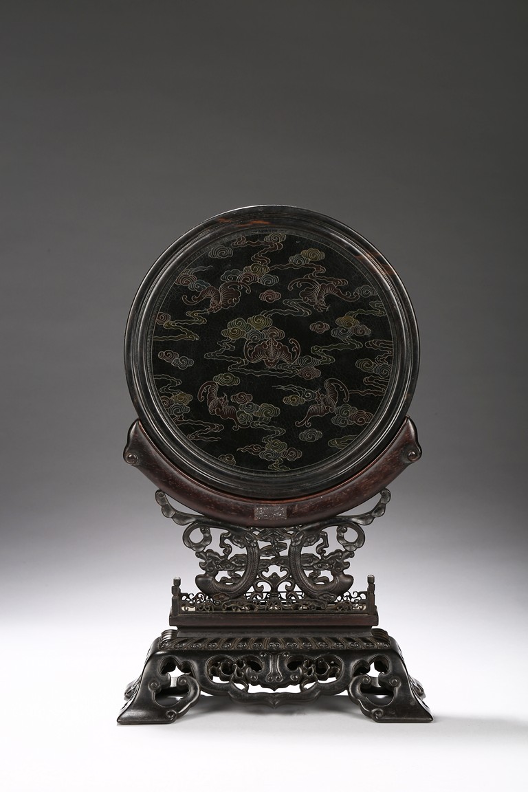 The hardwood hongmu circular panel inlaid with jade and agate to depict a swimming duck in a pond, the reverse painted with five bats in flight within clouds. Qing Dynasty period.