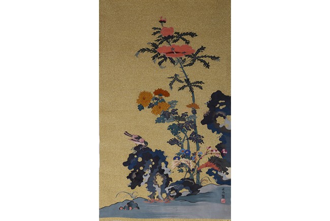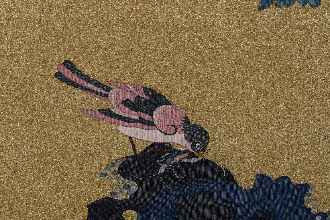 Finely worked as finch perched above ornamental rockwork picking at a insect, next to various flowering branches, with a three character Cui Bai Zhi and a seal mark to the lower right.