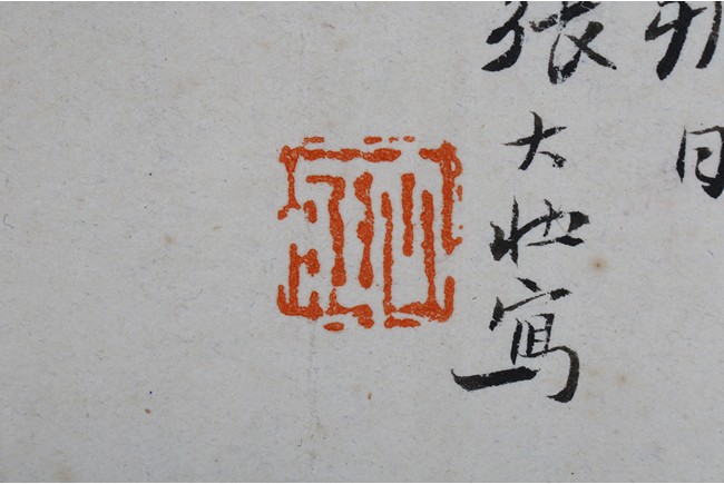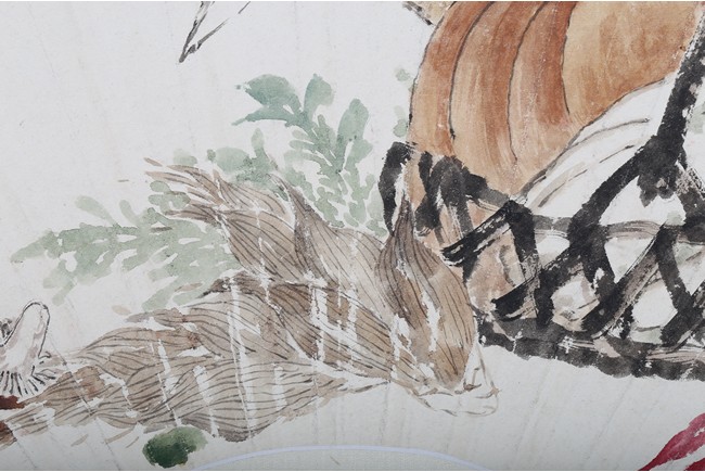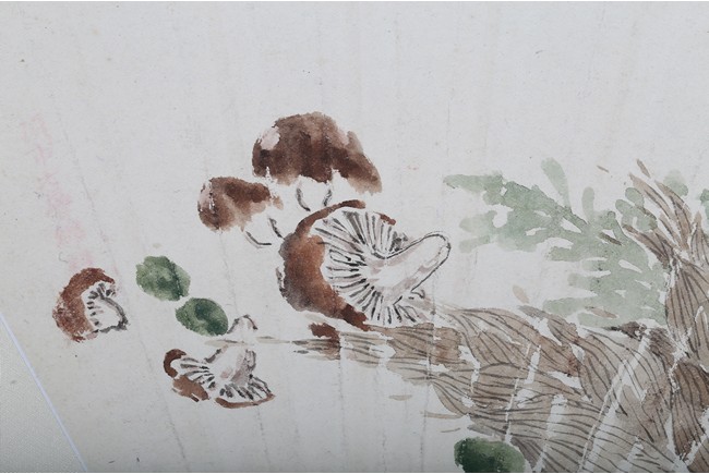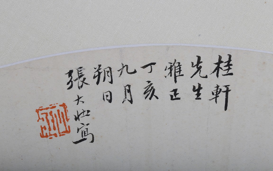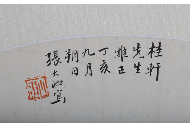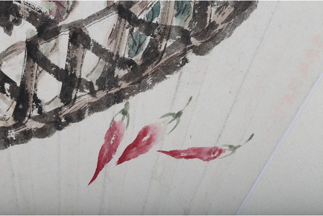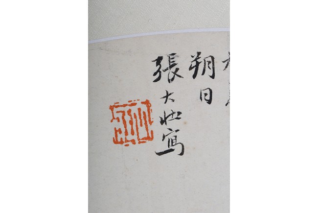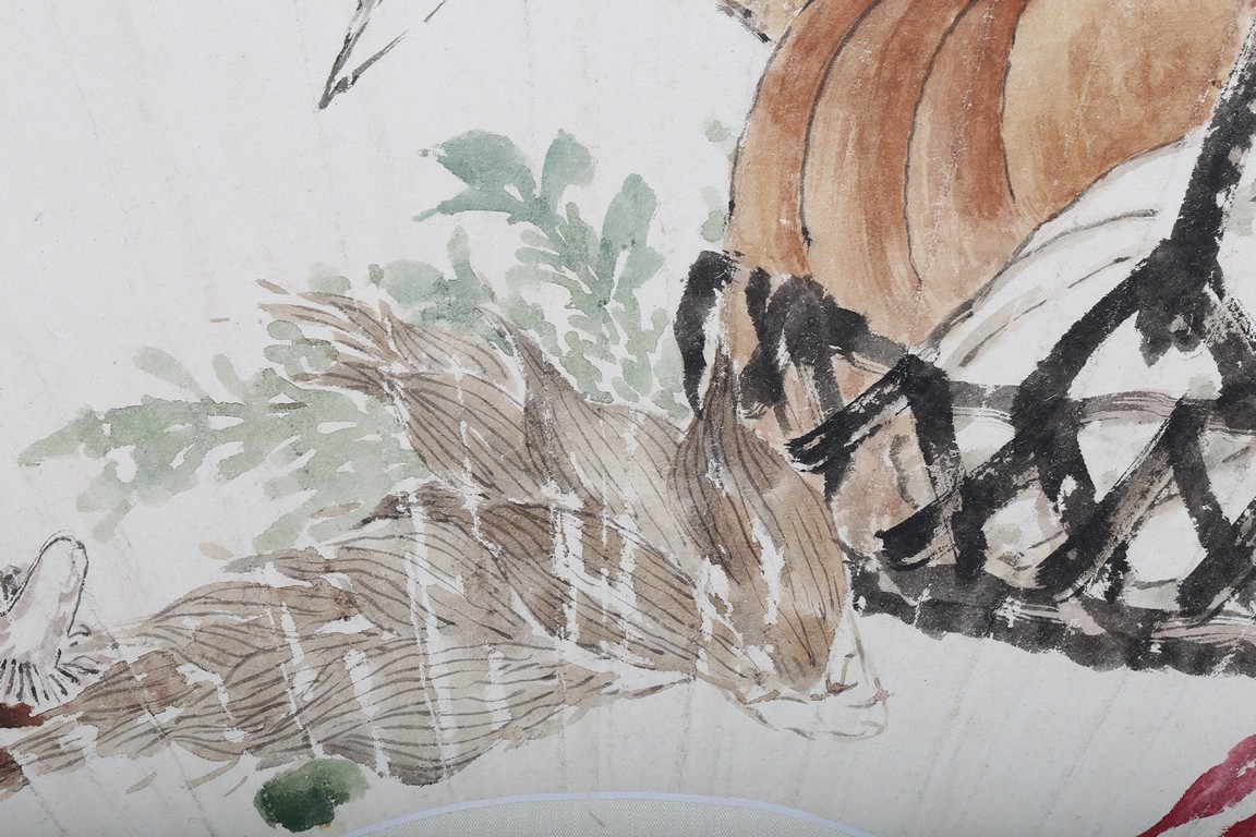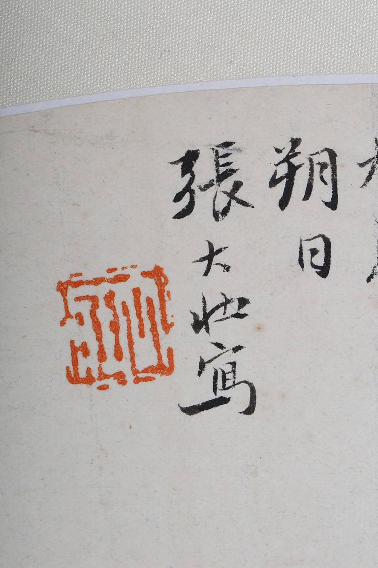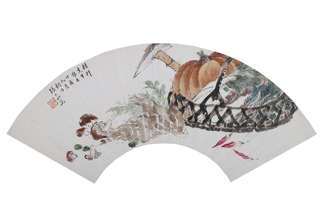 Color and ink on paper. Vegetables. Fan painting mounted for framing. Inscribed and signed Zhang Dazhuang, with one seal of the artist.