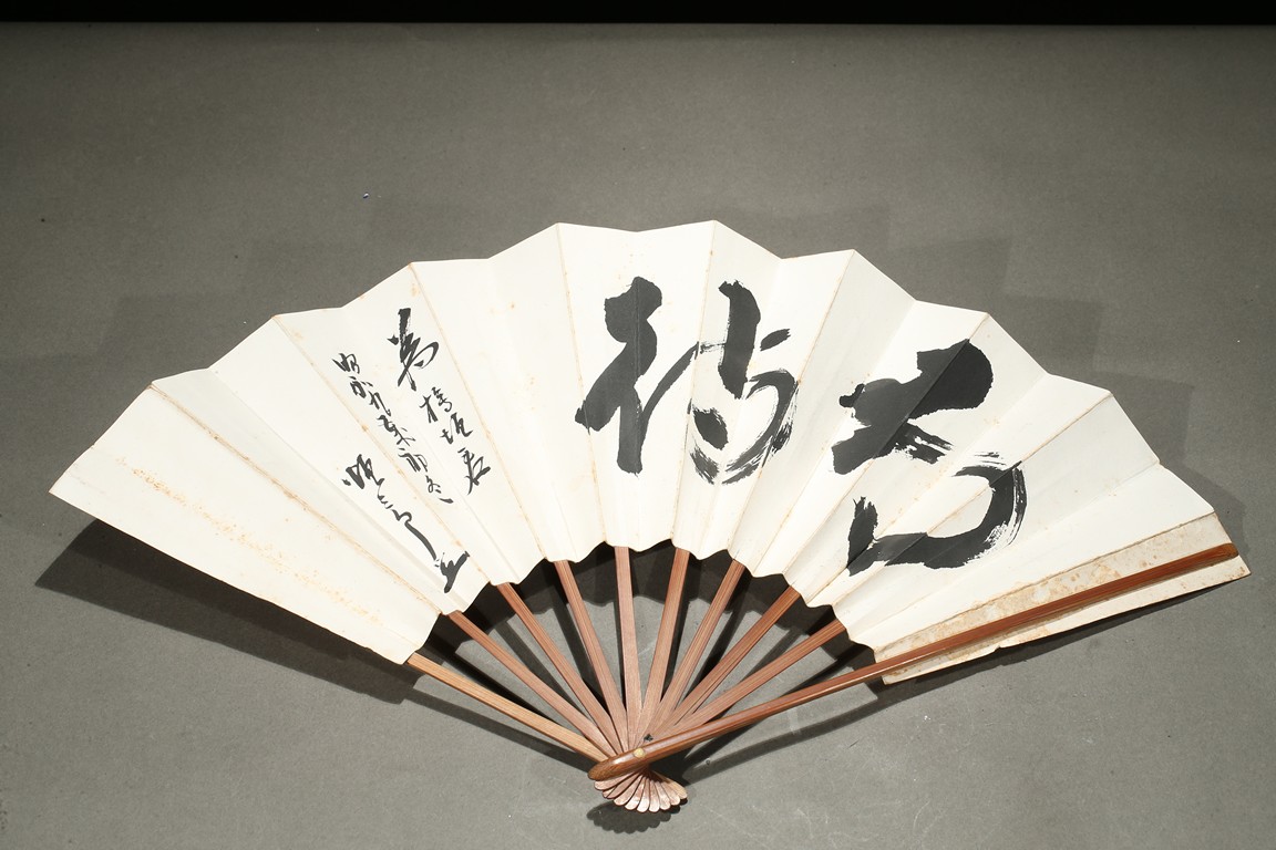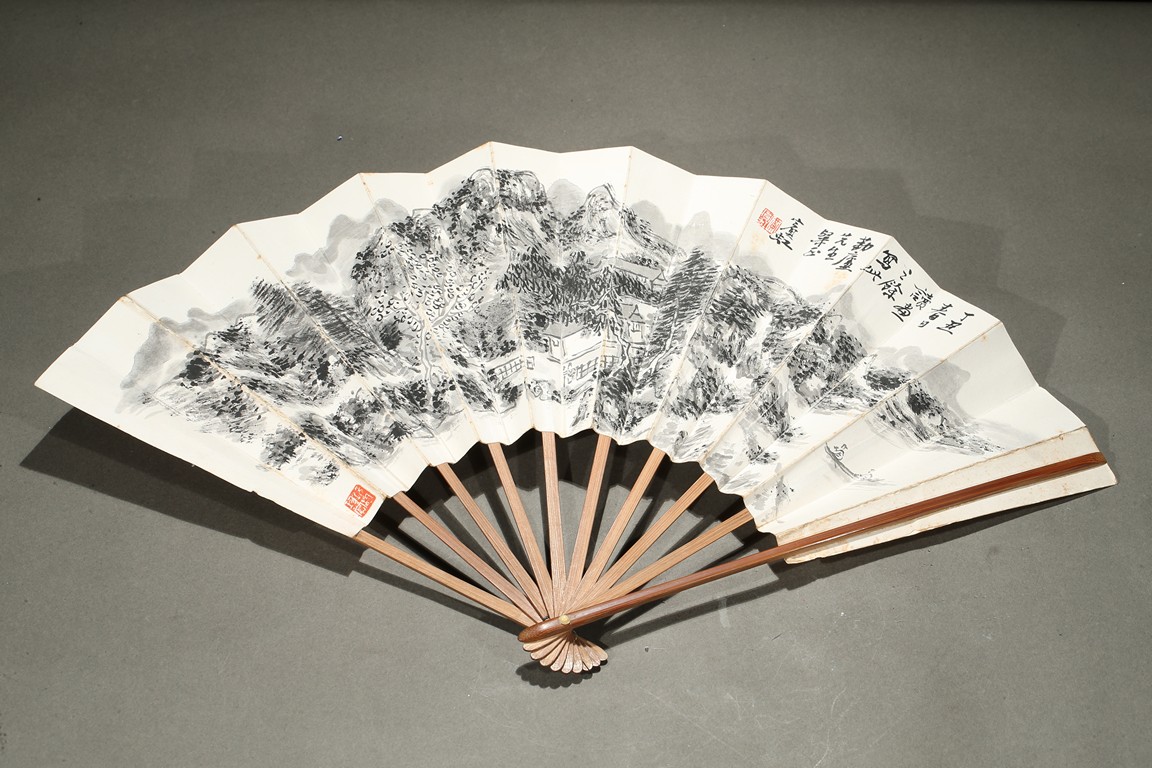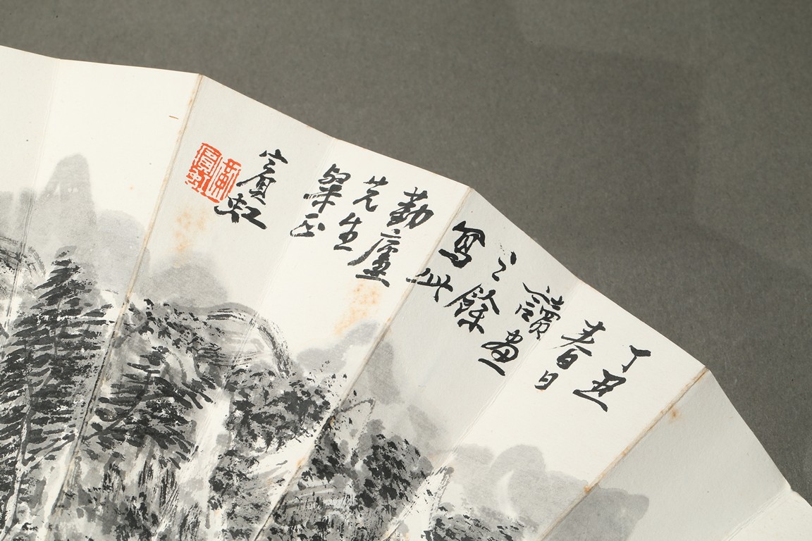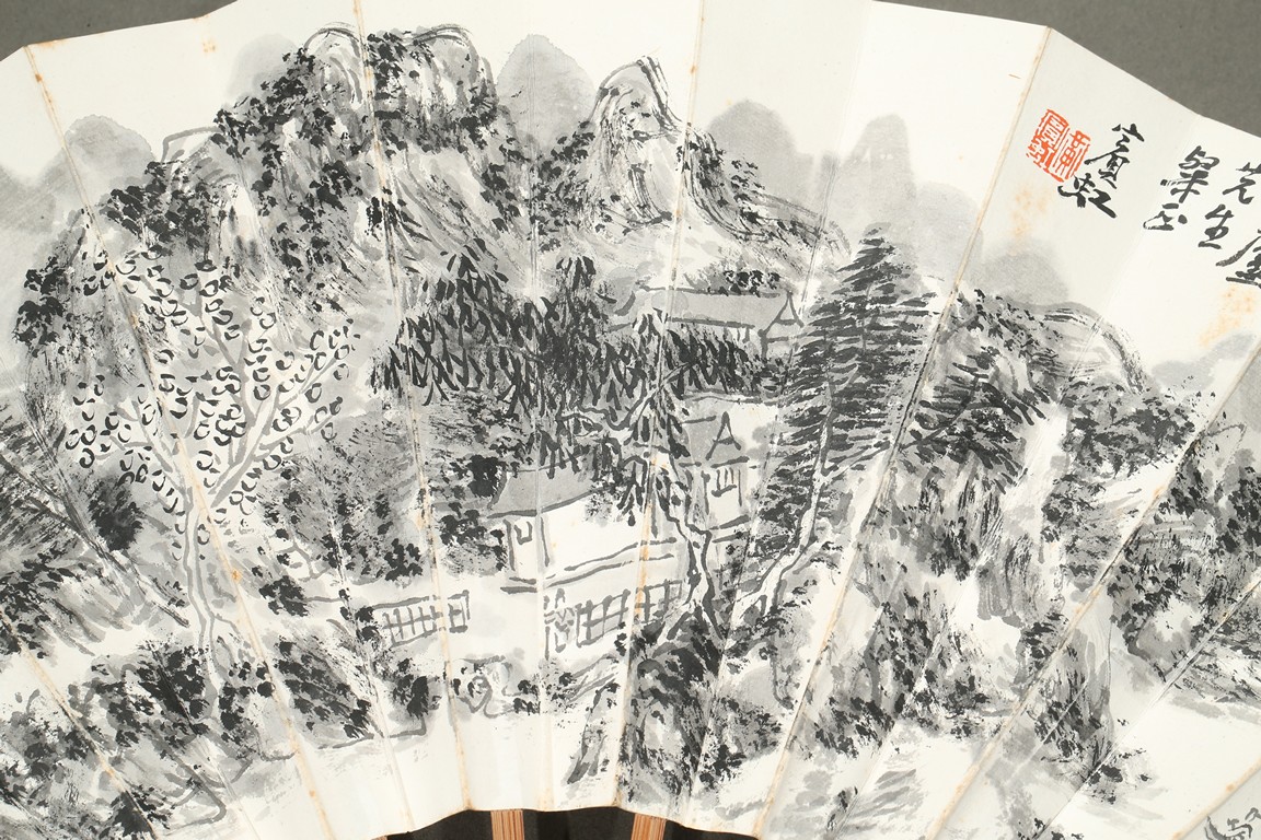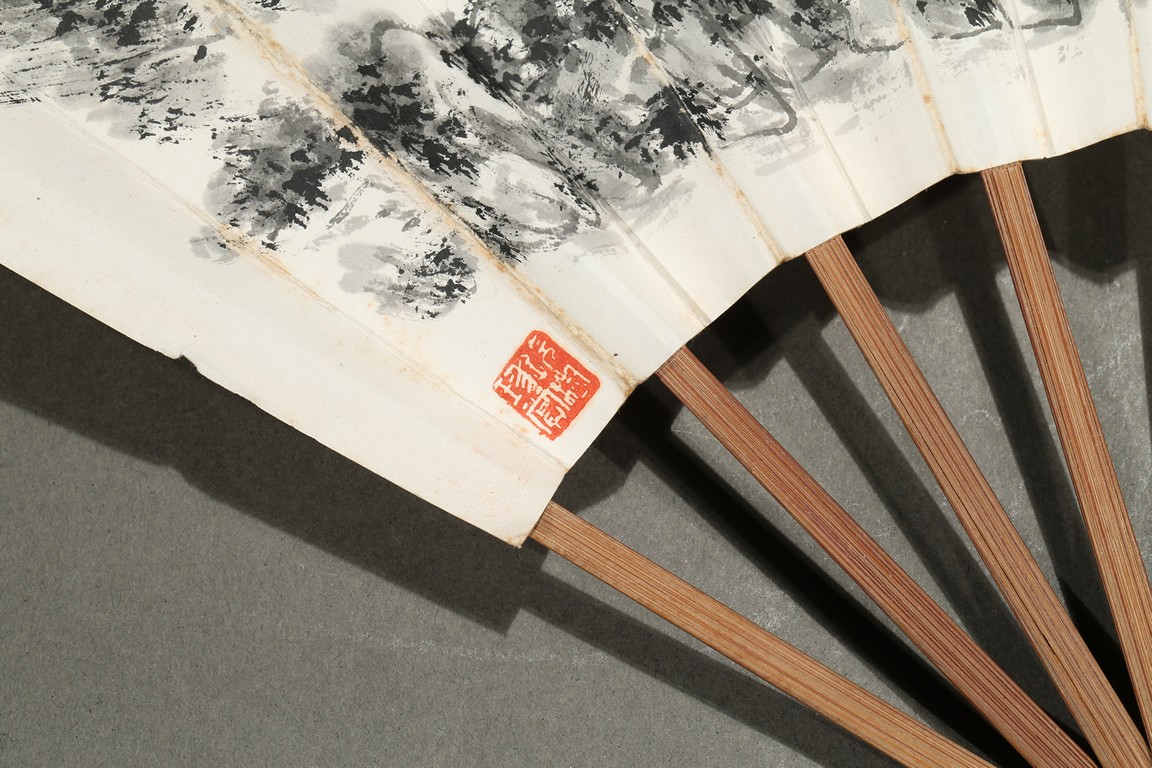 Ink on paper. Landscape. Folded Fan painting, inscribed and with a dedication, signed Binhong, with two seals of the artist; the reverse with inscriptions written in Japanese.