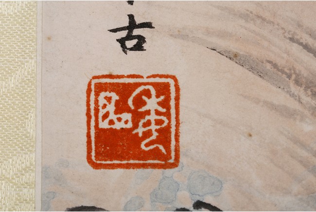Color and ink on paper. Landscape. Signed Chong He,with two seals of the artist.