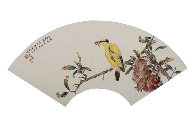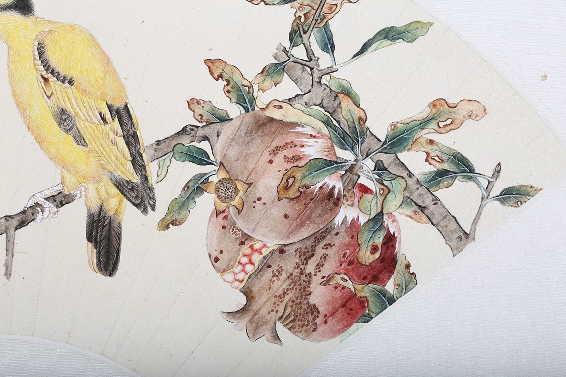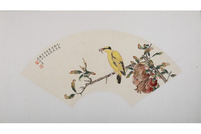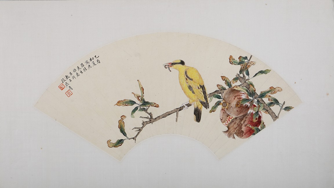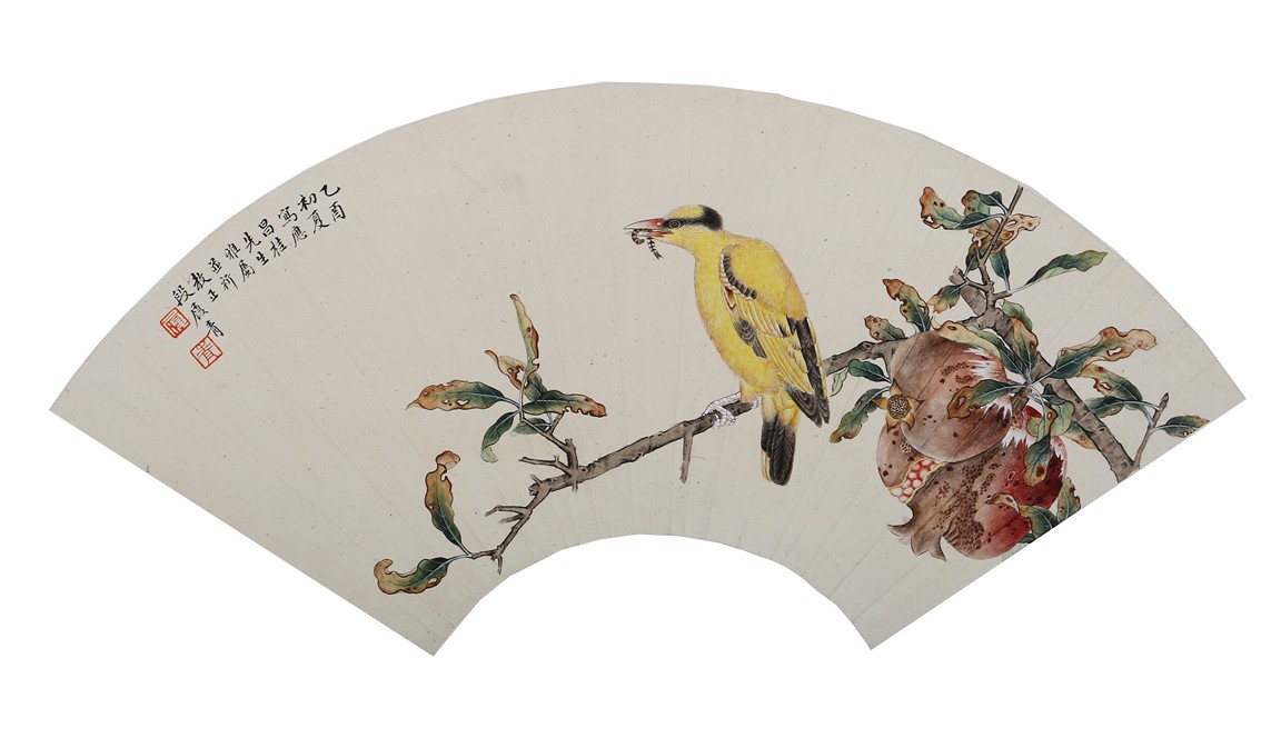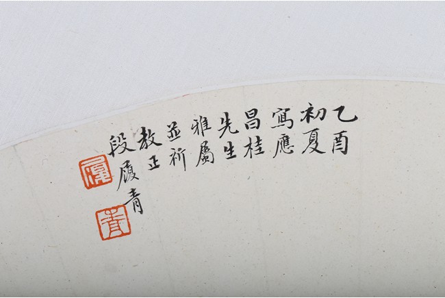Color and ink on paper. Bird and flower. Mounted for framing. Fan painting. Inscribed and signed Duan Dianqing, with two seals of the artist.
