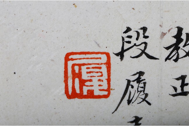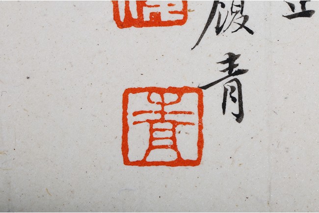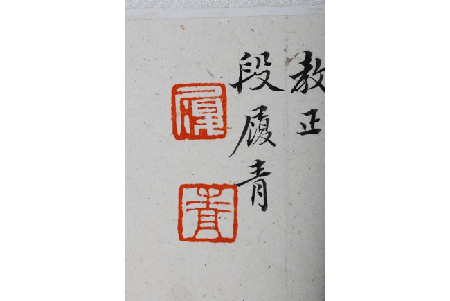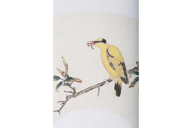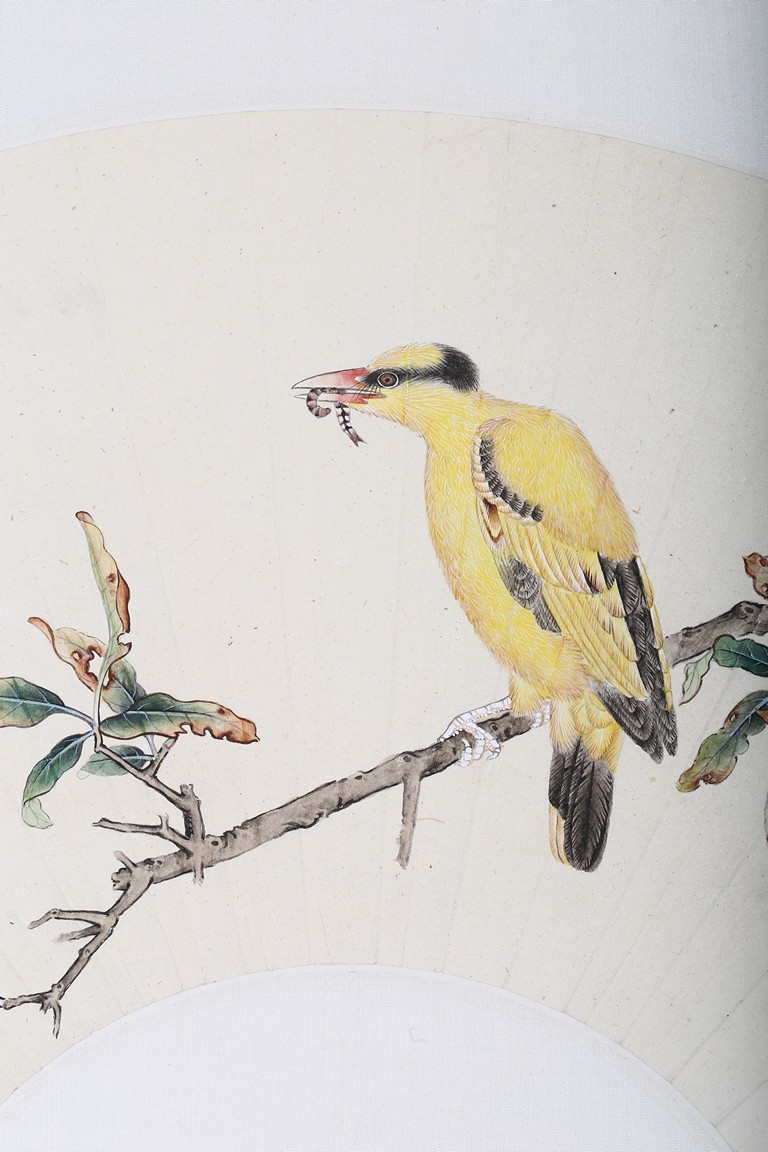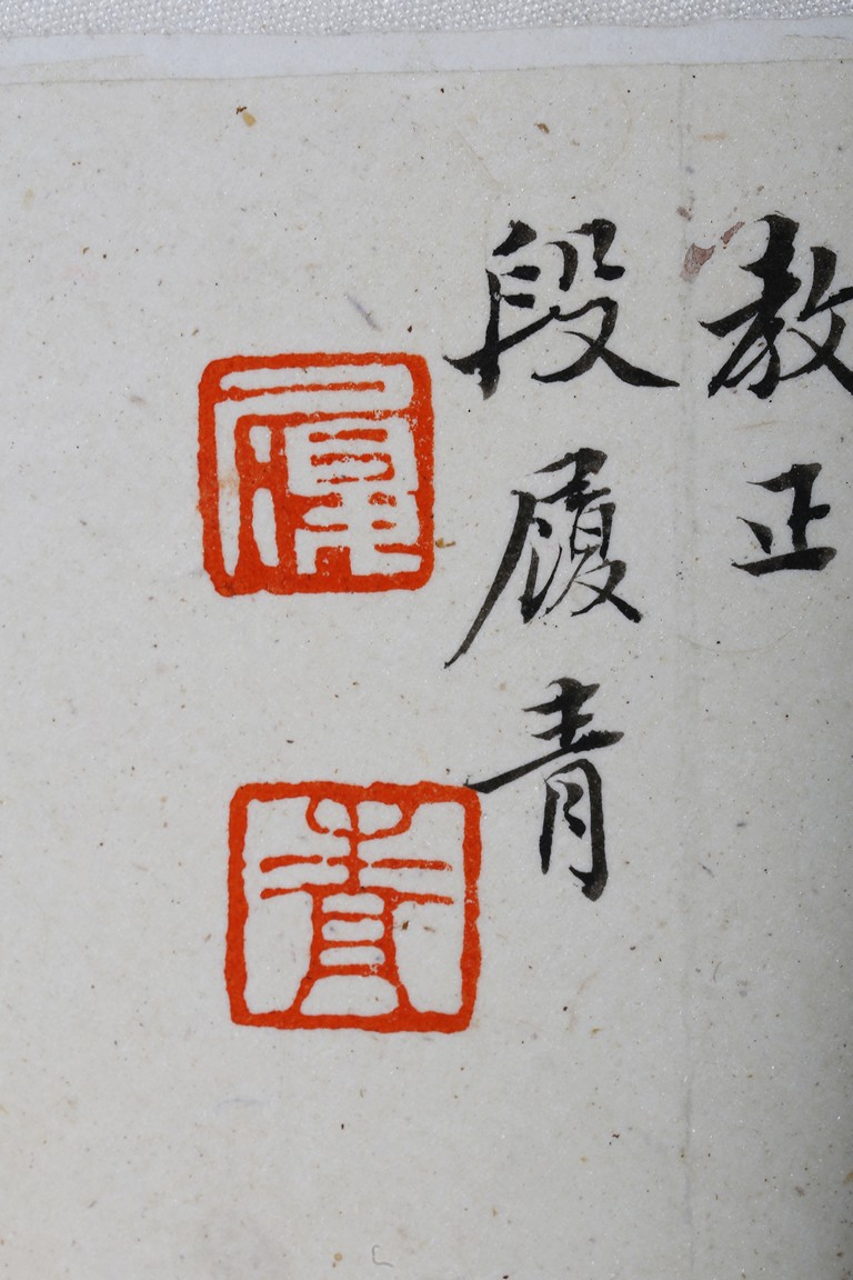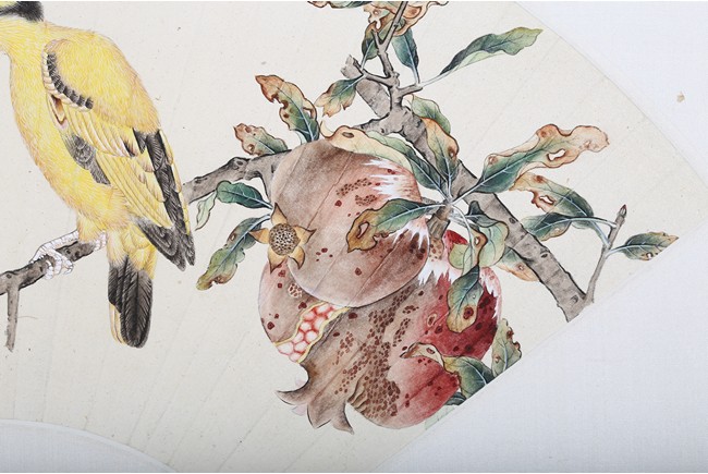 Color and ink on paper. Bird and flower. Mounted for framing. Fan painting. Inscribed and signed Duan Dianqing, with two seals of the artist.