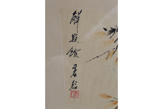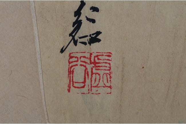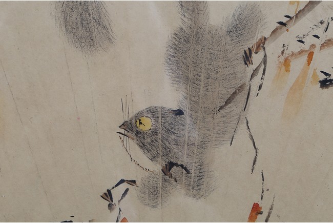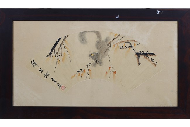Color and ink on paper. Squirrel. Fan painting. Framed. Inscribed and with one seal mark.