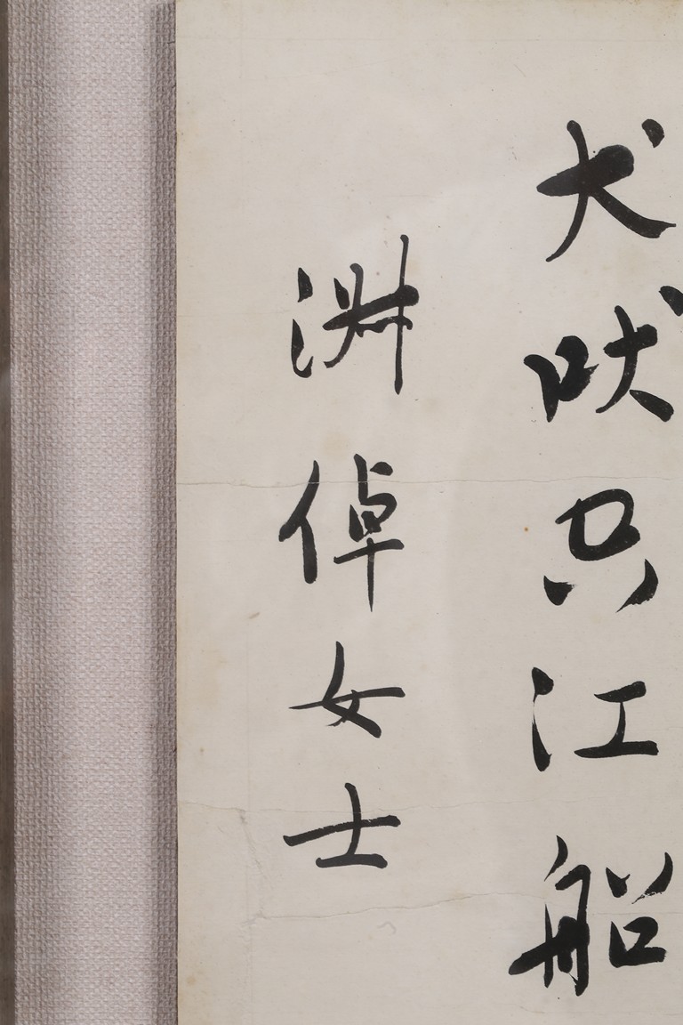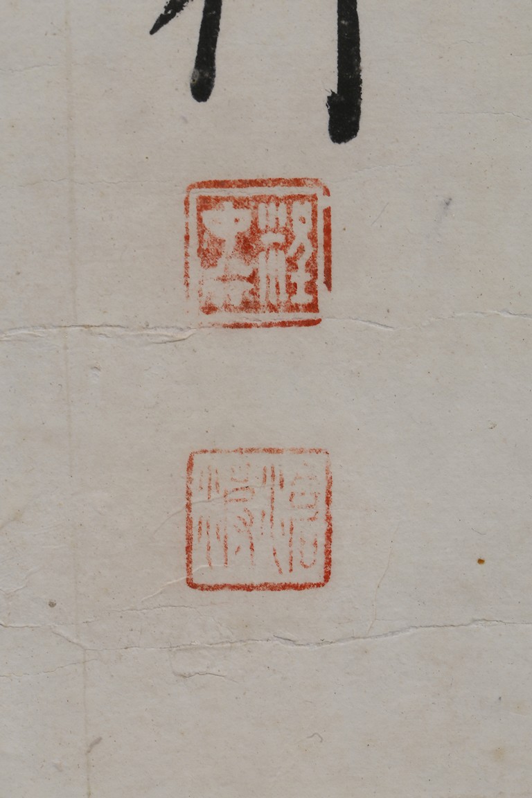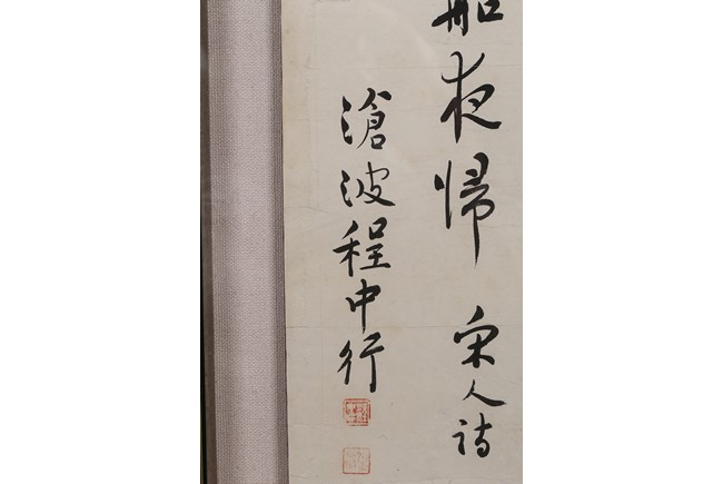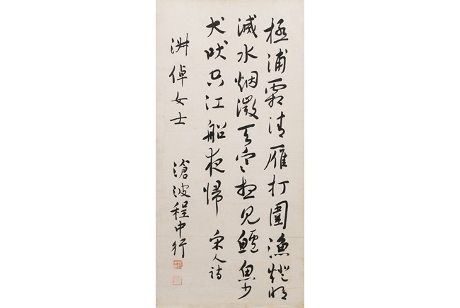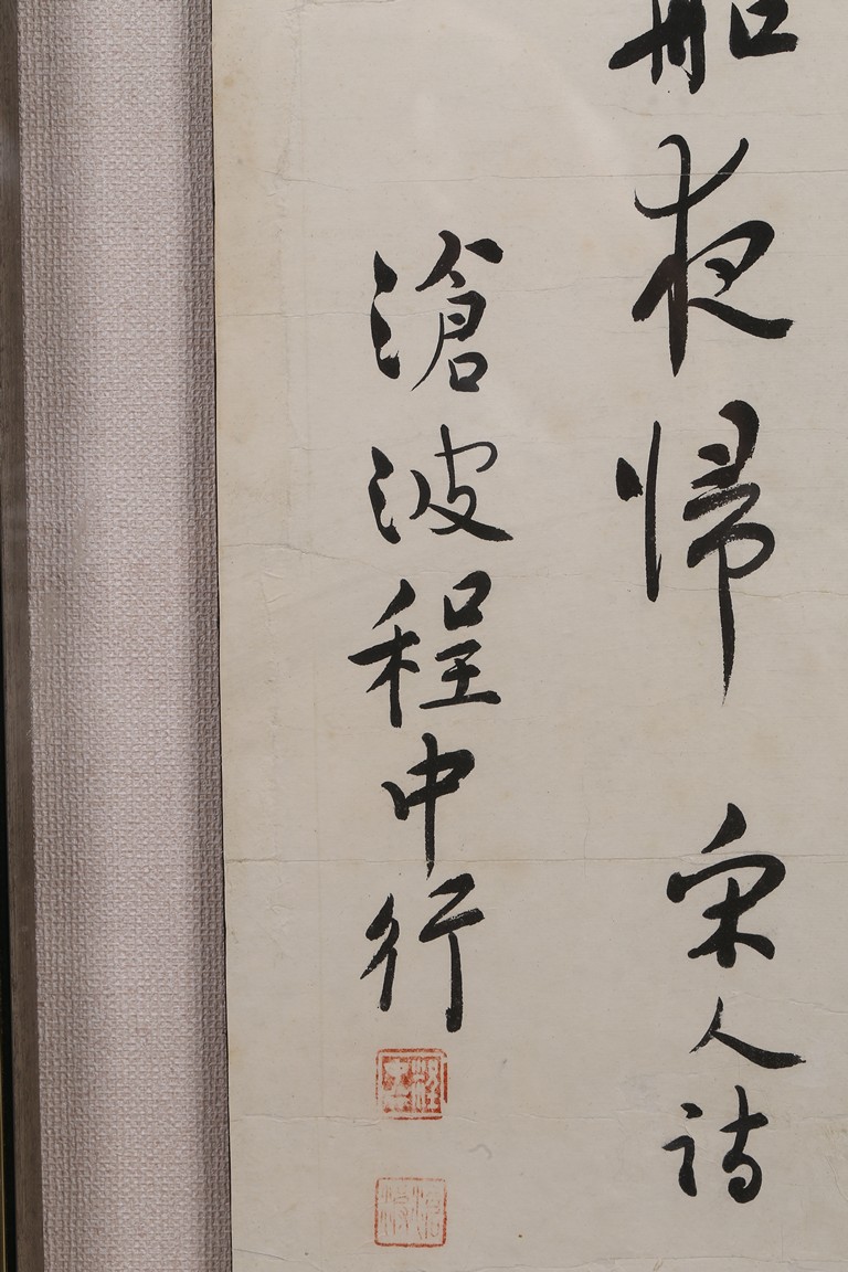 Ink on paper. Running script calligraphy. Framed. Signed Cheng Zhongxing and with a dedication, with two seals of the artist.