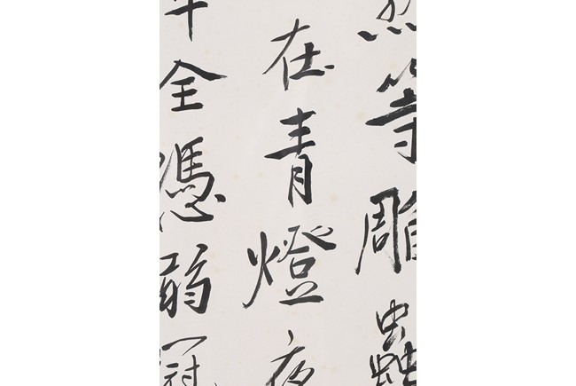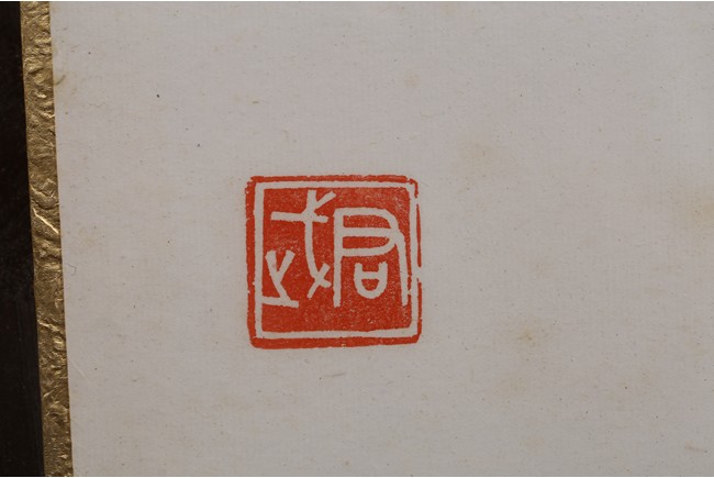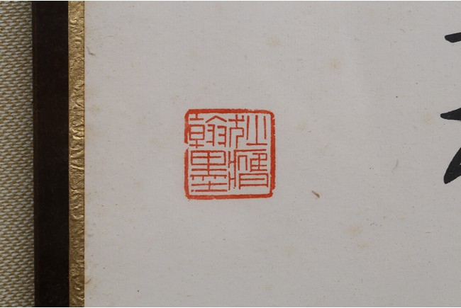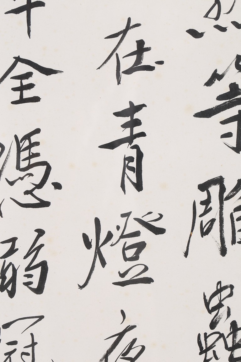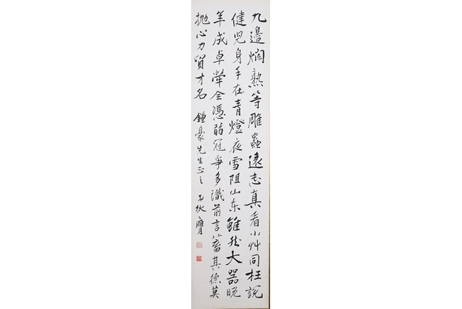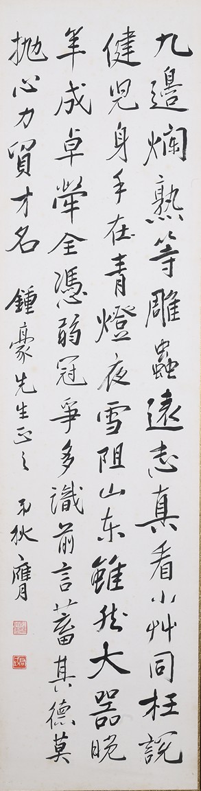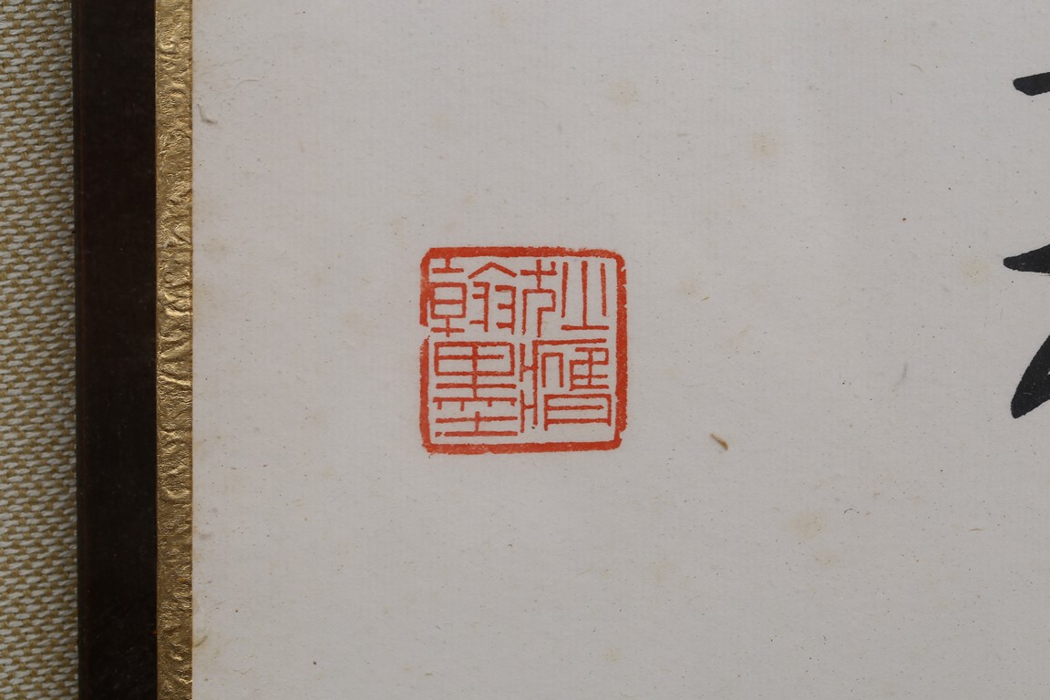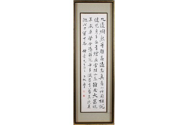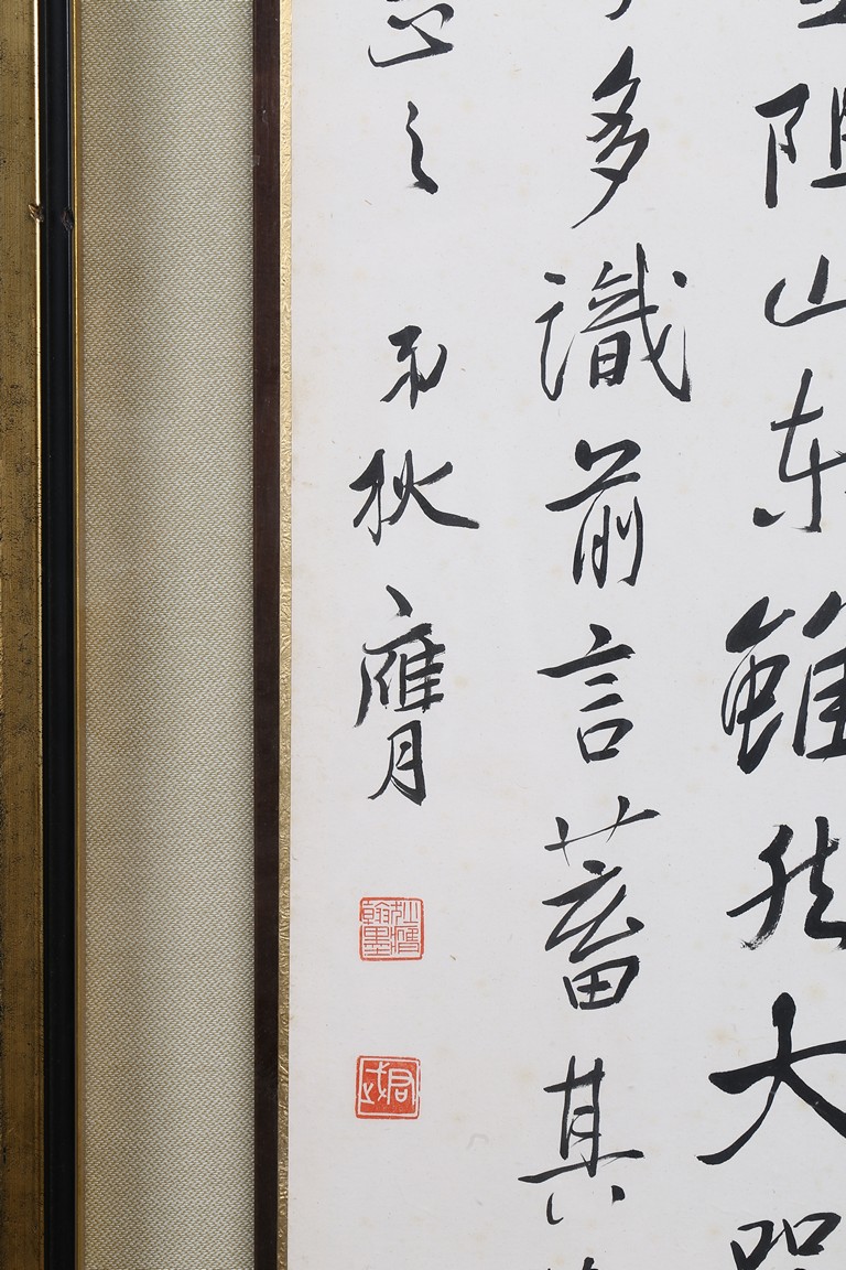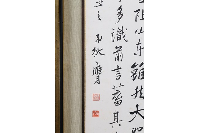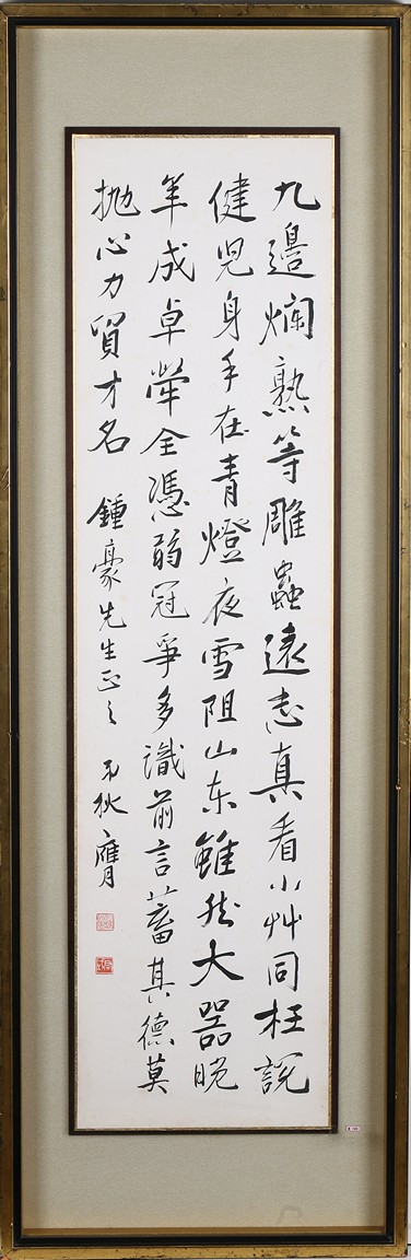 Ink on paper. Running script calligraphy. Framed. Signed and with dedication. With two seals of the artist.