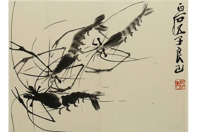 QI LIANGSI: INK ON PAPER 'SHRIMPS' PAINTING 齊良巳 游蝦 水墨紙本