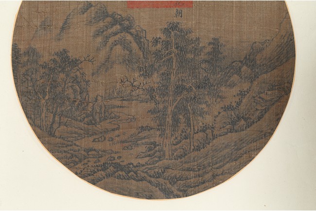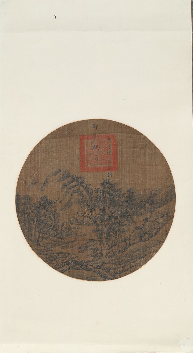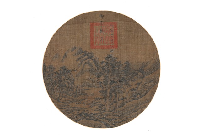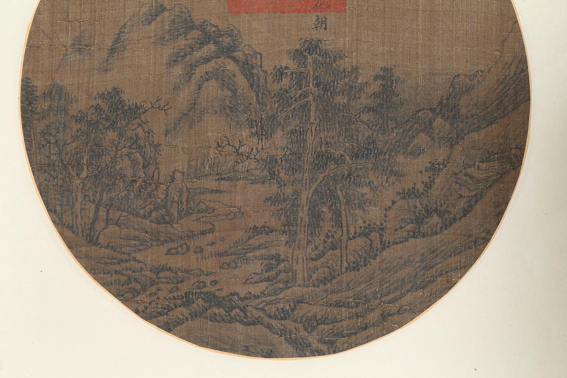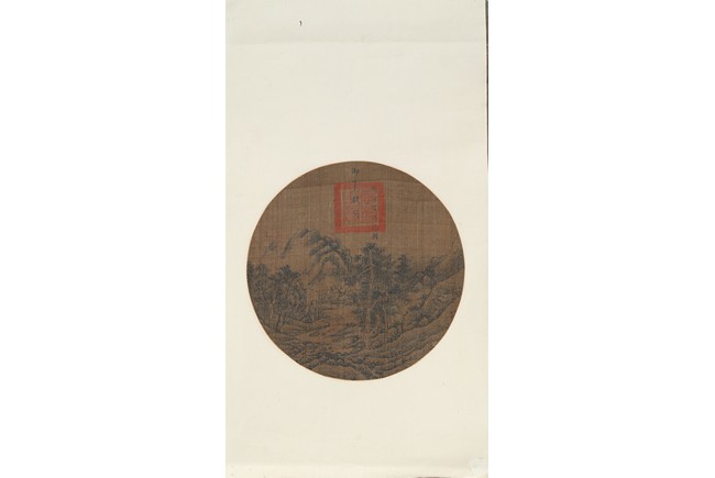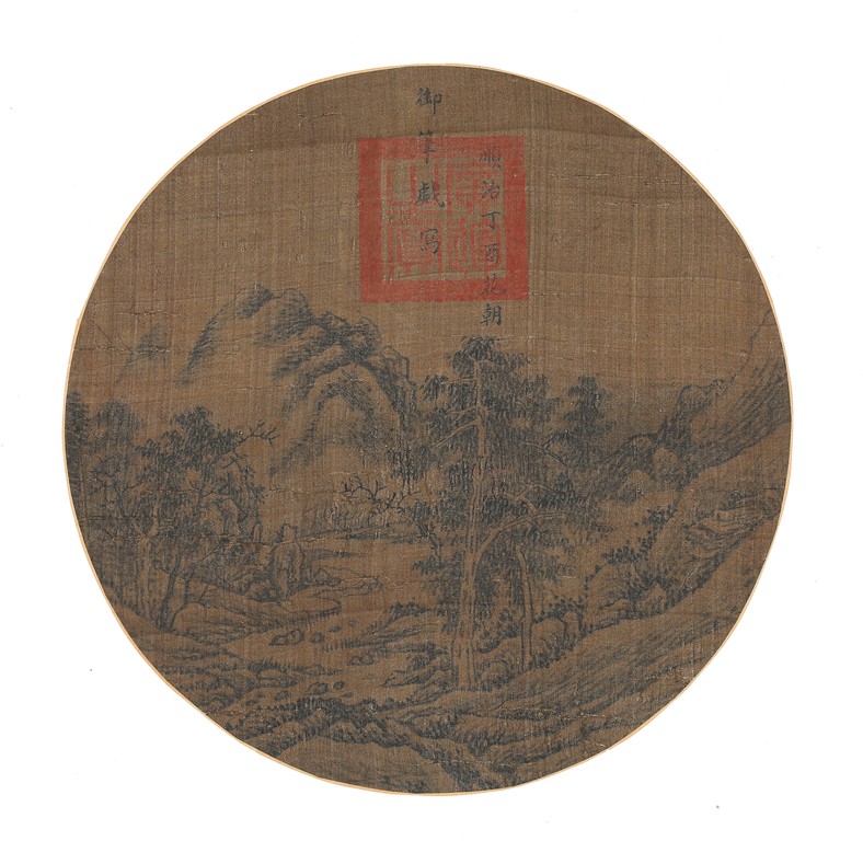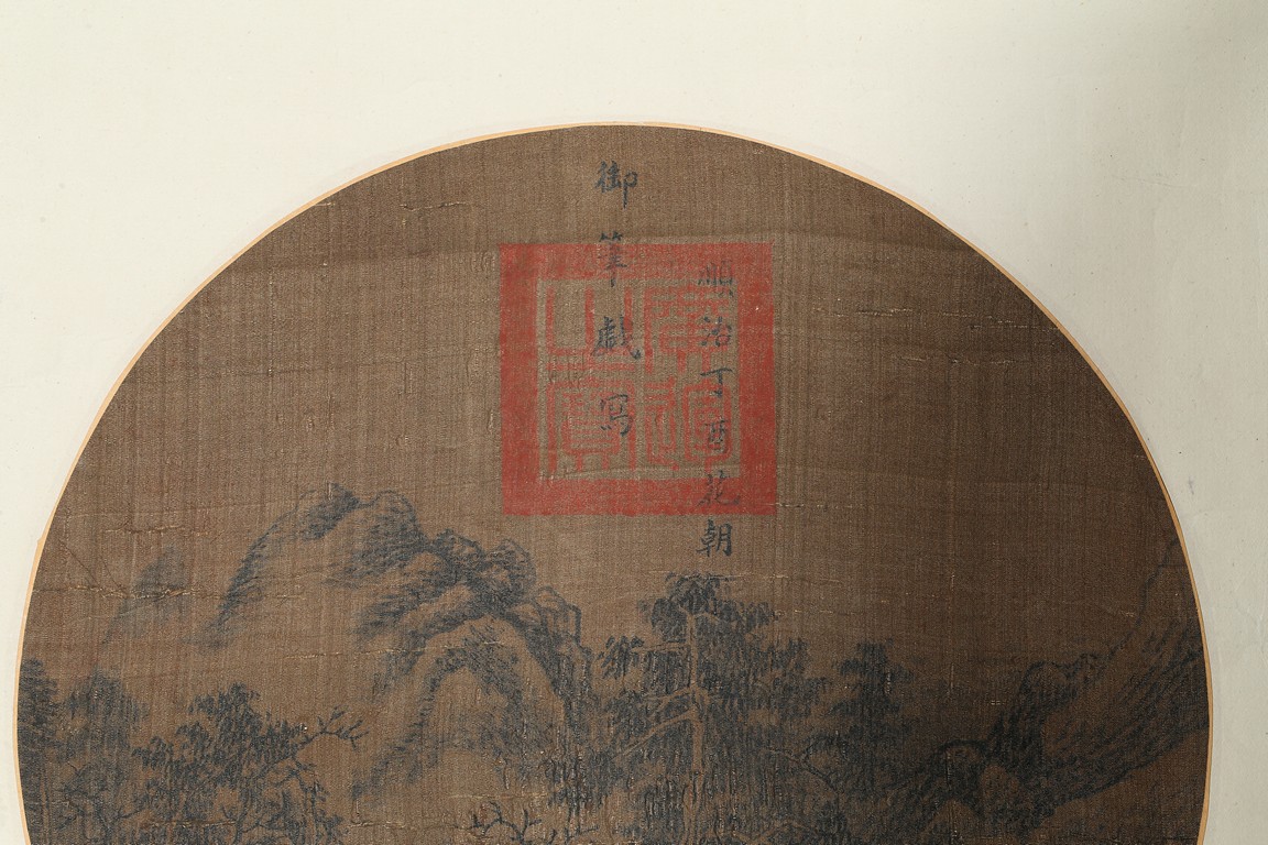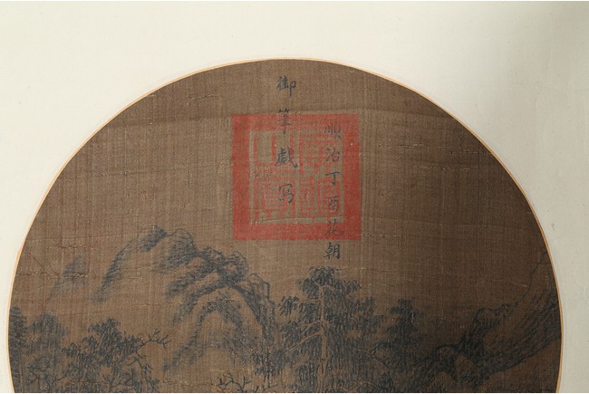 Ink on silk. Landscape. Circular fan painting. Inscribed and with one seal mark. Attributed to Emperor Shunzhi.