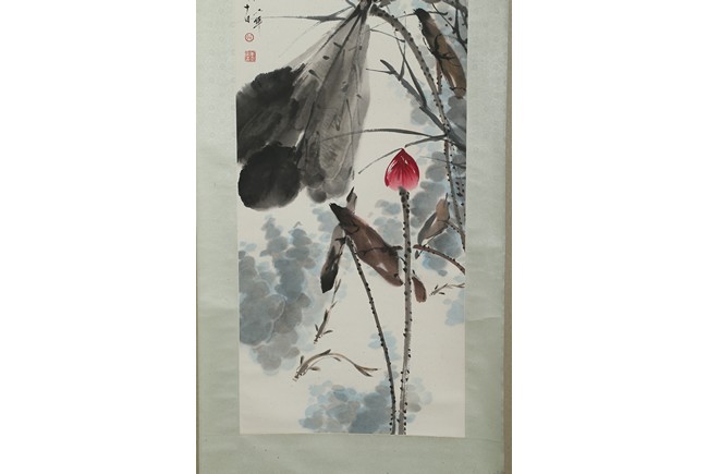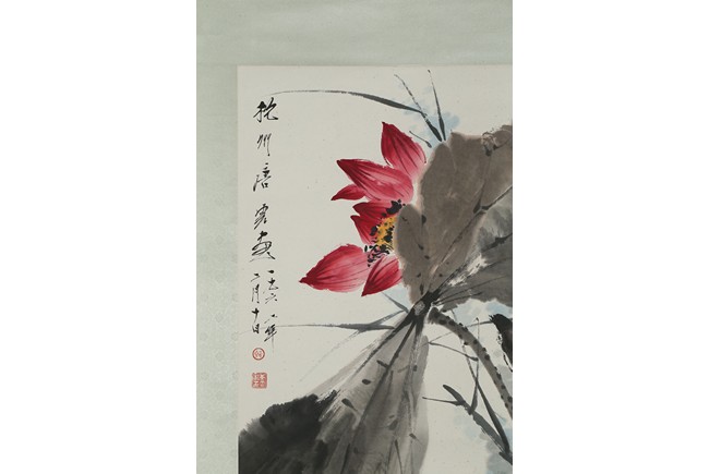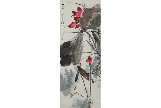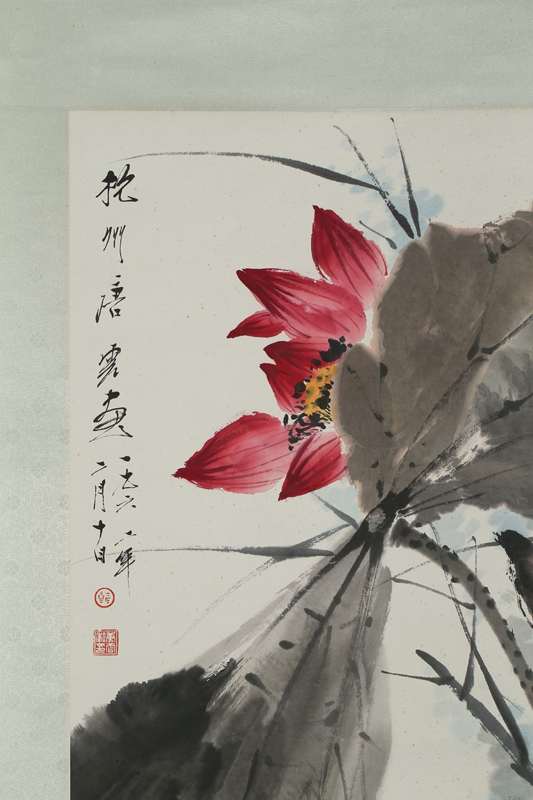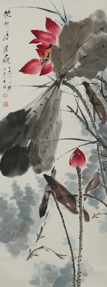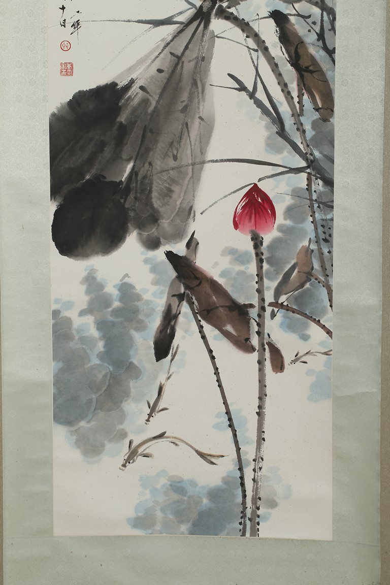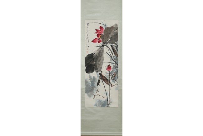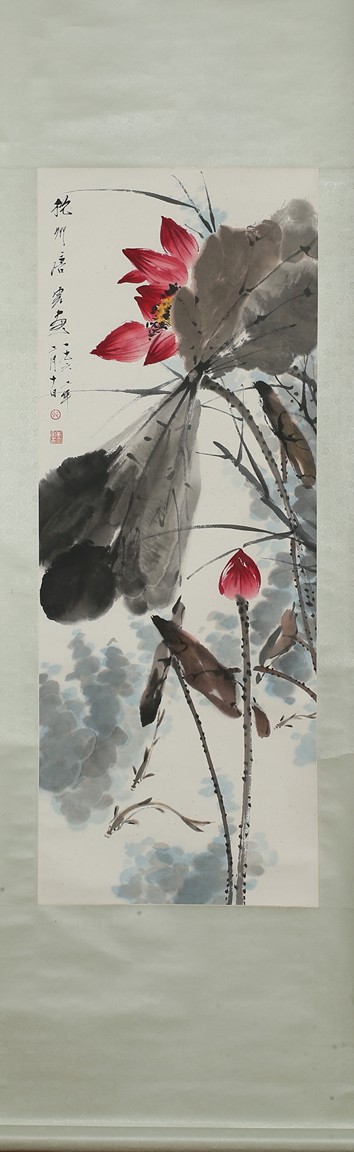 Color and ink on paper. Lotus. Hanging scrolling. Inscribed and signed Tang Yun, with two seals of the artist.
