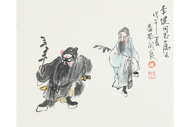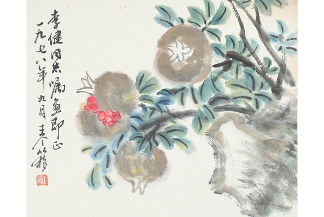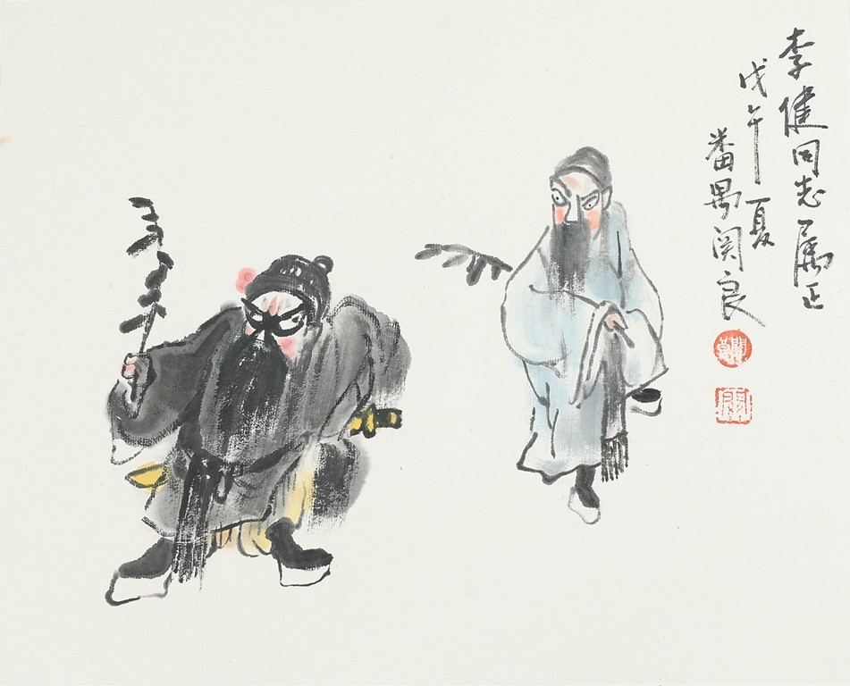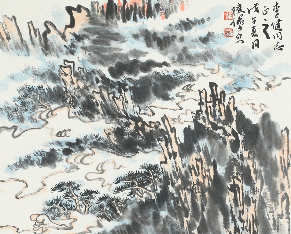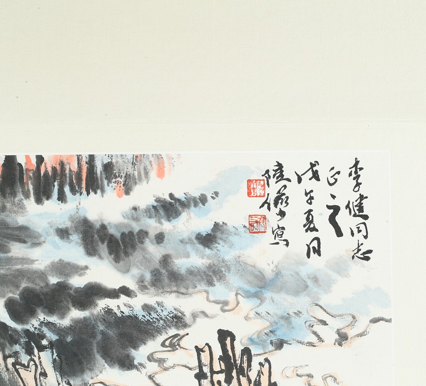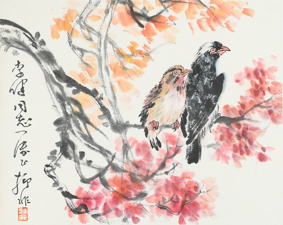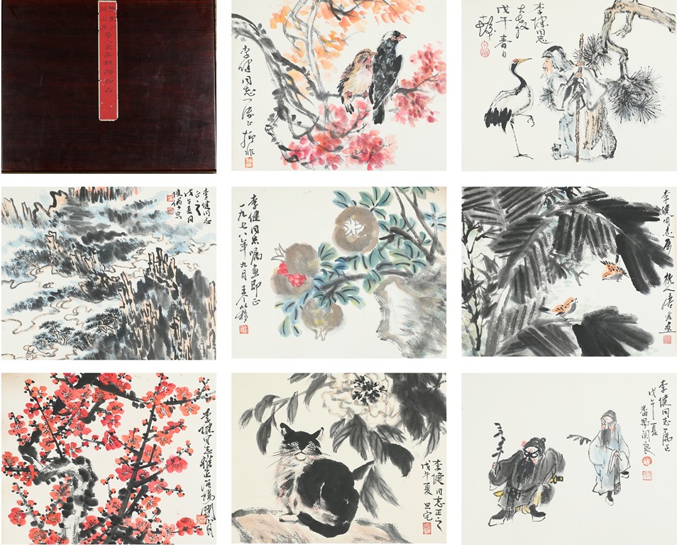 Color and ink on paper. Flowers, birds, figures. Eight-leave album. Artist signed include Lu Yanshao, Guan Shanyue, Tang Yun, Guan Liang, Chen Shifa, Liu Danzhai, Wang Geyi, all dedicated to Li Jian.