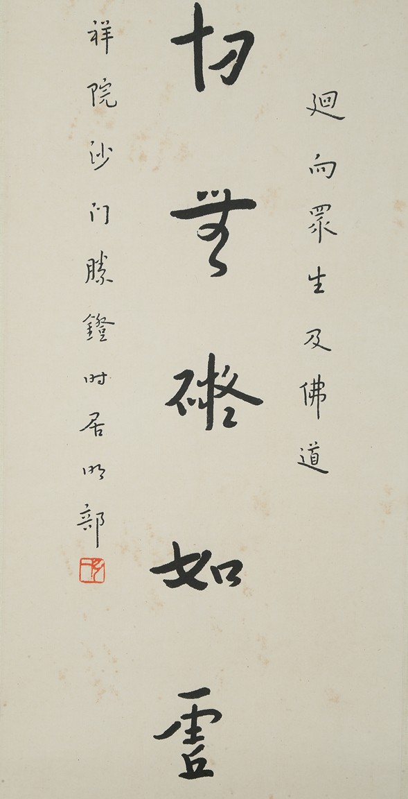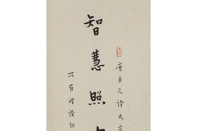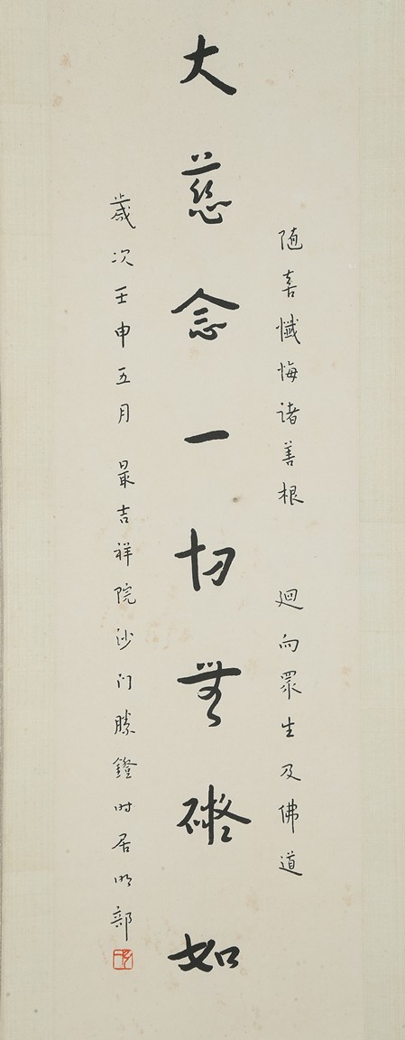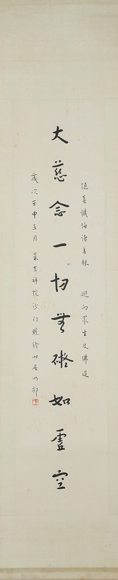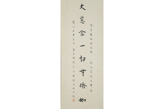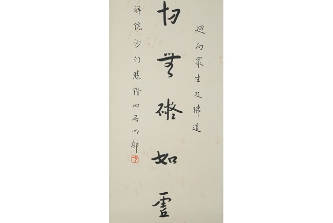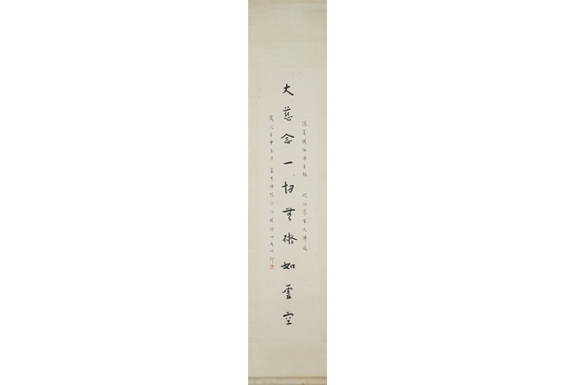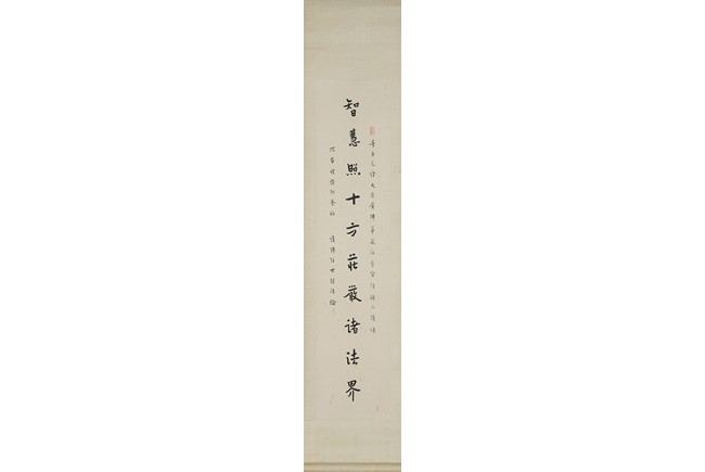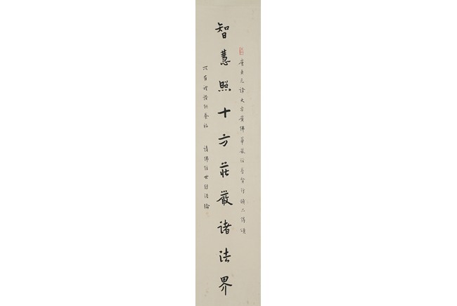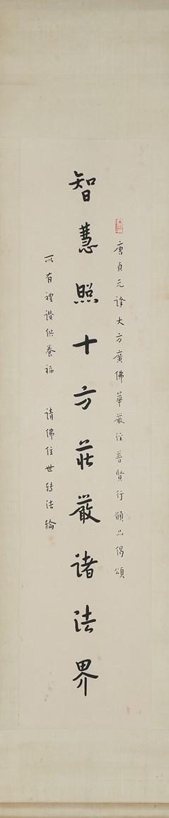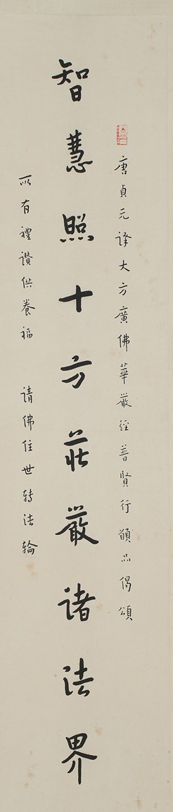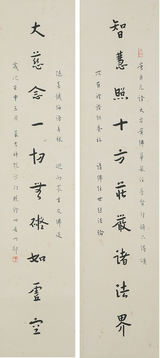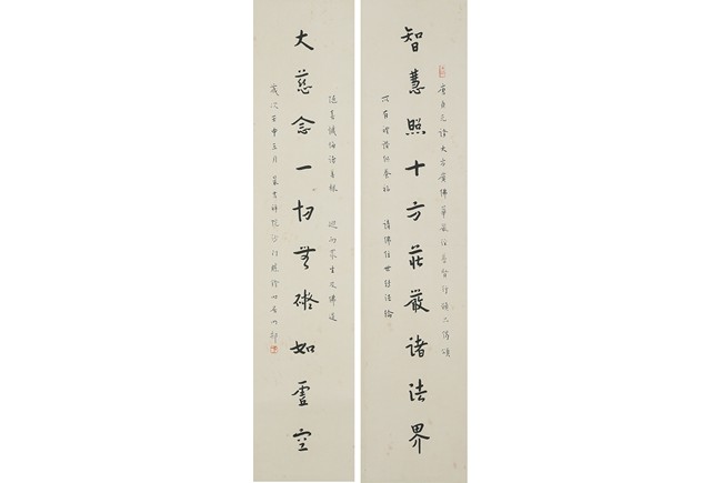 Ink on paper. Regular script ten-character calligraphy couplet. Hanging scrolls. Inscribed, with two seals of the artist.