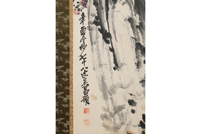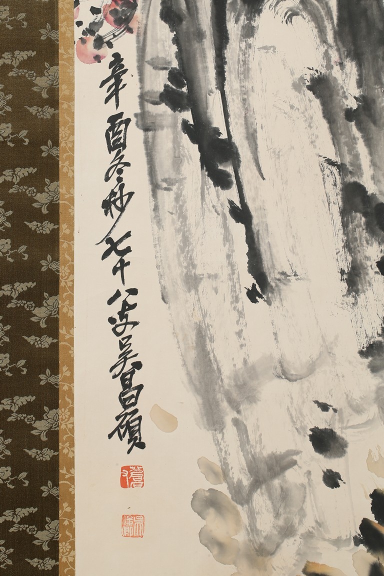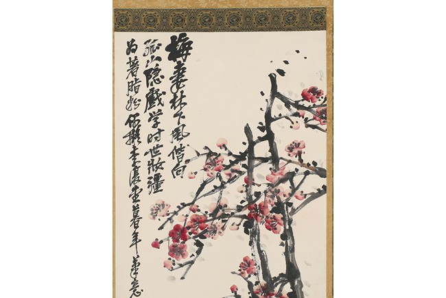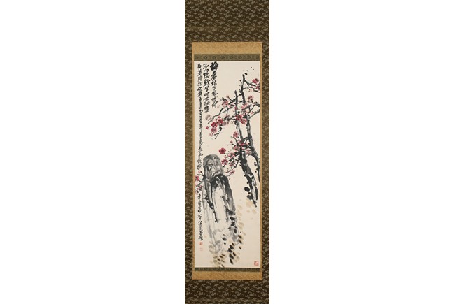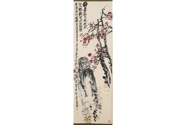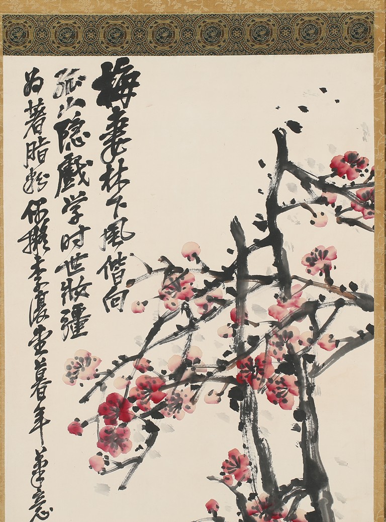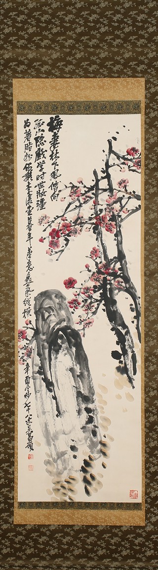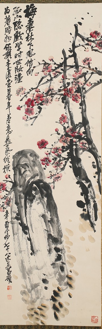 Color and ink on paper. Plum Blossom. Hanging scrolling. Inscribed and signed Wu Changshuo, with three seals of the artist.