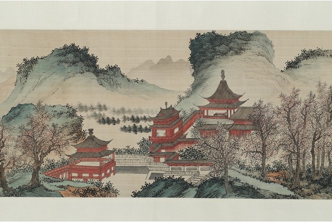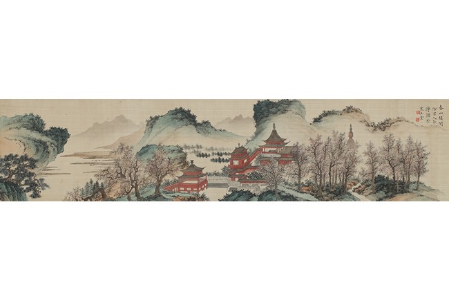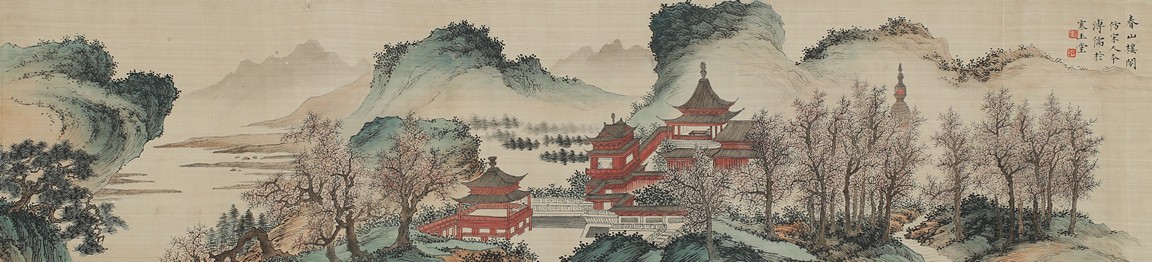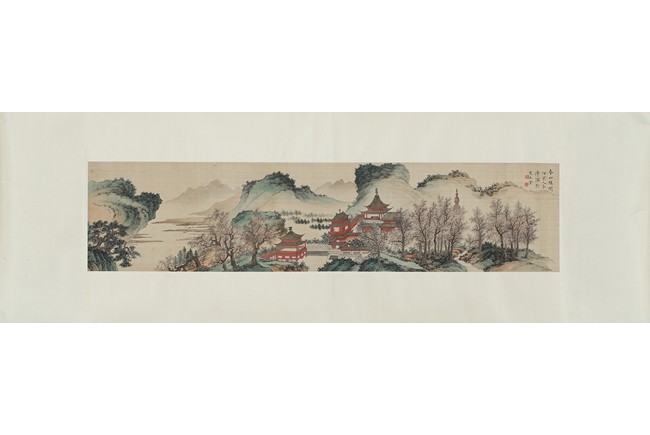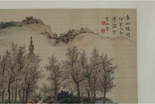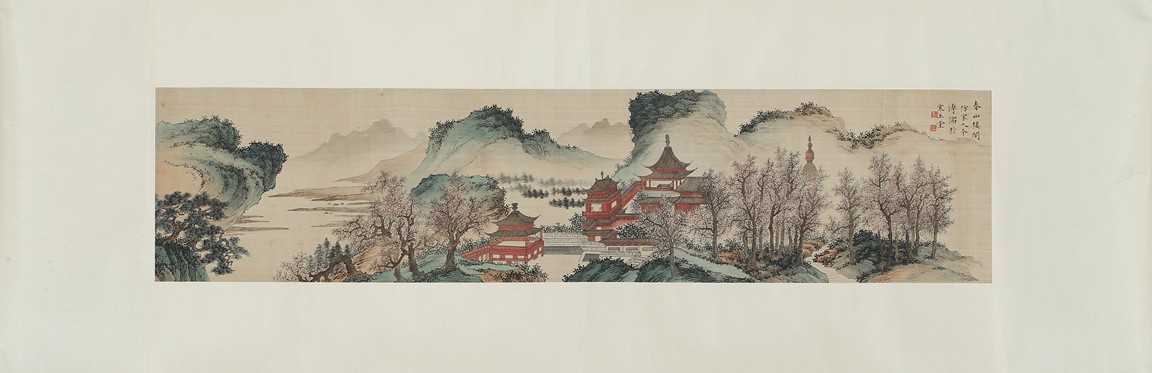 Color and ink on silk. pavilion and terraces in Spring. Mounted for framing. Inscribed and signed Pu Ru, and with two seal marks.