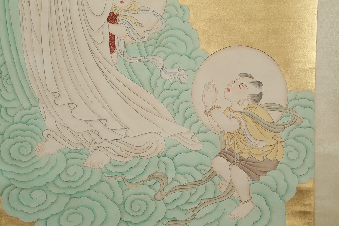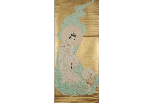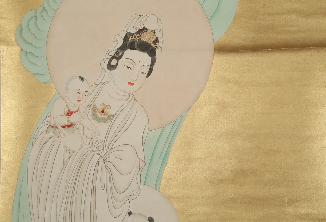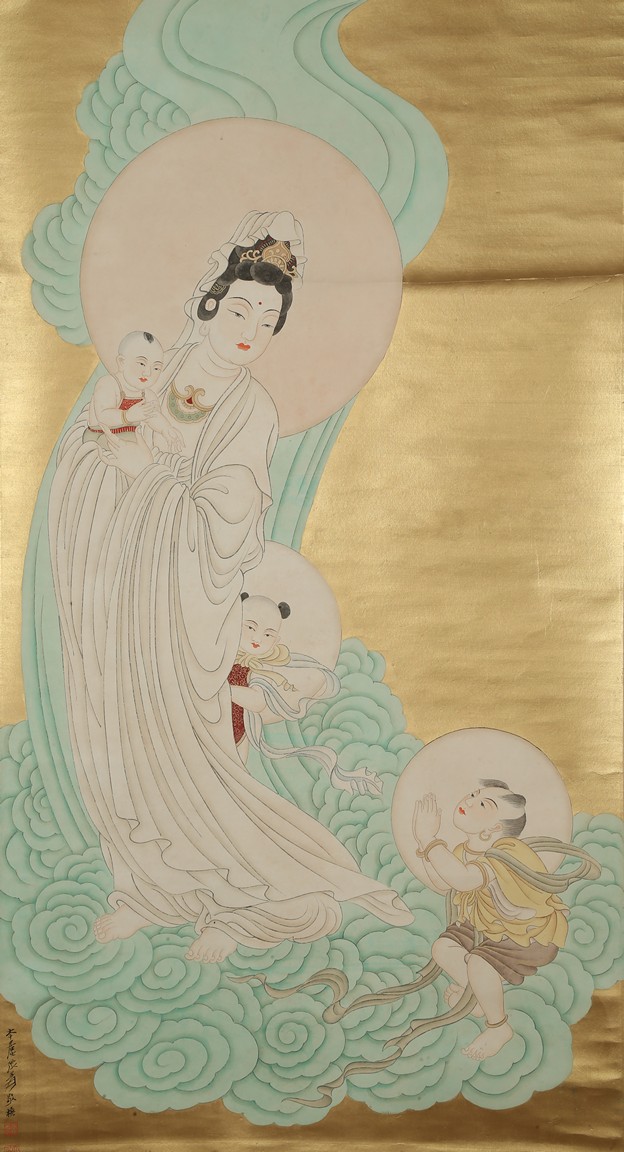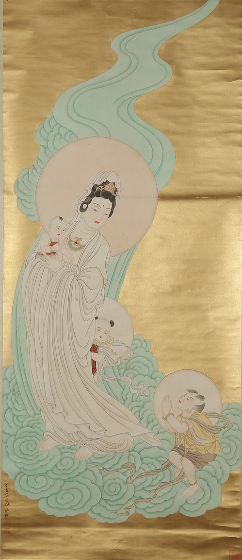 Color and ink on gold paper. Guanyin. Hanging scrolling, inscribed and signed Zhang Yuan with two seals of the artist.