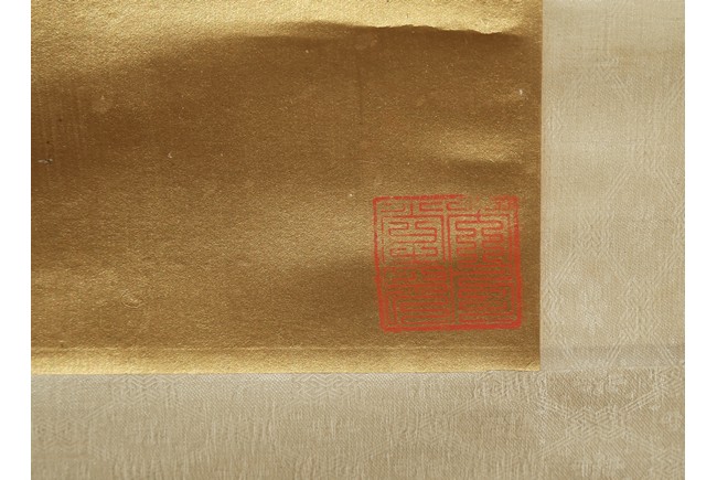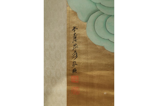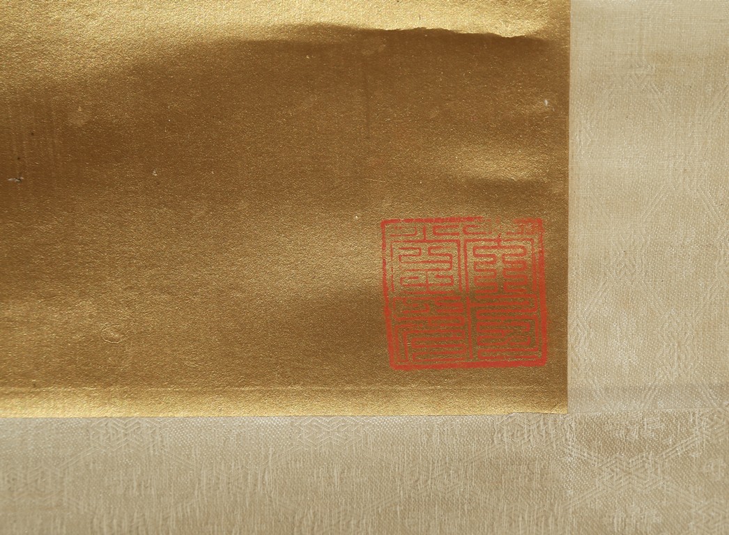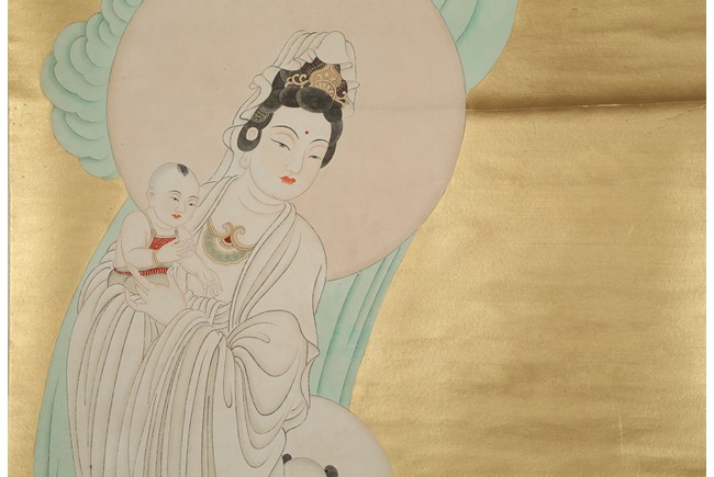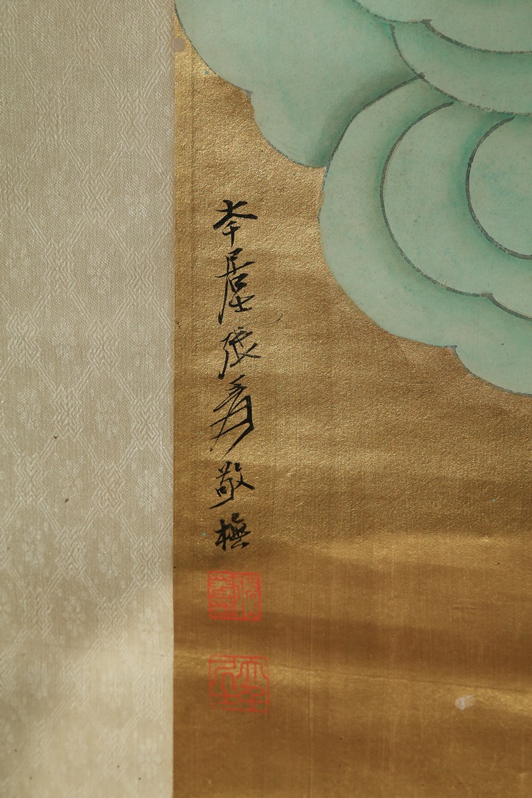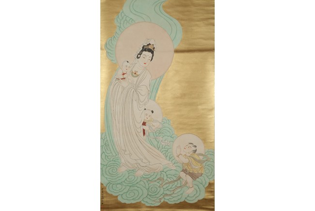 Color and ink on gold paper. Guanyin. Hanging scrolling, inscribed and signed Zhang Yuan with two seals of the artist.