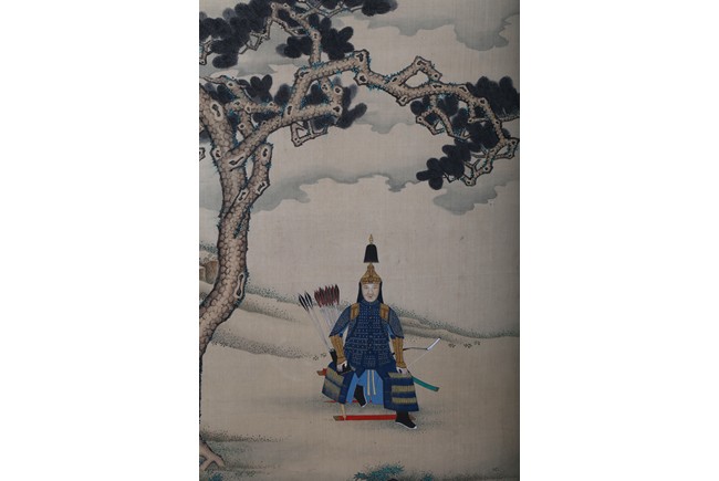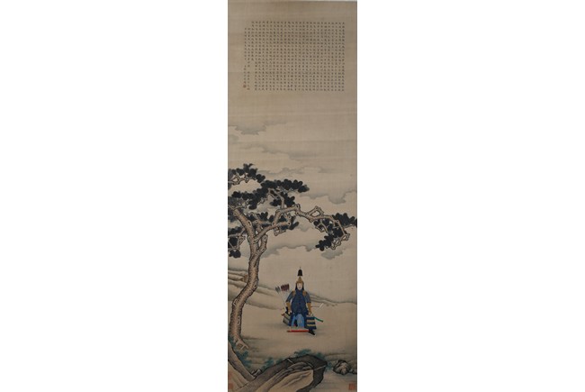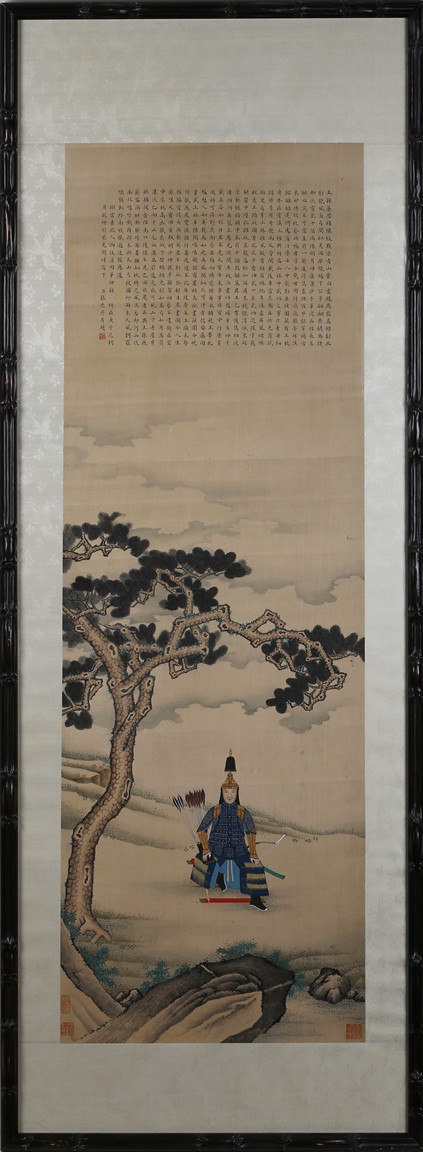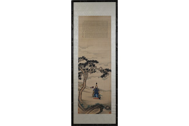Color and ink on silk. Figure. Framed. Inscribed and signed Zhang Tingyan, with four seal marks.