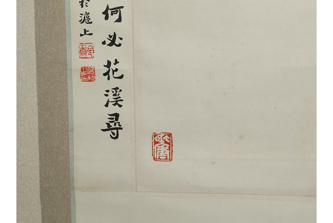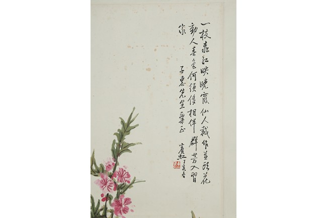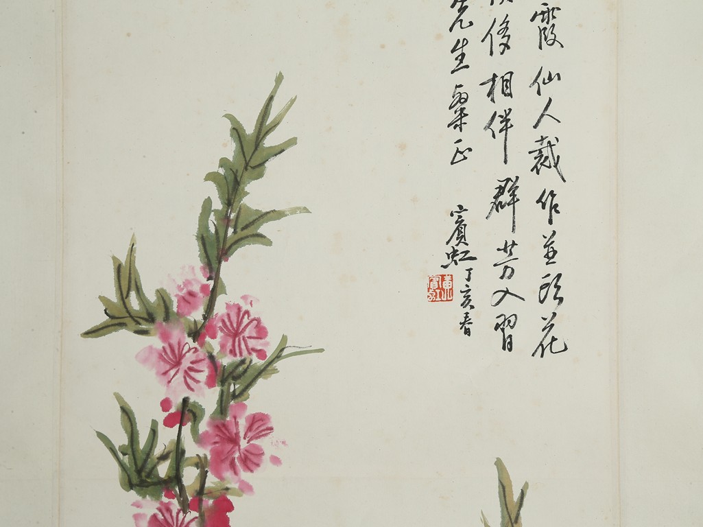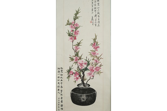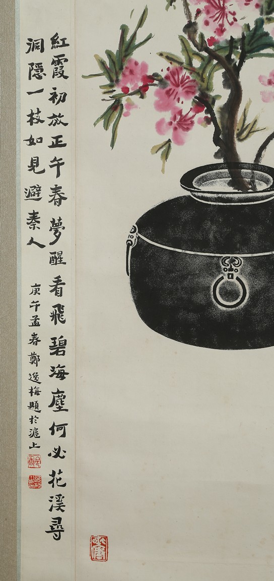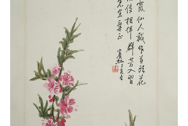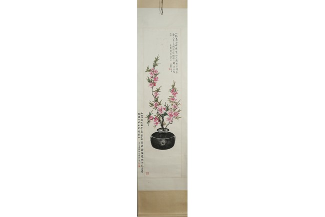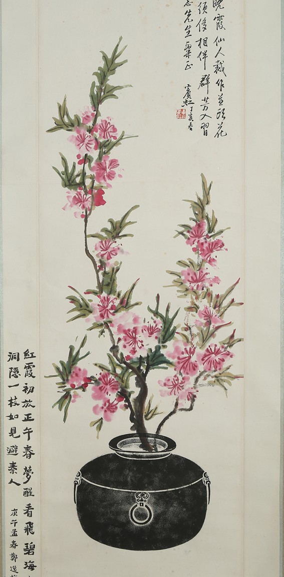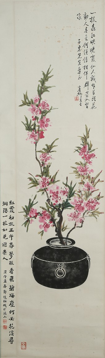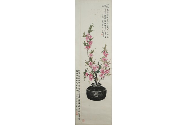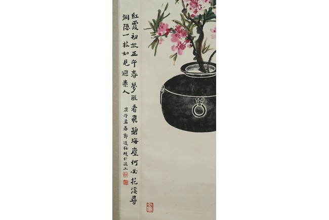 Color and ink on paper. Bogu and flowers. Hanging scrolling. Inscribed and signed Binhong, dedicated to Mr. Zi Hui, with two seals of the artist, and annotation by Zheng Yimei and with two seals of his.