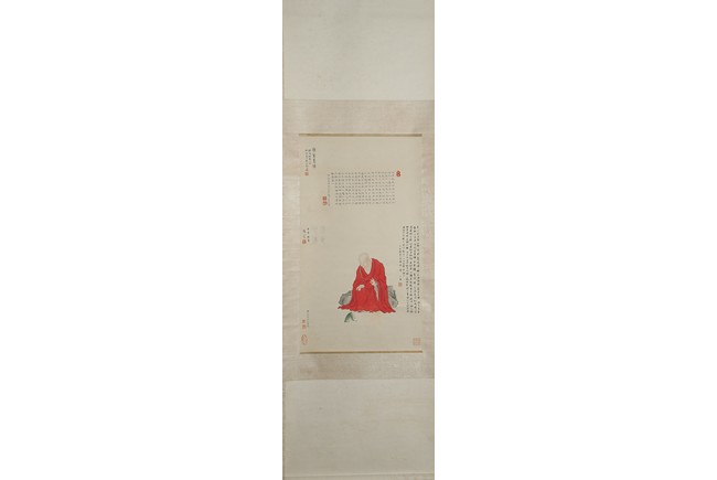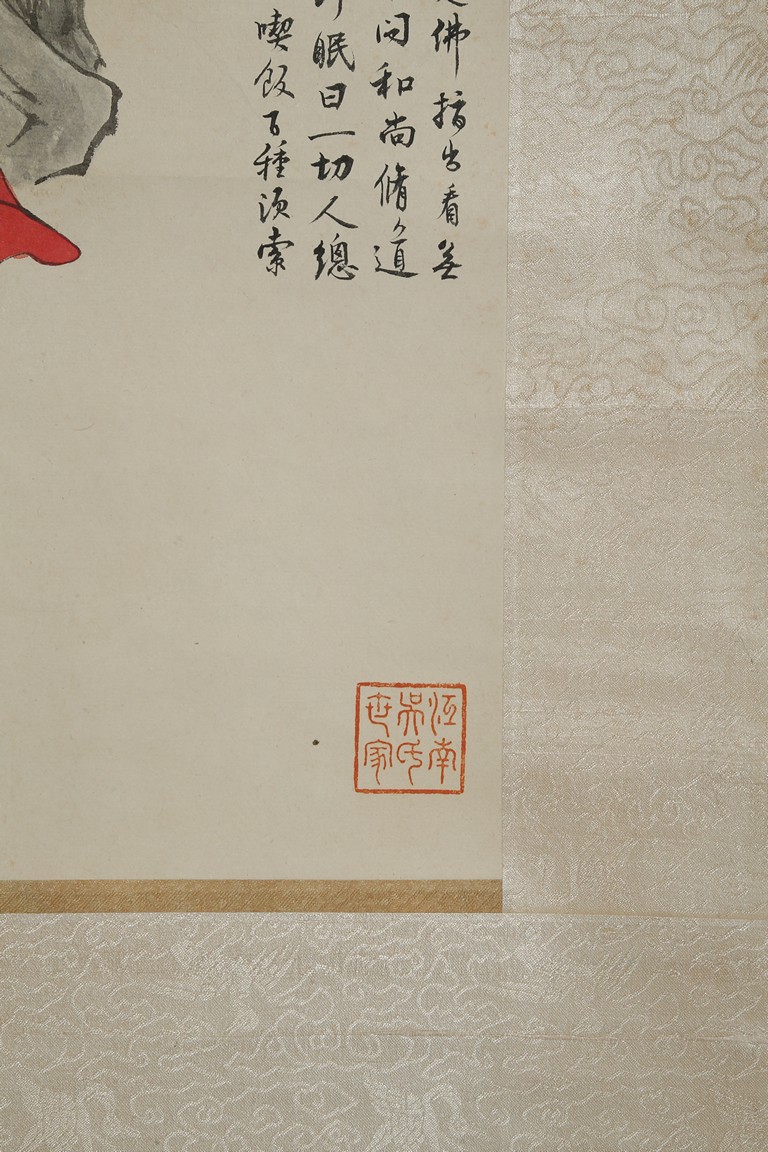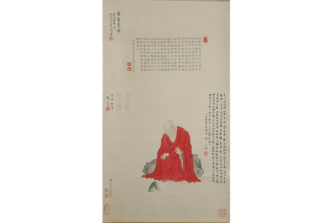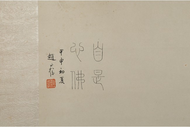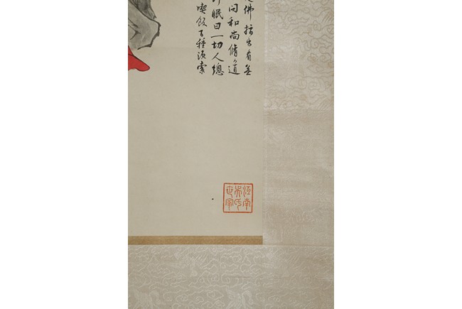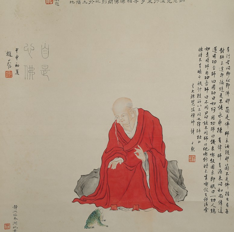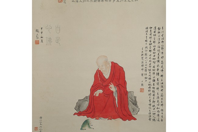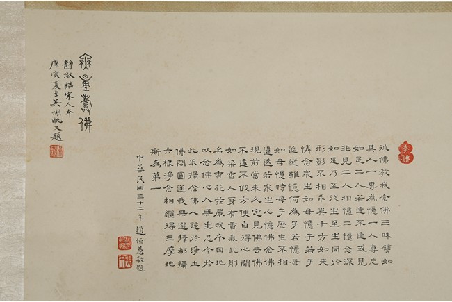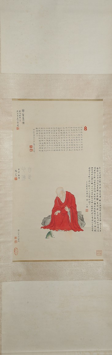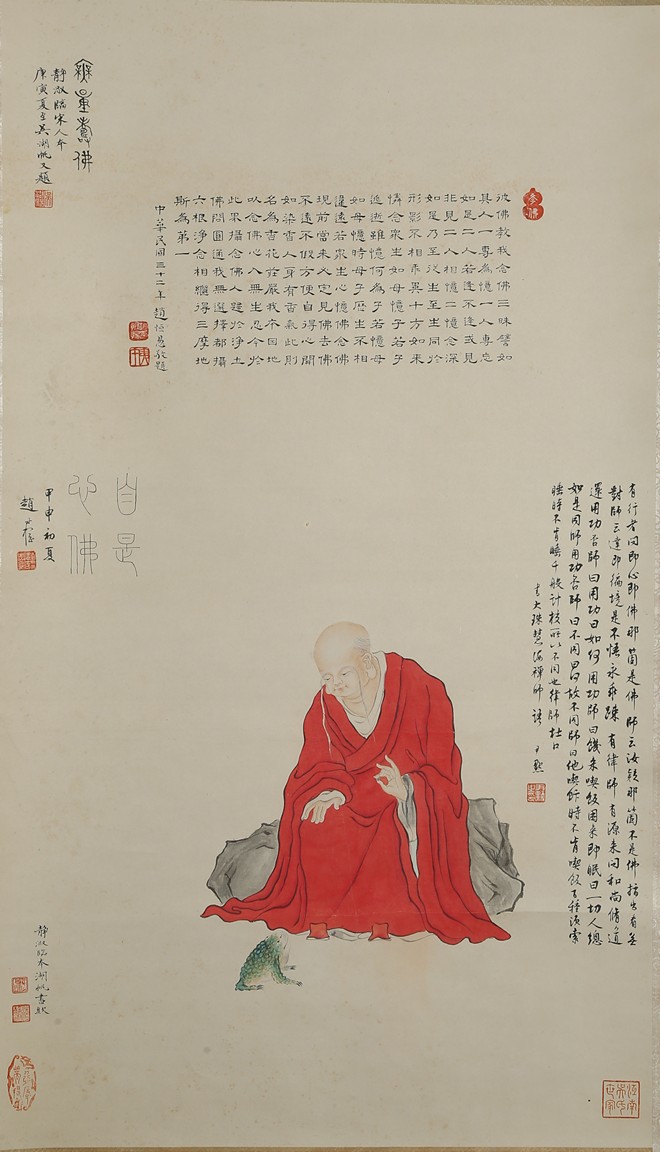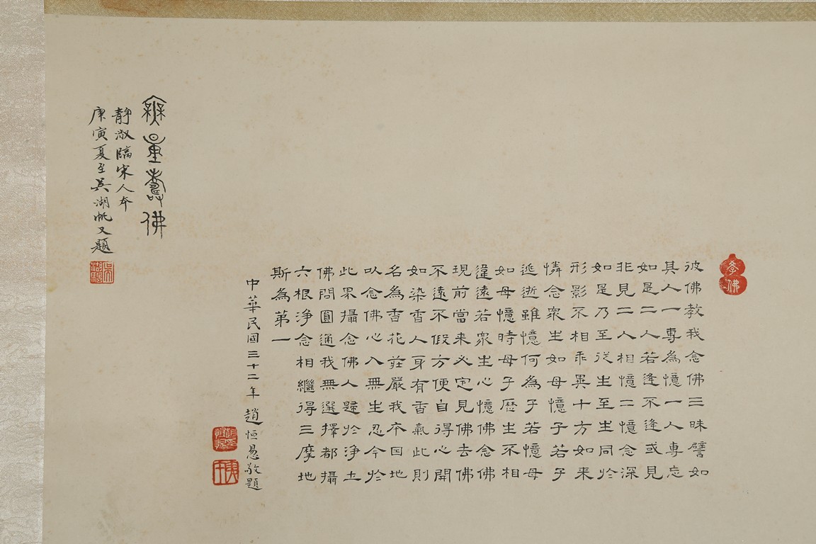 Color and ink on paper. Amitabha. Hanging scrolling. Inscribed and signed Hufan twice with four seals of the artist, with additional annotations signed Yin Mo, Zhao Hengti, and others.