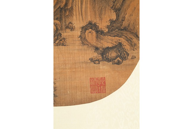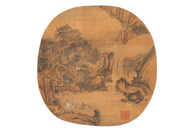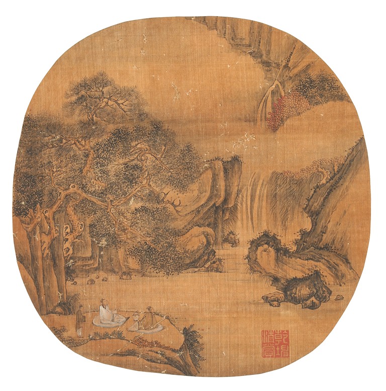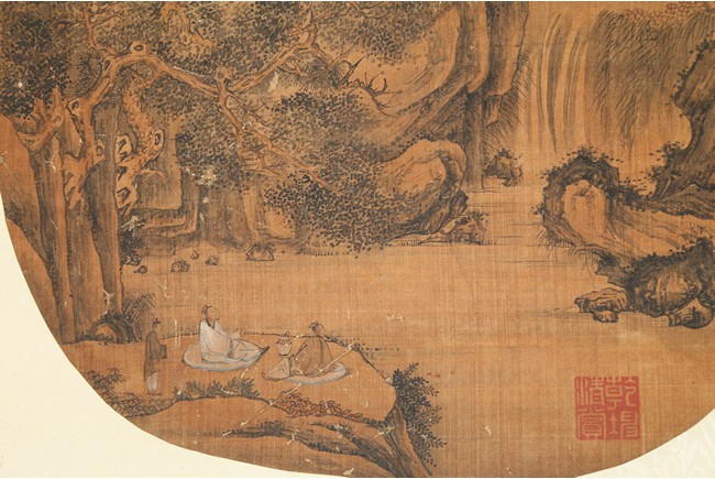 Color and in on silk. Scholars listening to waterfall. Anonymous, with one seal of the artist.