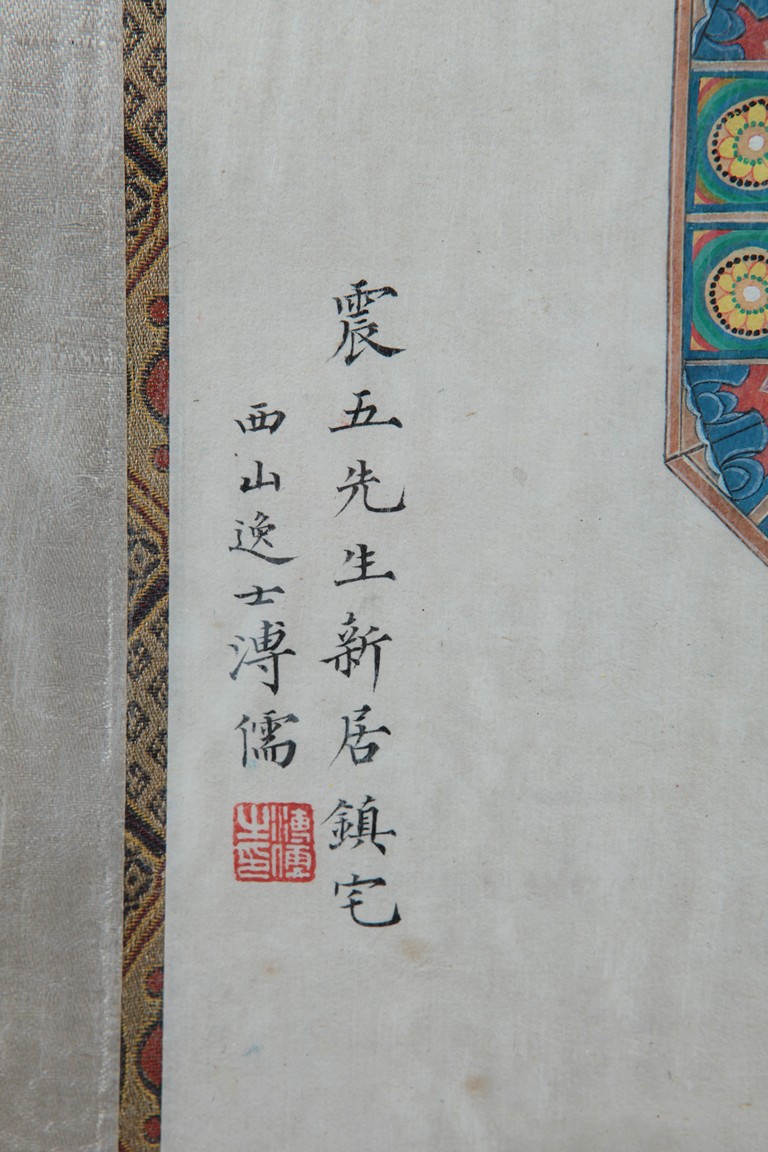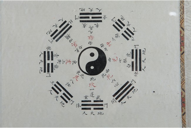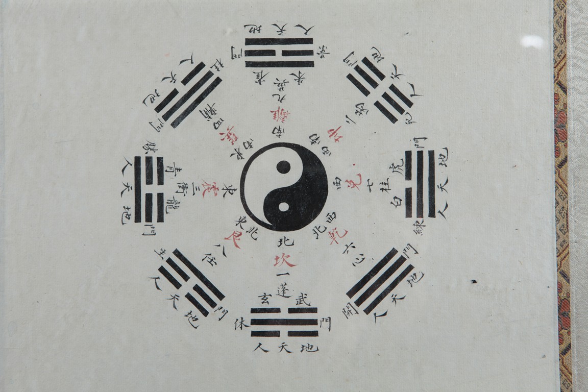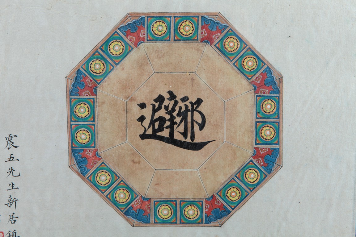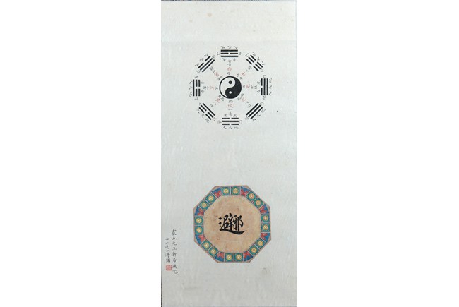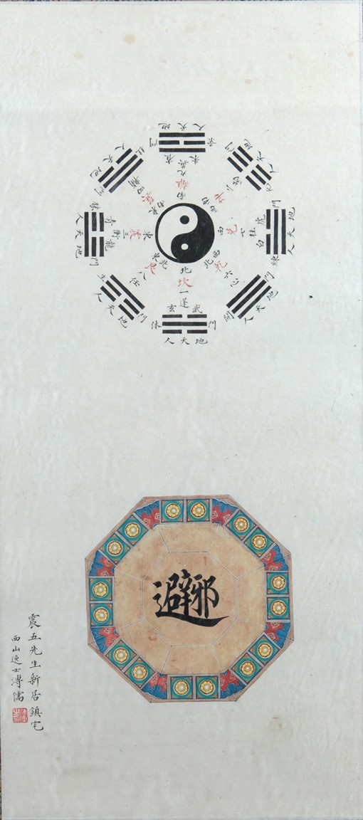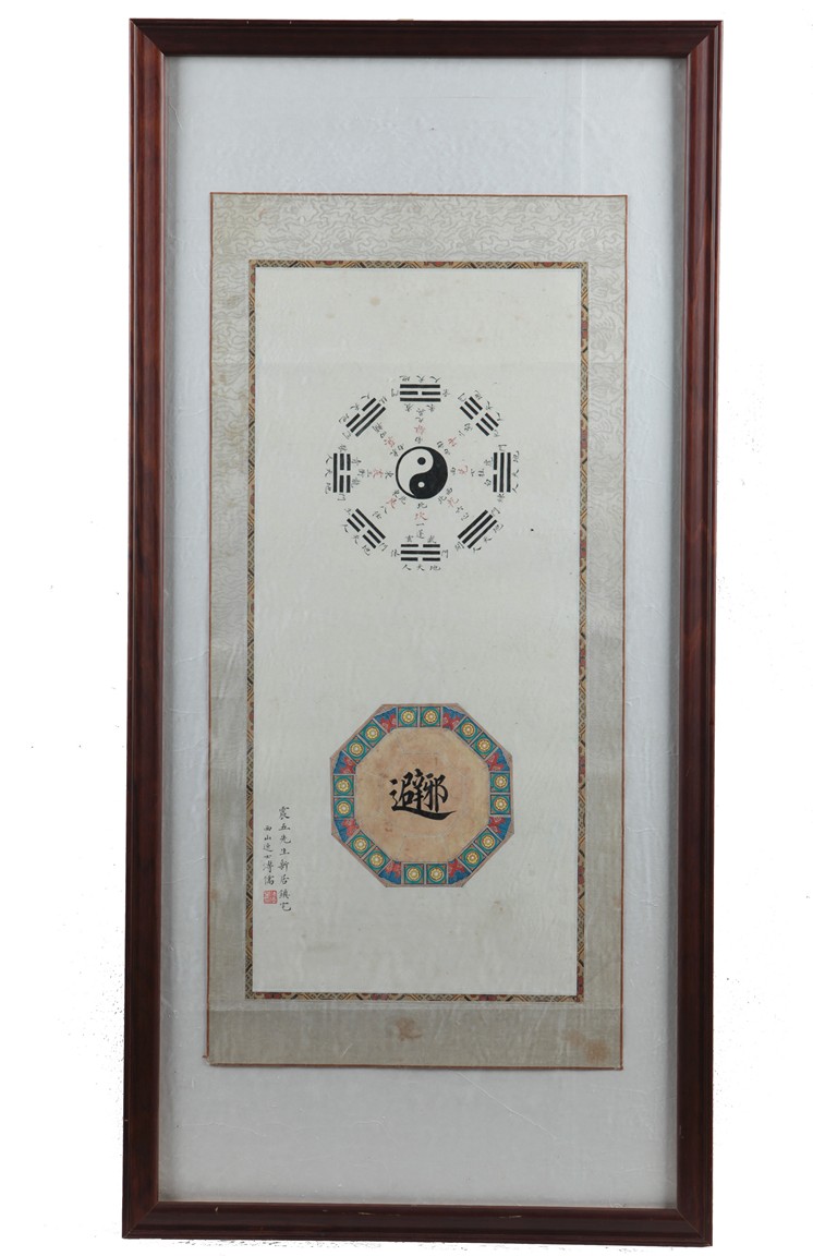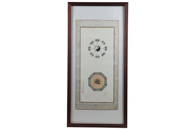 Ink and color on paper. Framed. Bagua. Inscribed and signed, with one seal of the artist.
