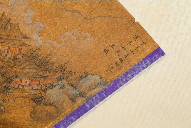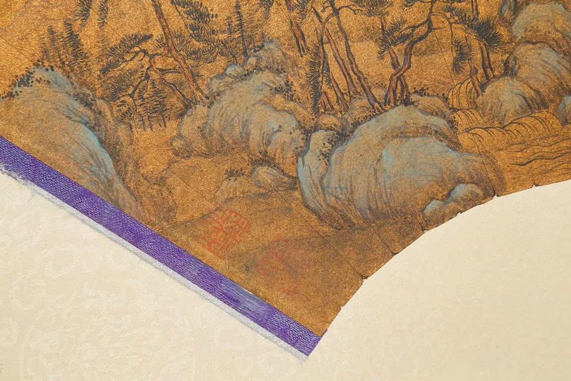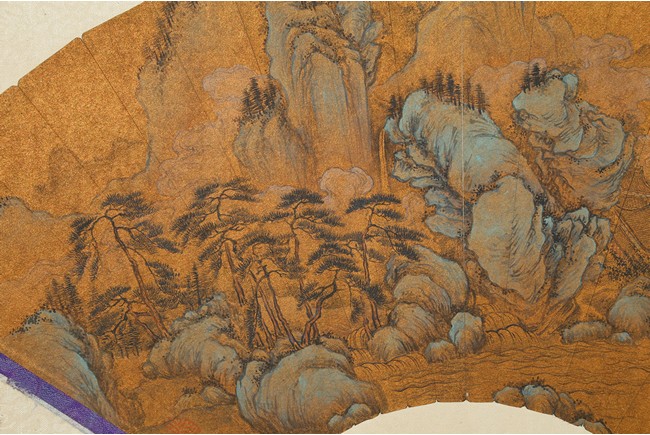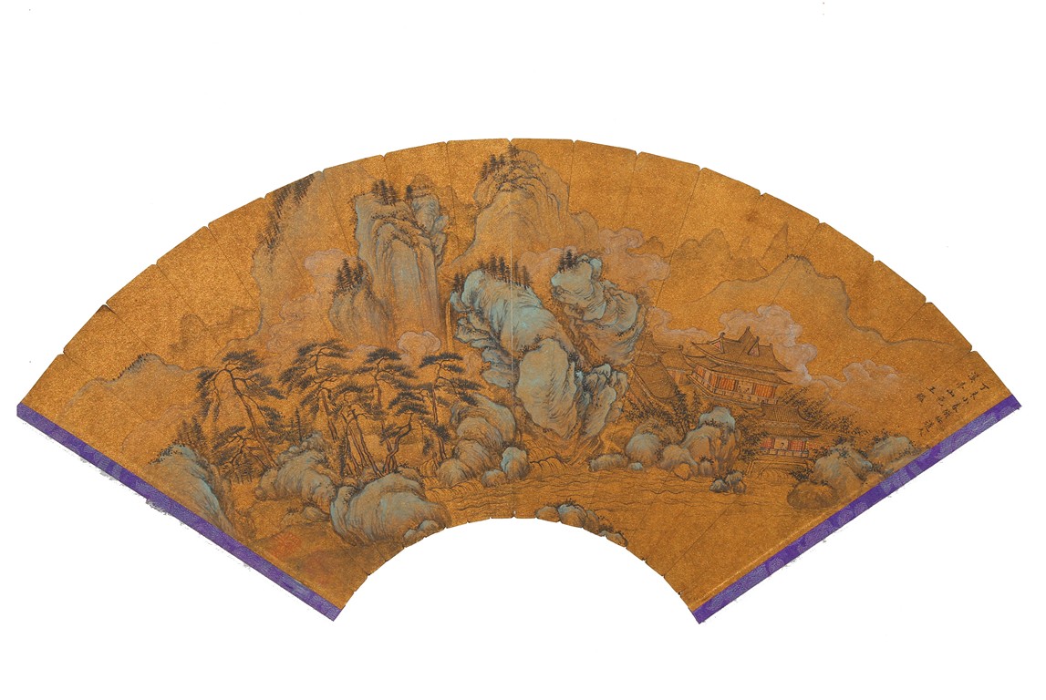 WANG JIAN: COLOR AND INK LANDSCAPE FAN PAINTING 王鑑 山水 金底扇面