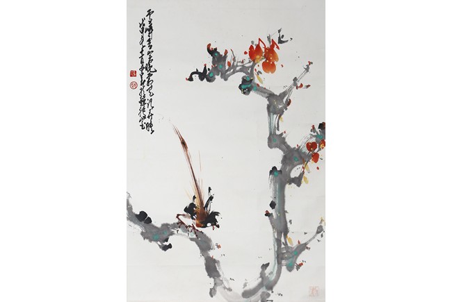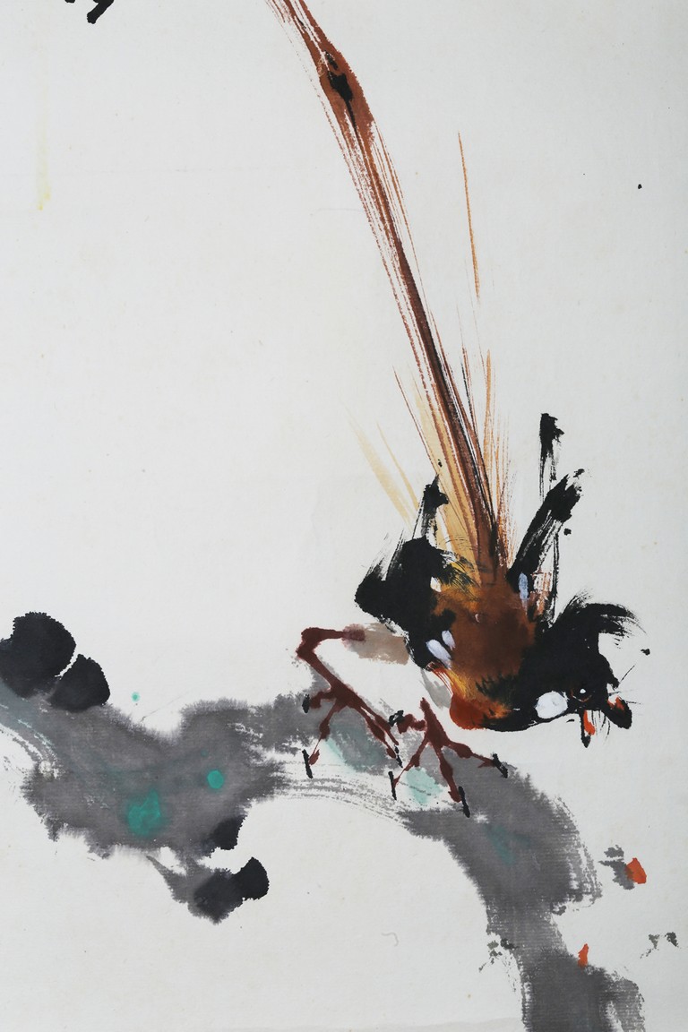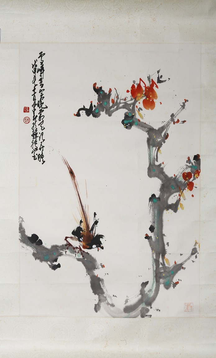 Color and ink on paper. Bird perching on tree branch. Hanging scrolling. Inscribed and signed, with three seals of the artist.