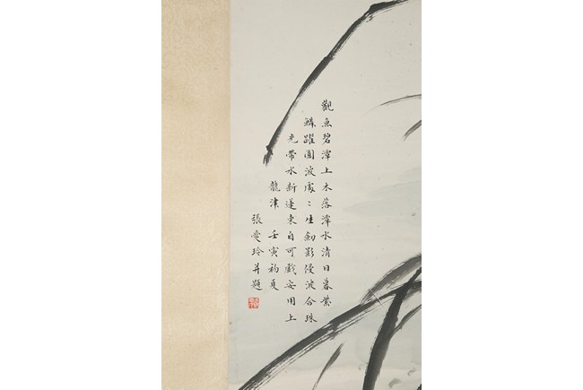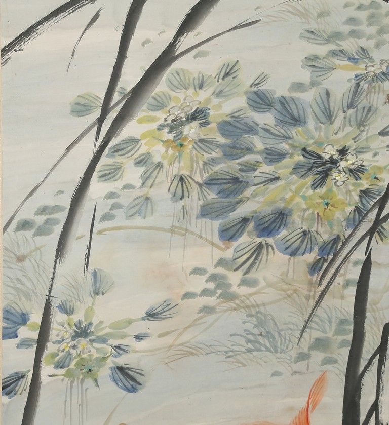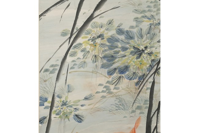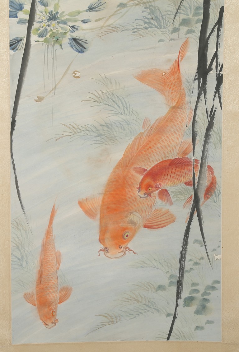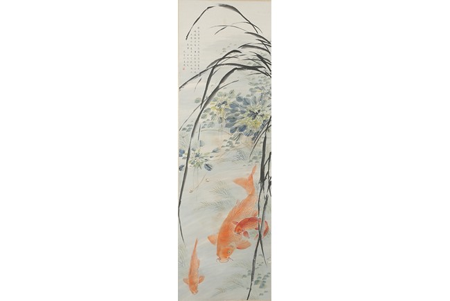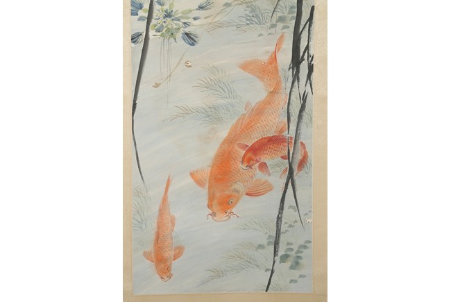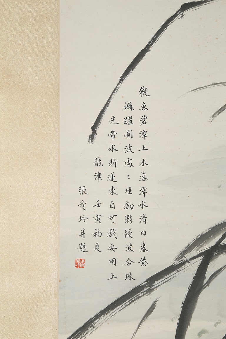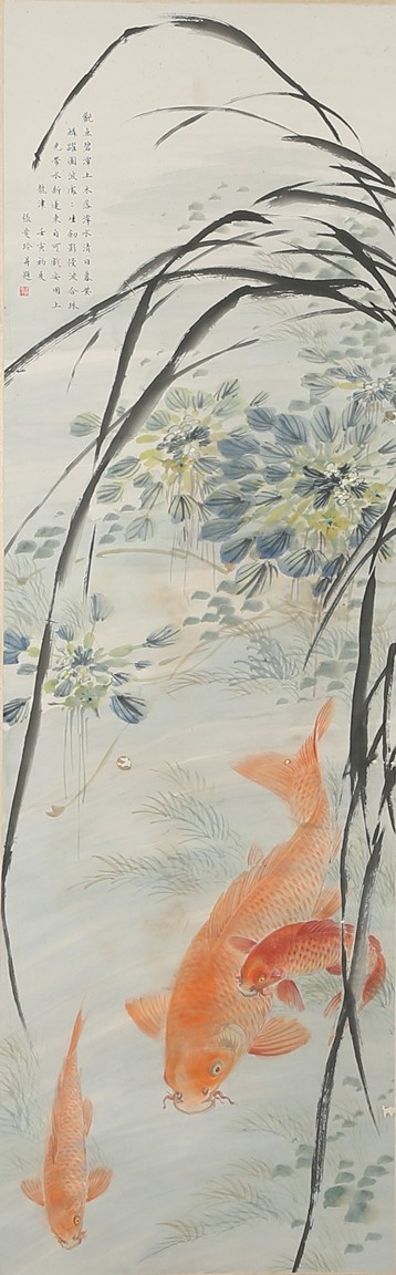 Color and ink on paper. Fish. Hanging scrolling. Inscribed and signed Zhang Ailing, with one seal of the artist.