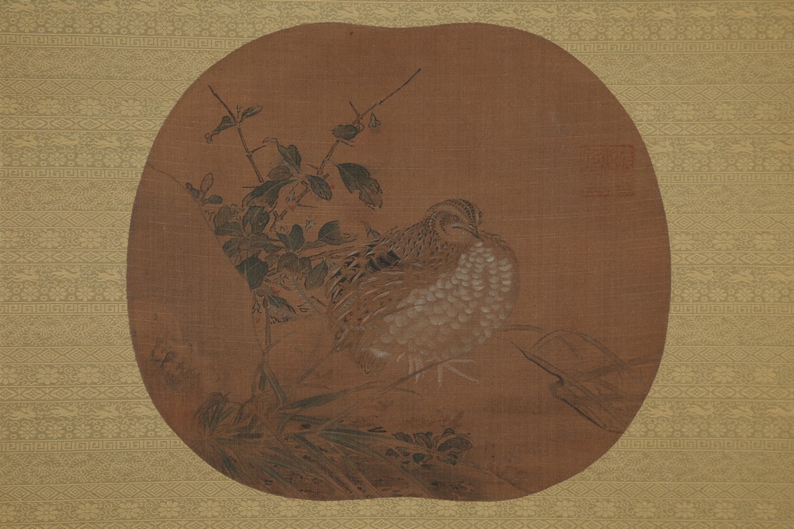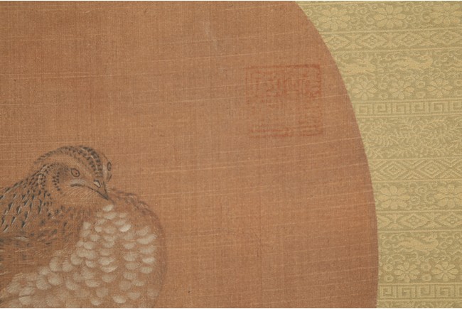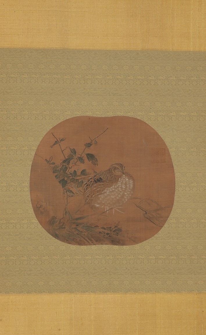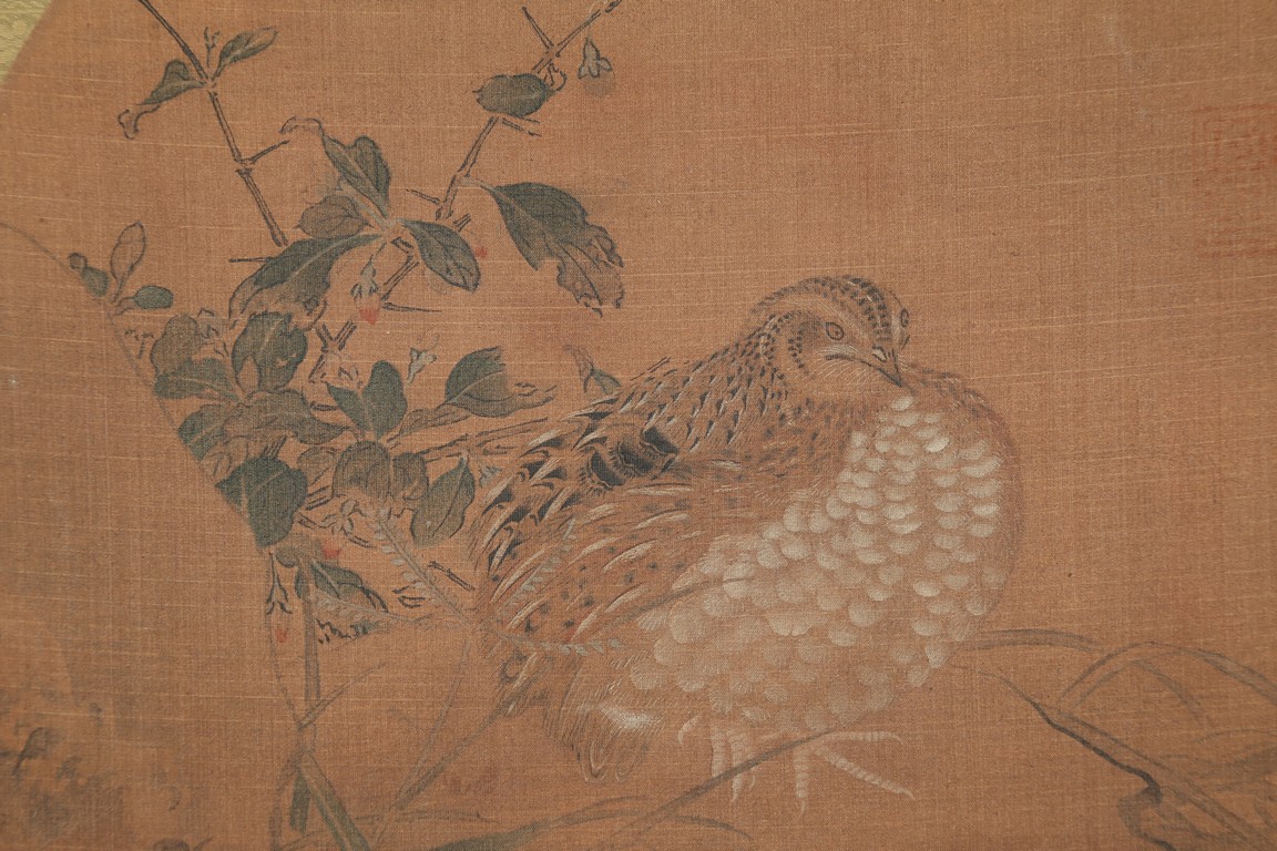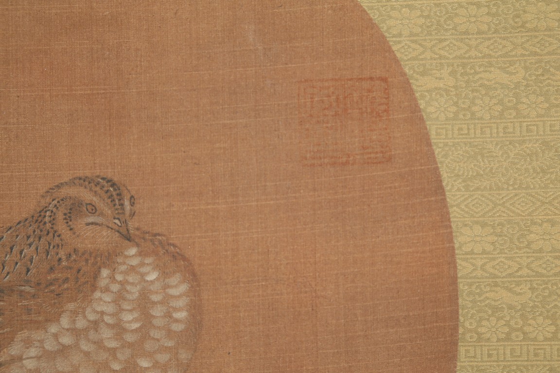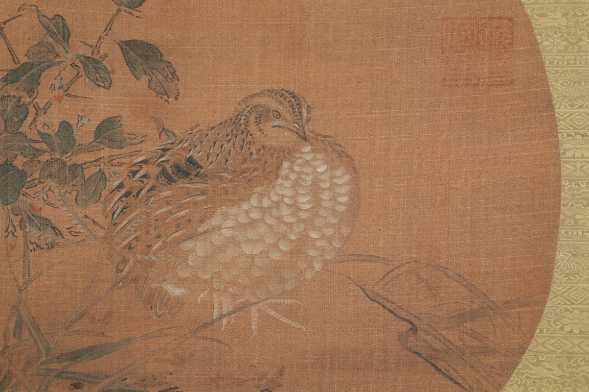 Color and ink on silk. Quail. Hanging scrolling, unsigned and with seal of the artist. Attributed to Li Anzhong, accompanied by original Japanese wood box.
