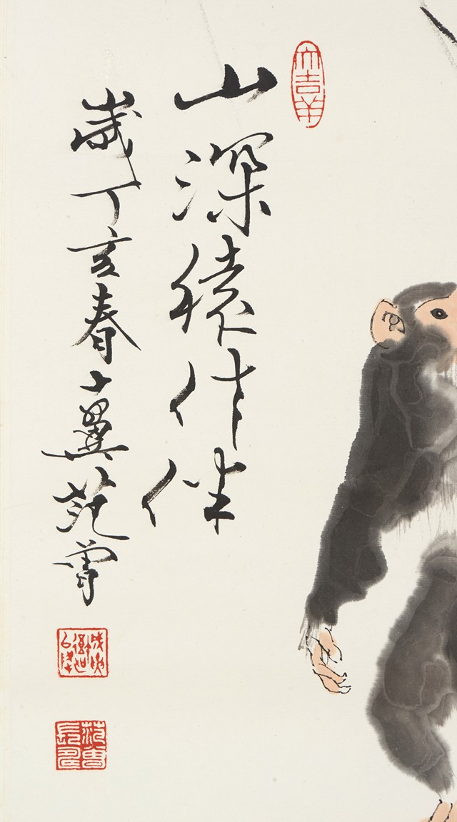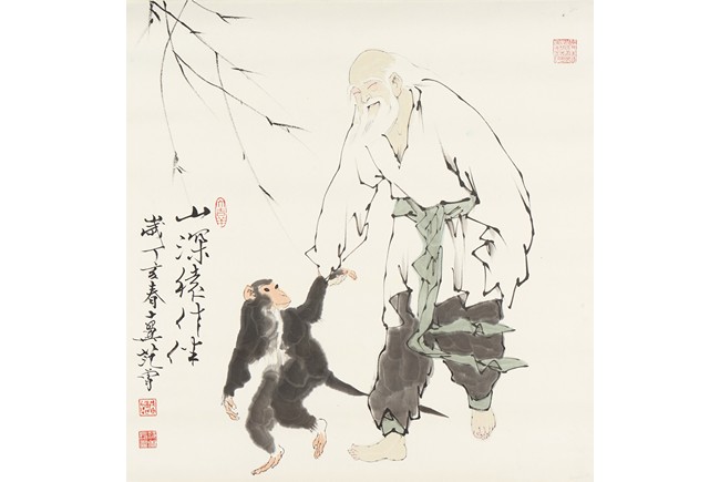 FAN ZENG: INK AND COLOR ON PAPER PAINTING 范曾 山深猿作伴 紙本 鏡心