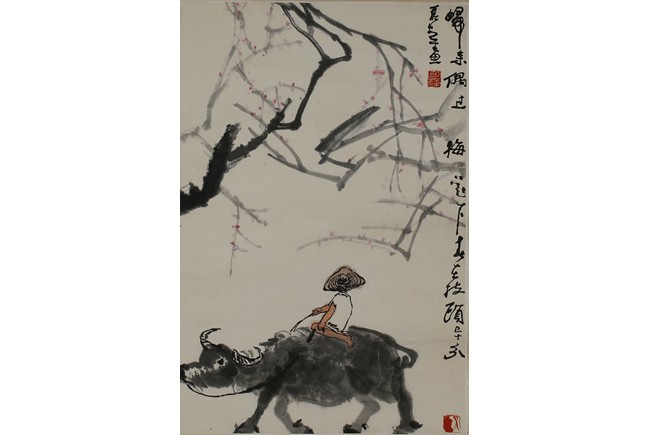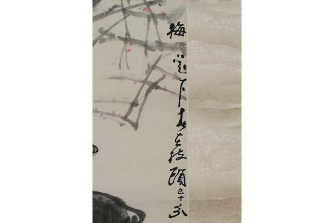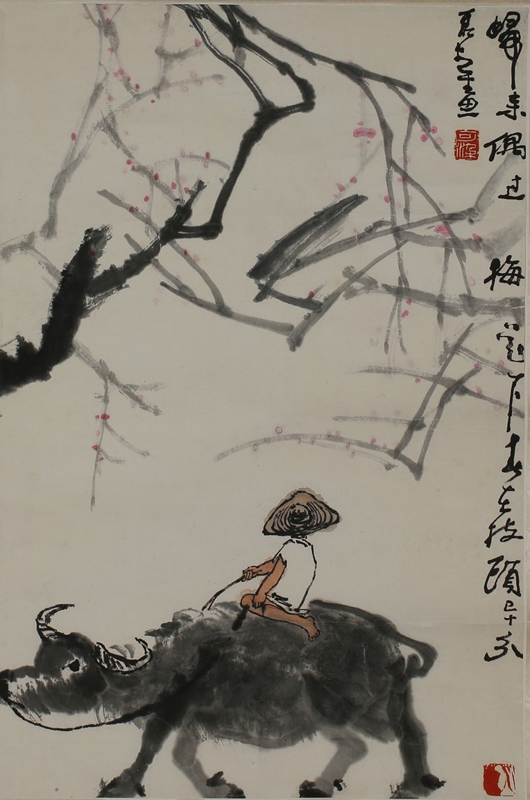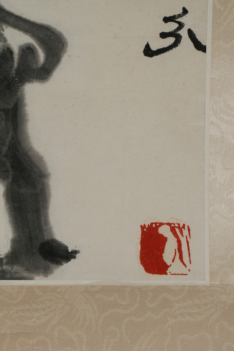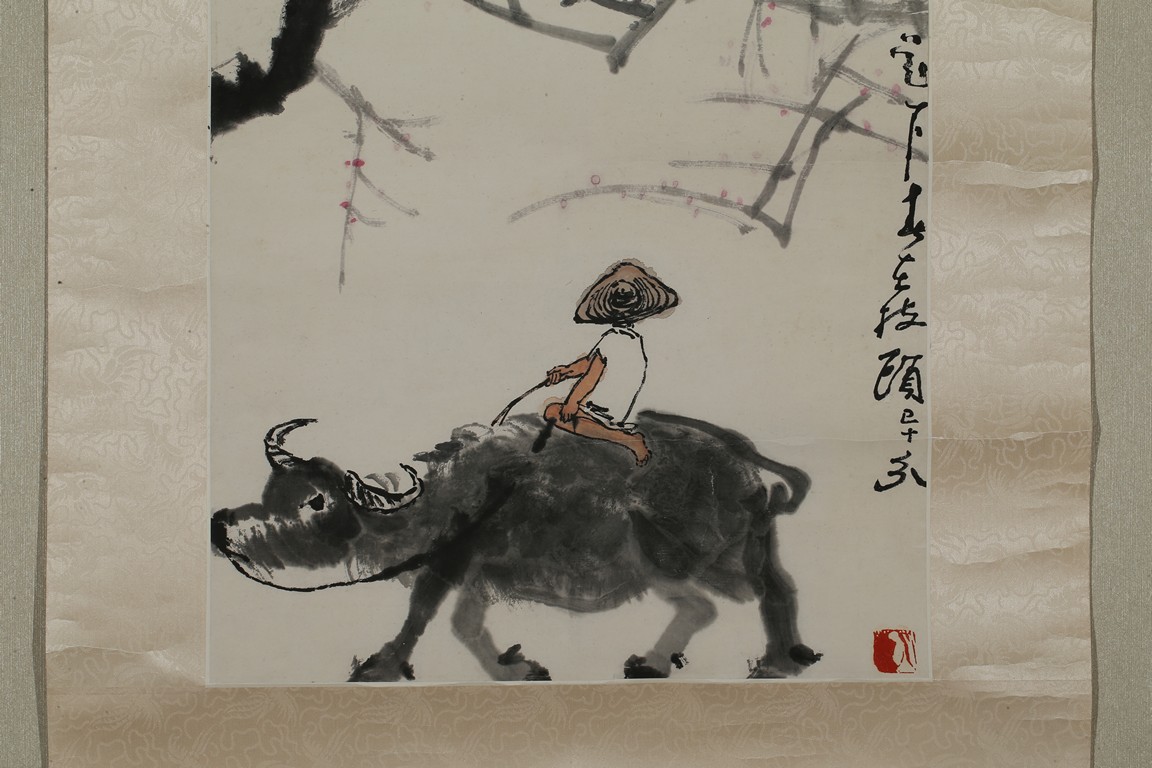 Color and ink on paper. Buffalo. Hanging scrolling. Inscribed and signed with two seals of the artist.