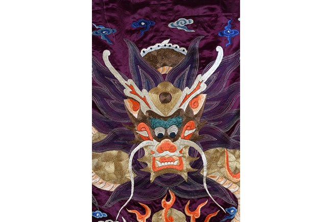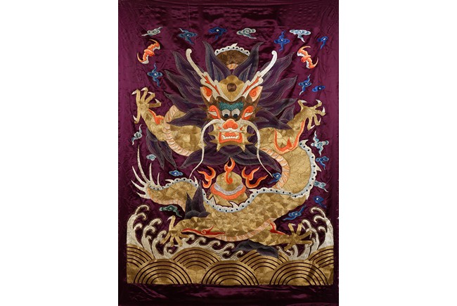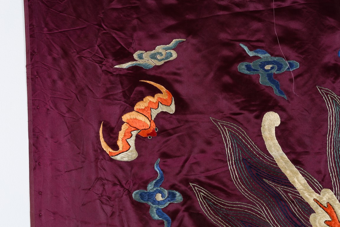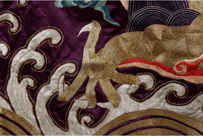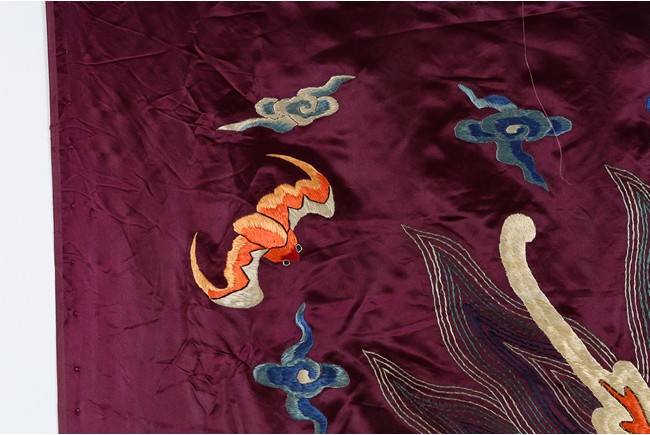 The large panel with a single five clawed dragon in gold thread amidst clouds and above waves, to the sides with a pairs of bat, all reserved on purple ground.