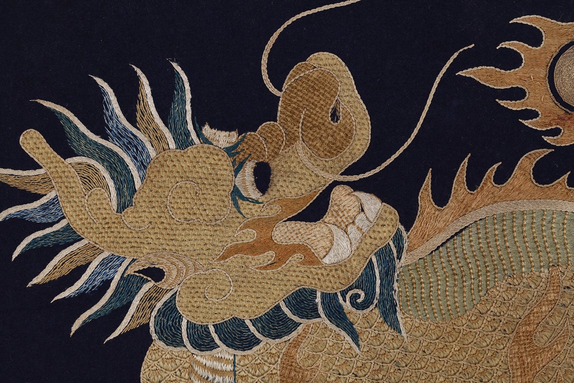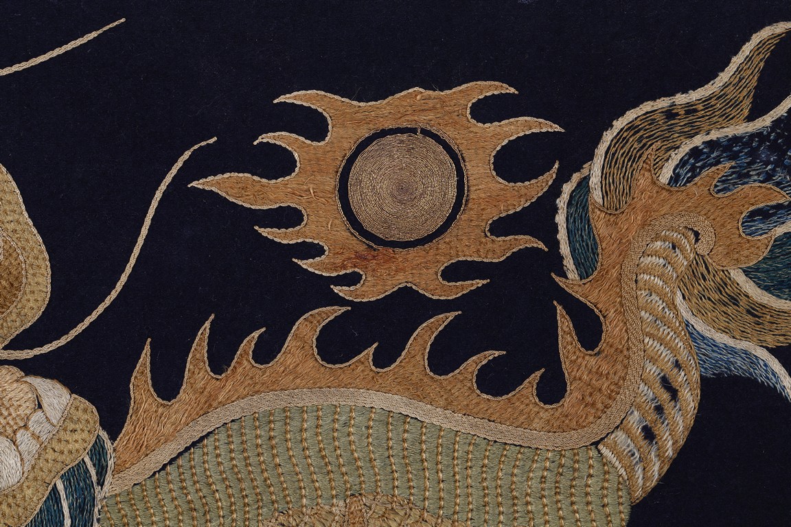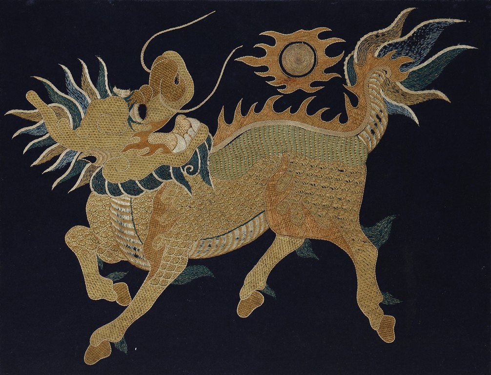 Finely embroidered with a qilin standing foursquare with head turned back watching a flaming pearl, all reserved on blue ground.